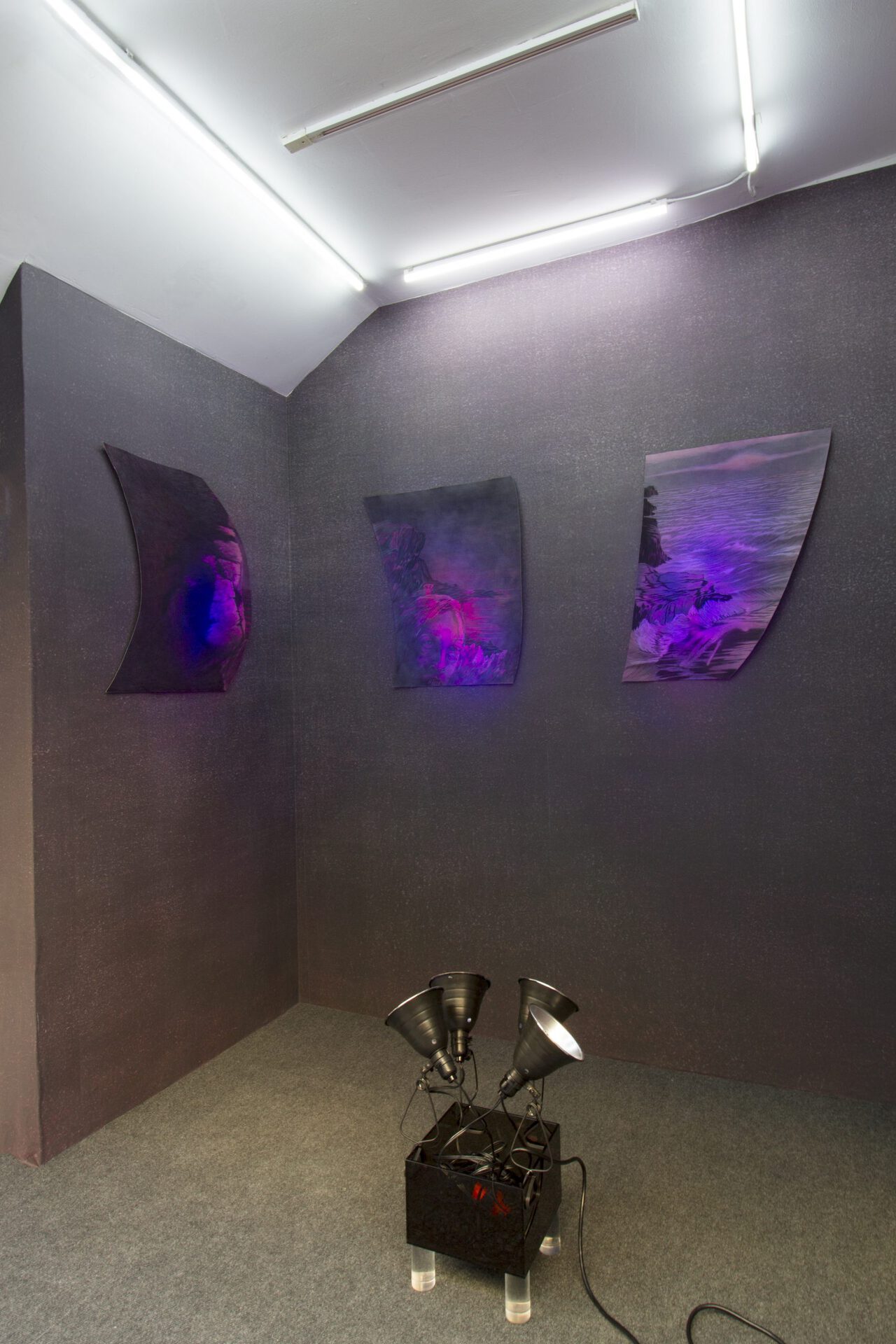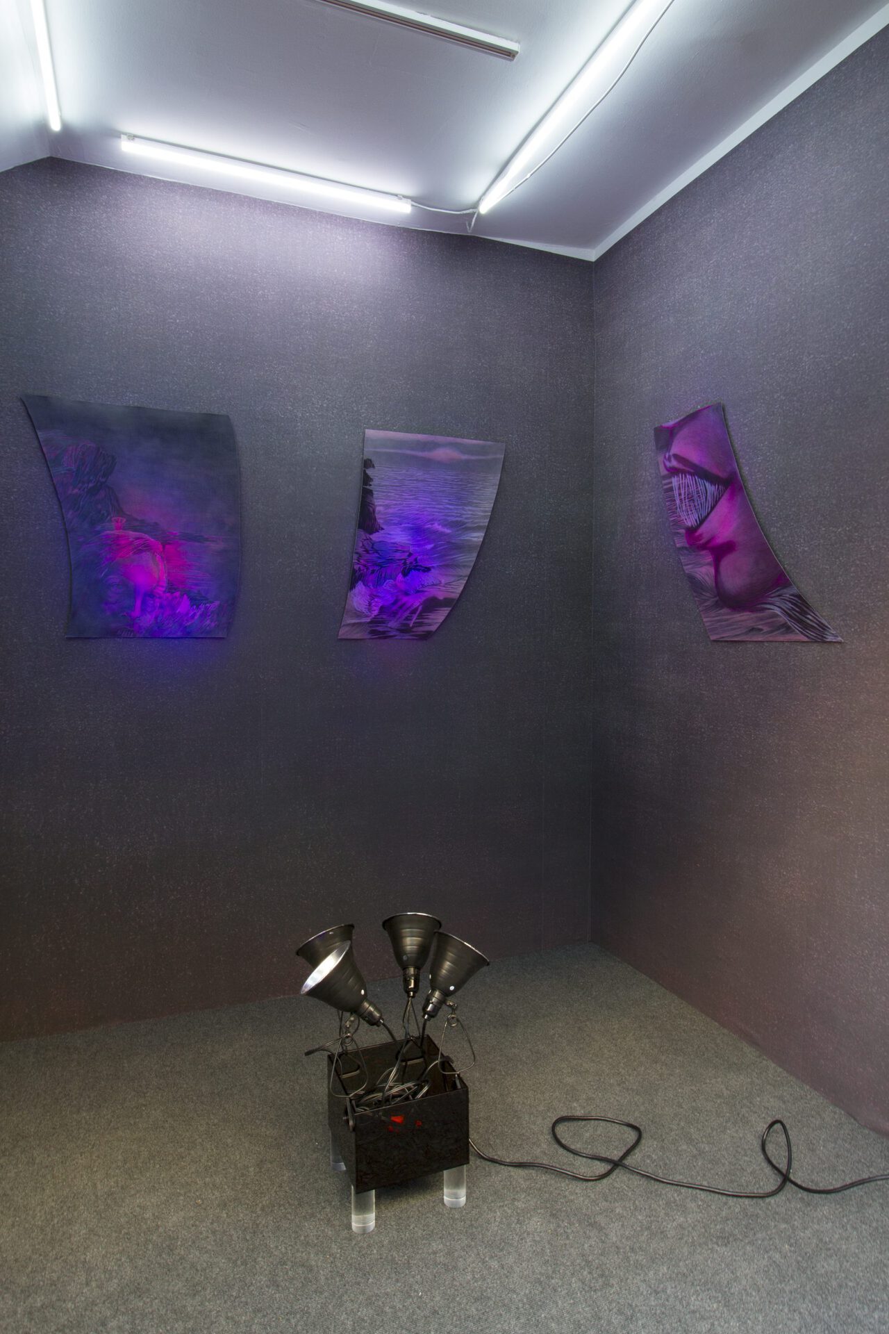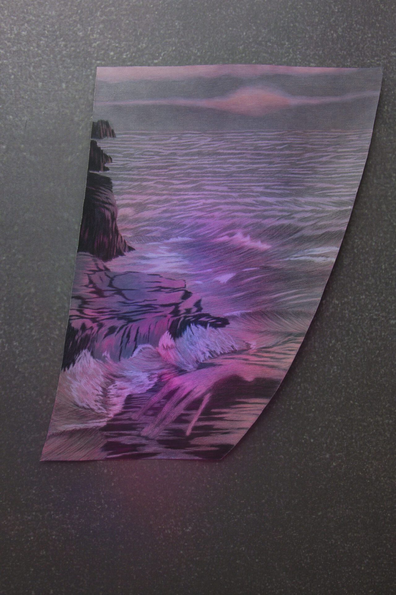 Tess Bilhartz’s solo exhibition What on Earth at Super Dutchess Gallery depicts an imagined mermaid sighting. Images of this sometimes monstrous, sometimes vulnerable figure flicker into focus and dissolve back into the water. The haze and heave of the ocean distort our view. Mermaids are the sirens who sing sailors to their deaths; they are red-haired Ariel in a clamshell bikini; they have also eaten humans alive with shark-like rows of long, pointy teeth. They have been known to evaporate into seafoam when their love for a human is unrequited. Glimpsed only in legends or by sailors on the verge of insanity and hallucination, mermaids are, in other words, the opposite of solid. How can a mermaid, with all her slippery shifting, be depicted?