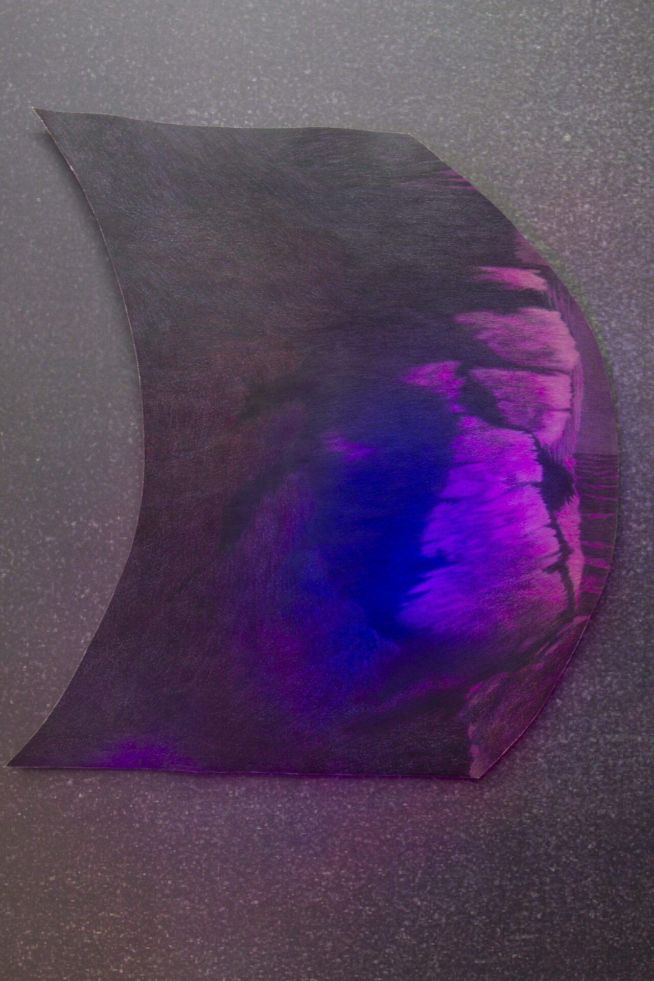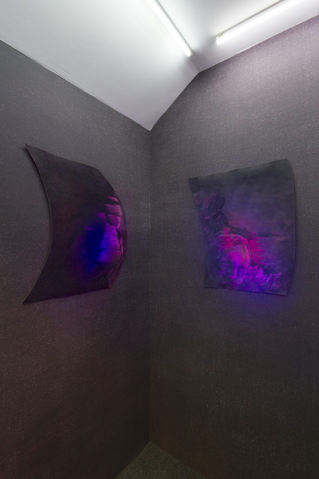 Bilhartz uses stories that draw on the mythic, literary, cultural, and personal to generate the outline of imagery that she can then crop, distort, tear apart, or stitch back together. Her practice consists of a dialog between the structure of genre within narrative and the materiality of painting and drawing as an agent of dissonance and emotion. Bilhartz blends American landscape painting with fantasy; she harnesses drama, exaggeration, and a hint of horror. The artist utilizes the constructed focus of montage in the intentionally shaped sheets of watercolor paper to evoke singular moments which encourage the viewer to piece together a larger narrative. By literally distorting the format of the page, the events depicted become conspicuously altered. Figures direct the viewer’s attention towards what they wish to be seen, and thus also what they wish to remain hidden. The wall and floor bleed together as a single sensory experience, enhancing this effect.