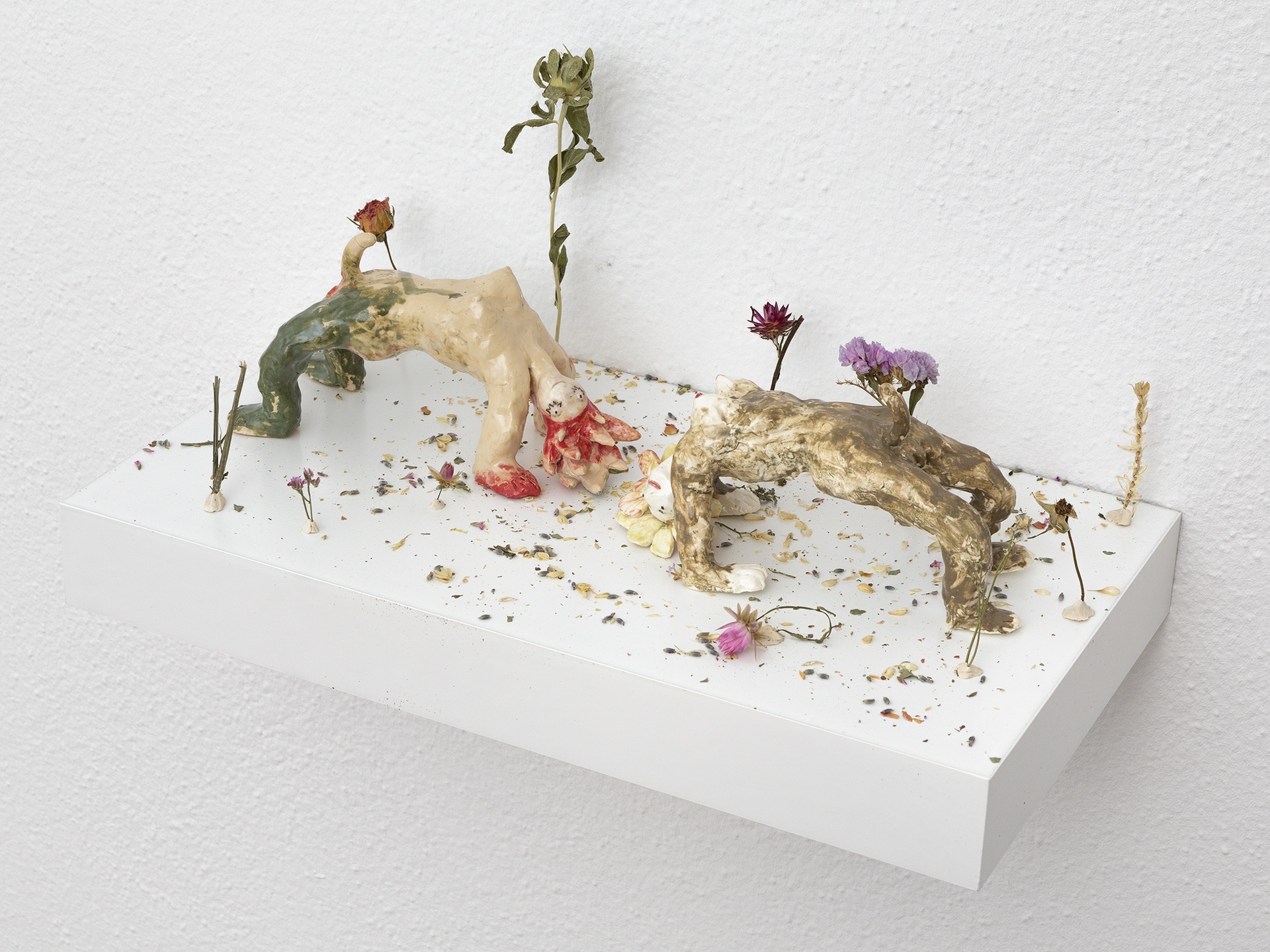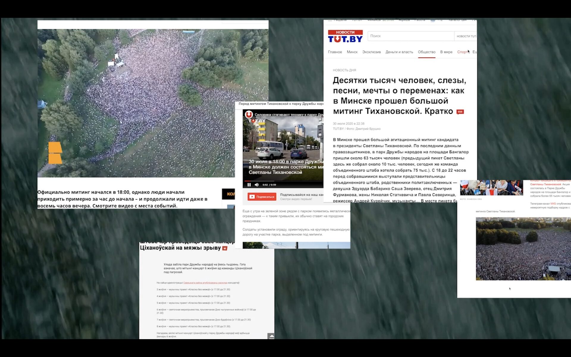 The work by Uladzimir Hramovich’s New Wind is built from the social imagination around the symbols of workers' struggles. Sergey Shabohin's video Mandrake Gartens looks at similarities between two synchronic movements of bodily resistance: the rave parties in Hasenheide park in Berlin during the first world lockdown and the first demonstrations in Minsk. Ala Savashevich’s Two Portret questions the ambivalence of displacement between feeling welcome and hopeless. Olia Sosnovskaya’s Incredibly relaxing meditation music investigates exhaustion as a contemporary practice referring to bodily energies, dynamics of the affect, the political dimension of stillness. Andrey Anro’s painting The Little Soldier shows the invisible faces of the male young figure of dictatorship embedded in the power machinery while Vasilisa Palianina’s Forest faces are inspired by the non-binary character of nature.