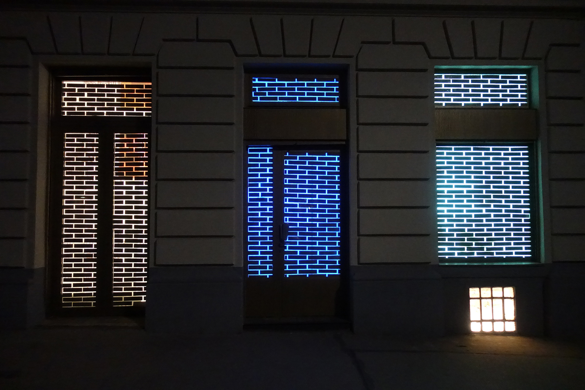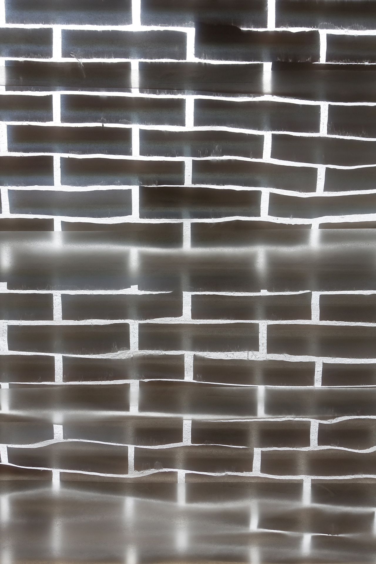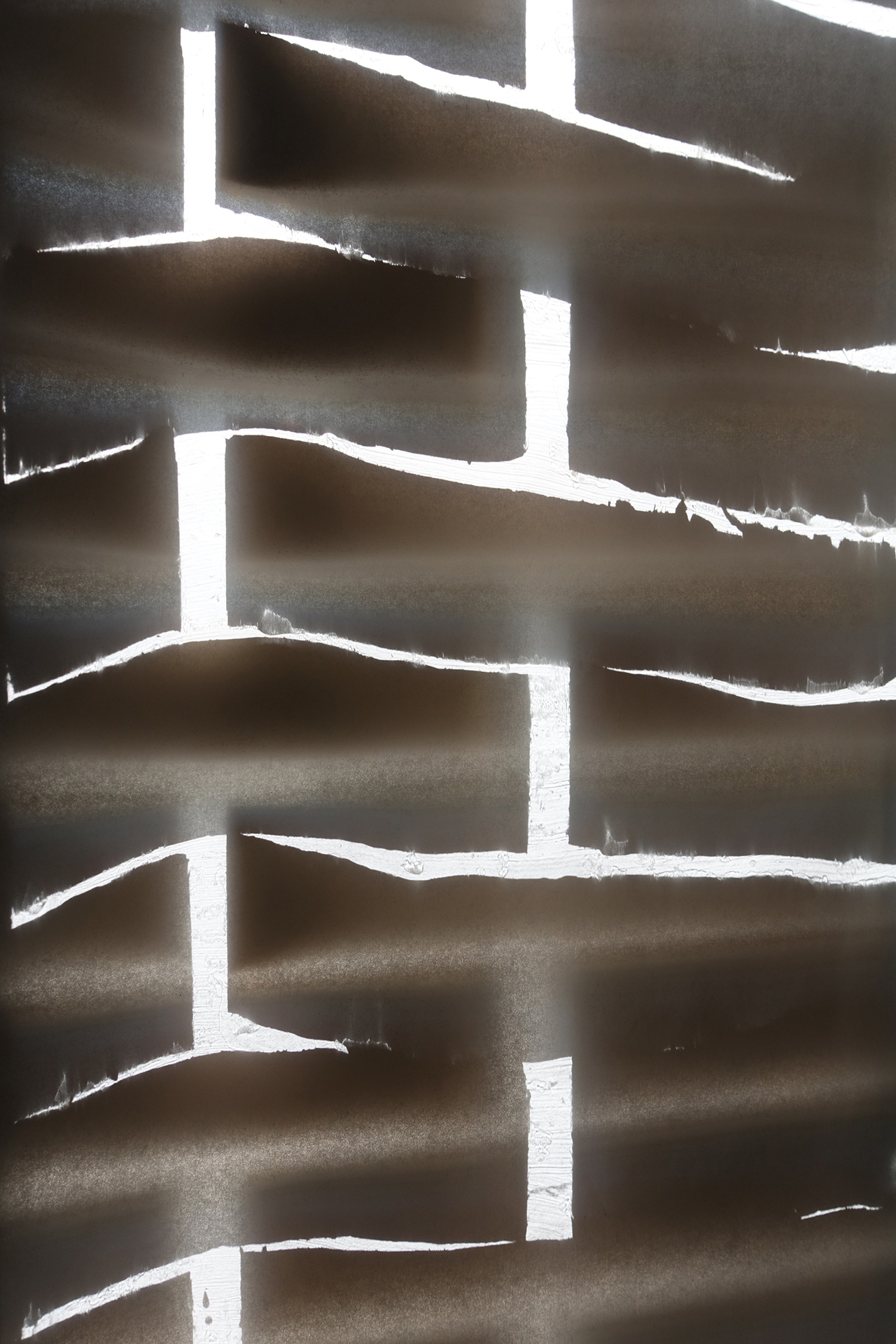 raúl i. lima made a cardboard brickwork on our windows, a resolute one — a display wall,