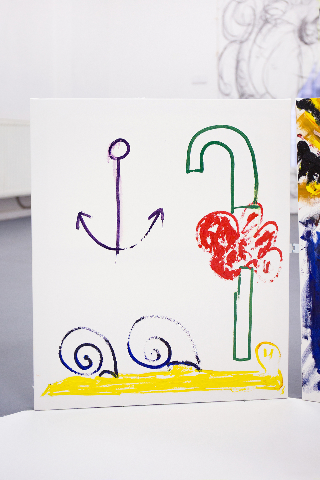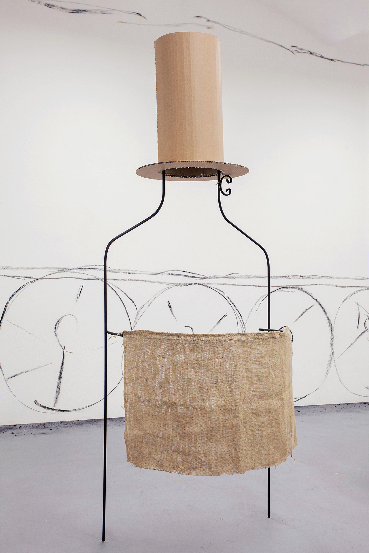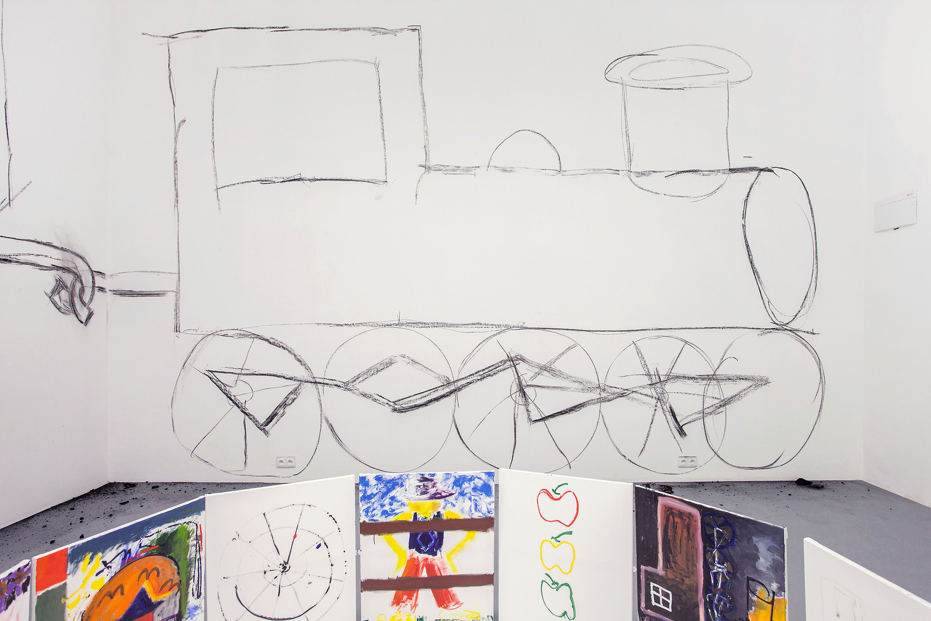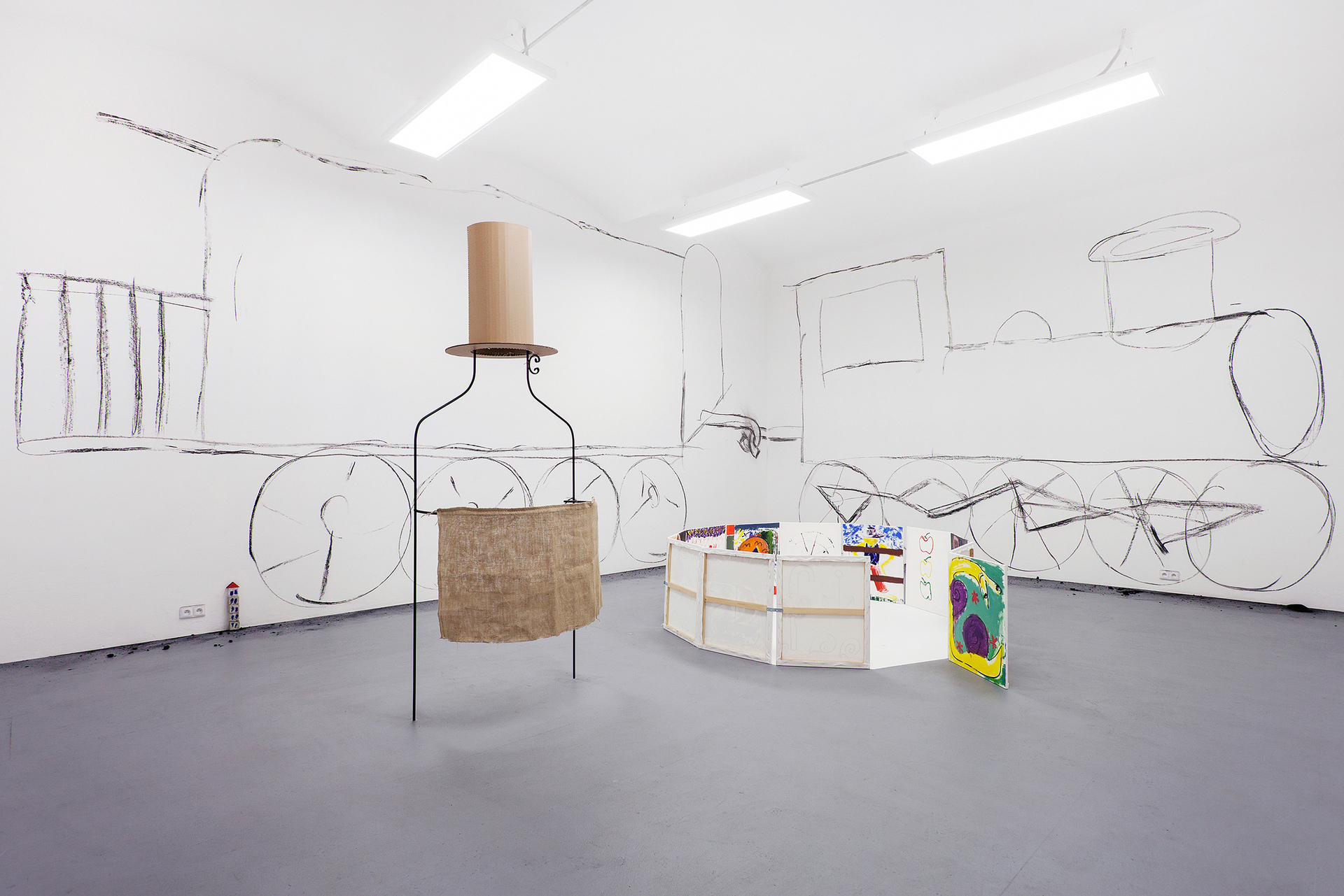 We can feel a similar state of weightlessness from the projects of Jiří Pitrmuc, who, in his current exhibition, in addition to slapstick comedies, reveals another inspiration – the world of a specific logic of the artful language of child drawings. The artist recycles the topic of silent films stuck in the roots of modern culture, to divest this visual language full of joy and carefreeness, linked with a number of typical artefacts, of the tragedy of human presence, and he introduces it in his paintings and installations as a fresh game room of archetypes of the avant-garde. The actors have vanished, but there remains a visual game room full of unexpected situations, intersections and slapsticks, in which the lead role goes to the requisites associating the poetic world of silent films. The artist here is that magician with a high hat, not pulling doves or rabbits out of it, but his paintings.