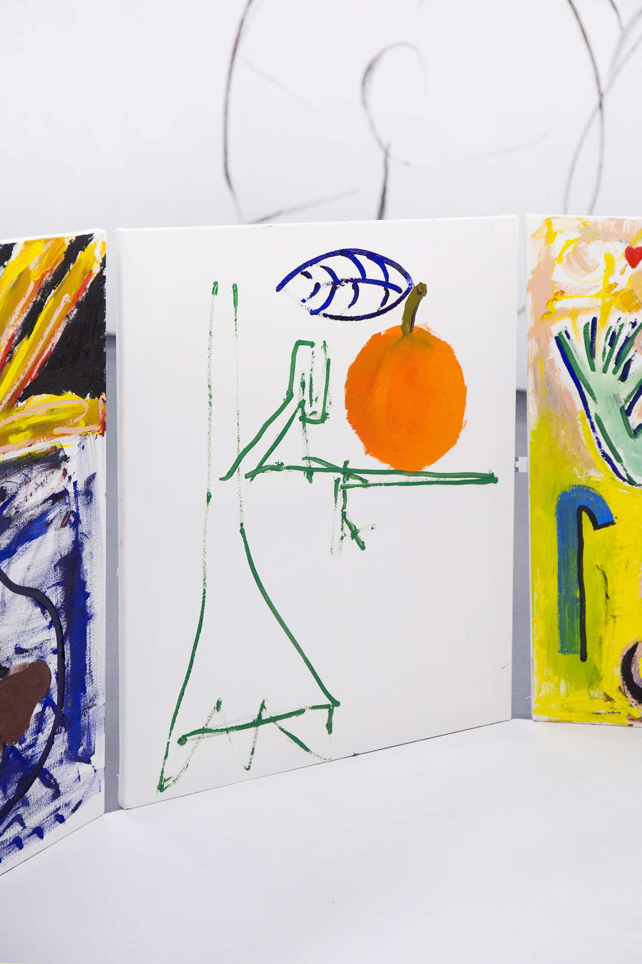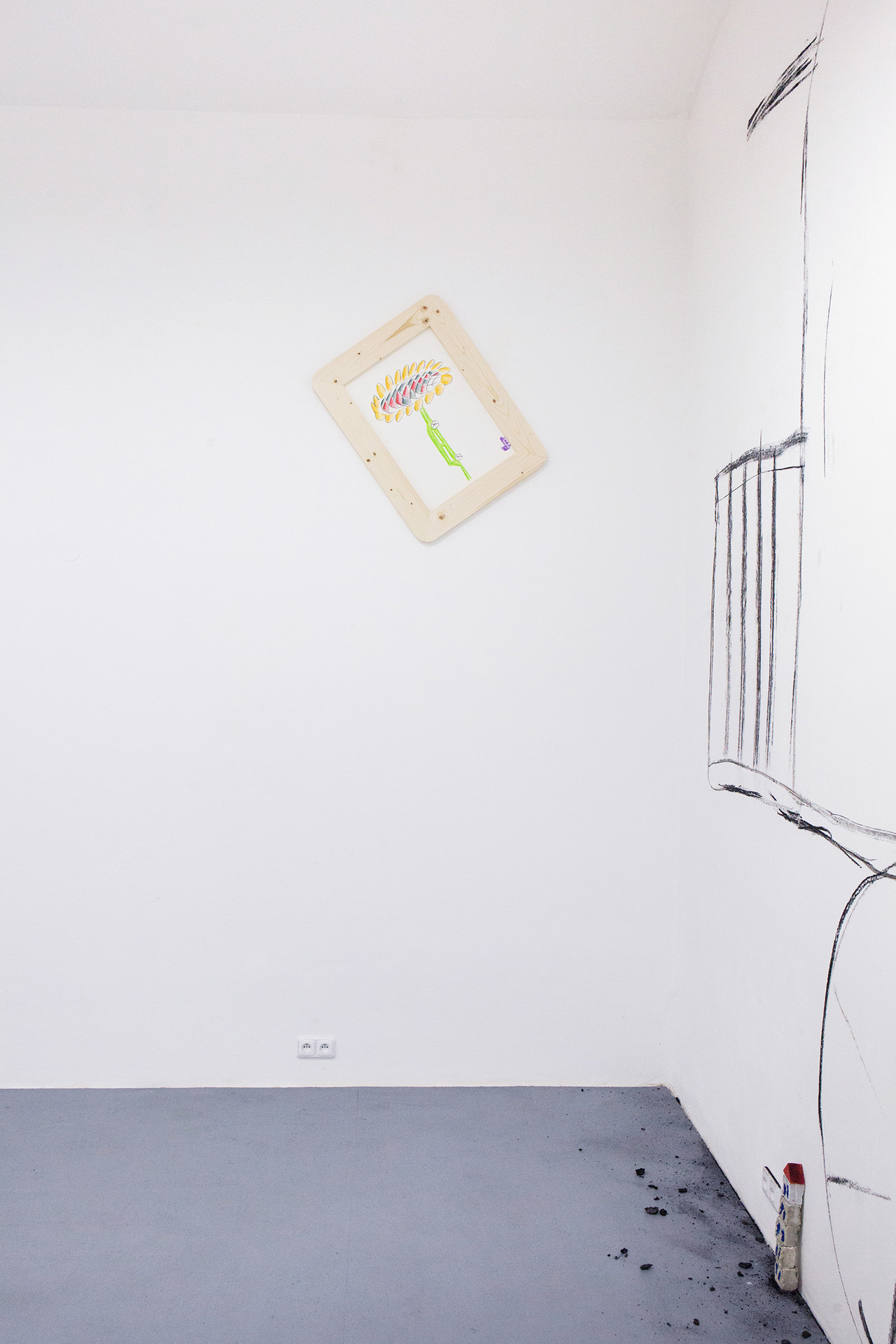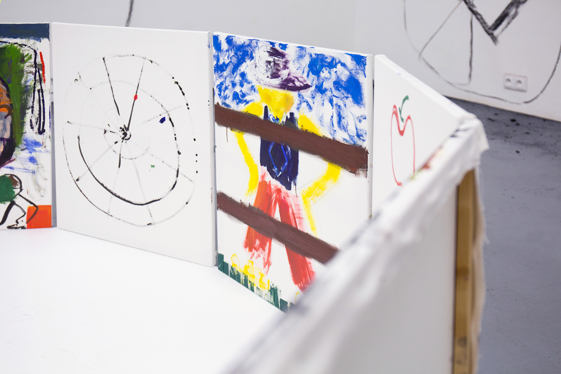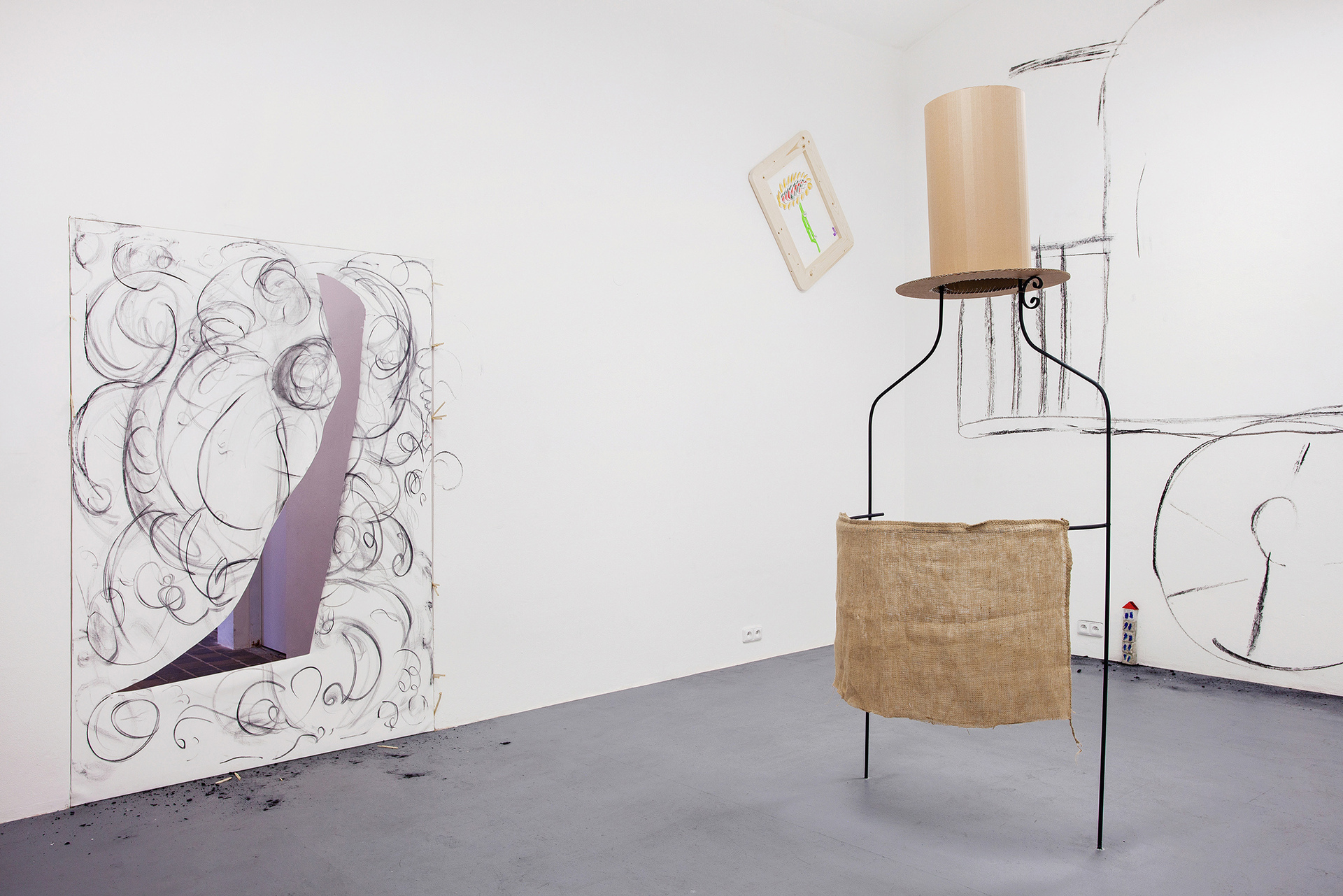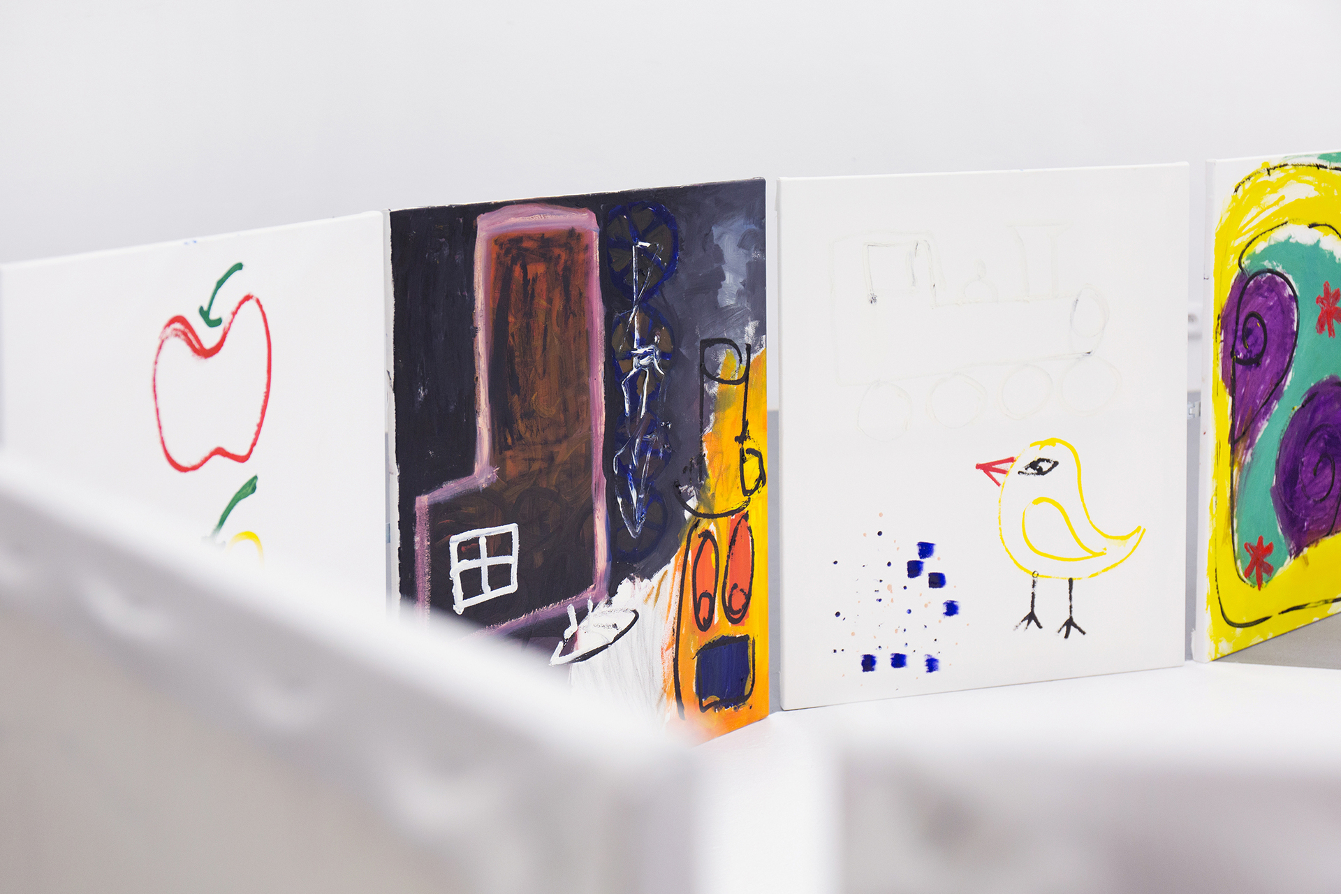 We can feel a similar state of weightlessness from the projects of Jiří Pitrmuc, who, in his current exhibition, in addition to slapstick comedies, reveals another inspiration – the world of a specific logic of the artful language of child drawings. The artist recycles the topic of silent films stuck in the roots of modern culture, to divest this visual language full of joy and carefreeness, linked with a number of typical artefacts, of the tragedy of human presence, and he introduces it in his paintings and installations as a fresh game room of archetypes of the avant-garde. The actors have vanished, but there remains a visual game room full of unexpected situations, intersections and slapsticks, in which the lead role goes to the requisites associating the poetic world of silent films. The artist here is that magician with a high hat, not pulling doves or rabbits out of it, but his paintings.