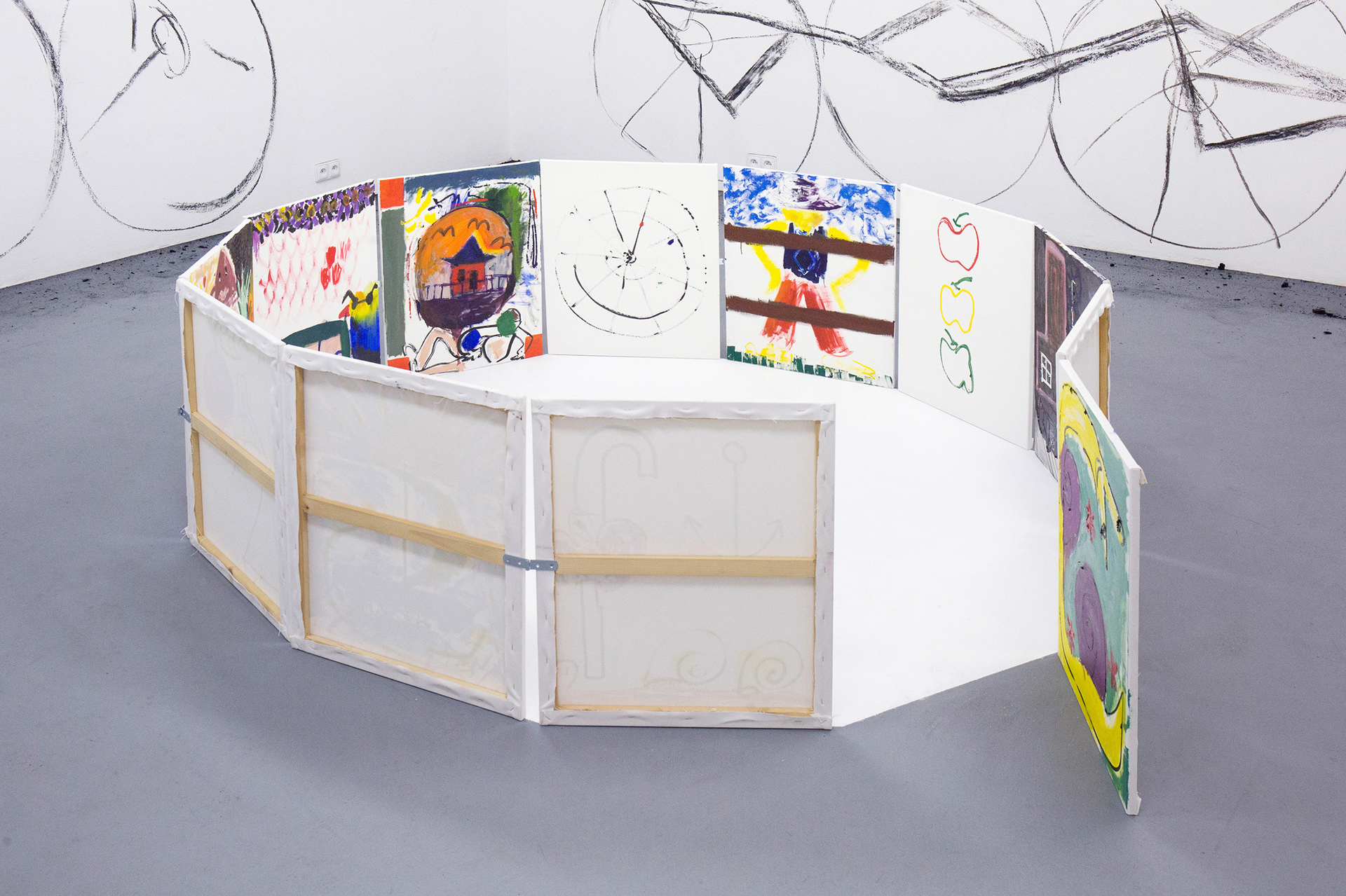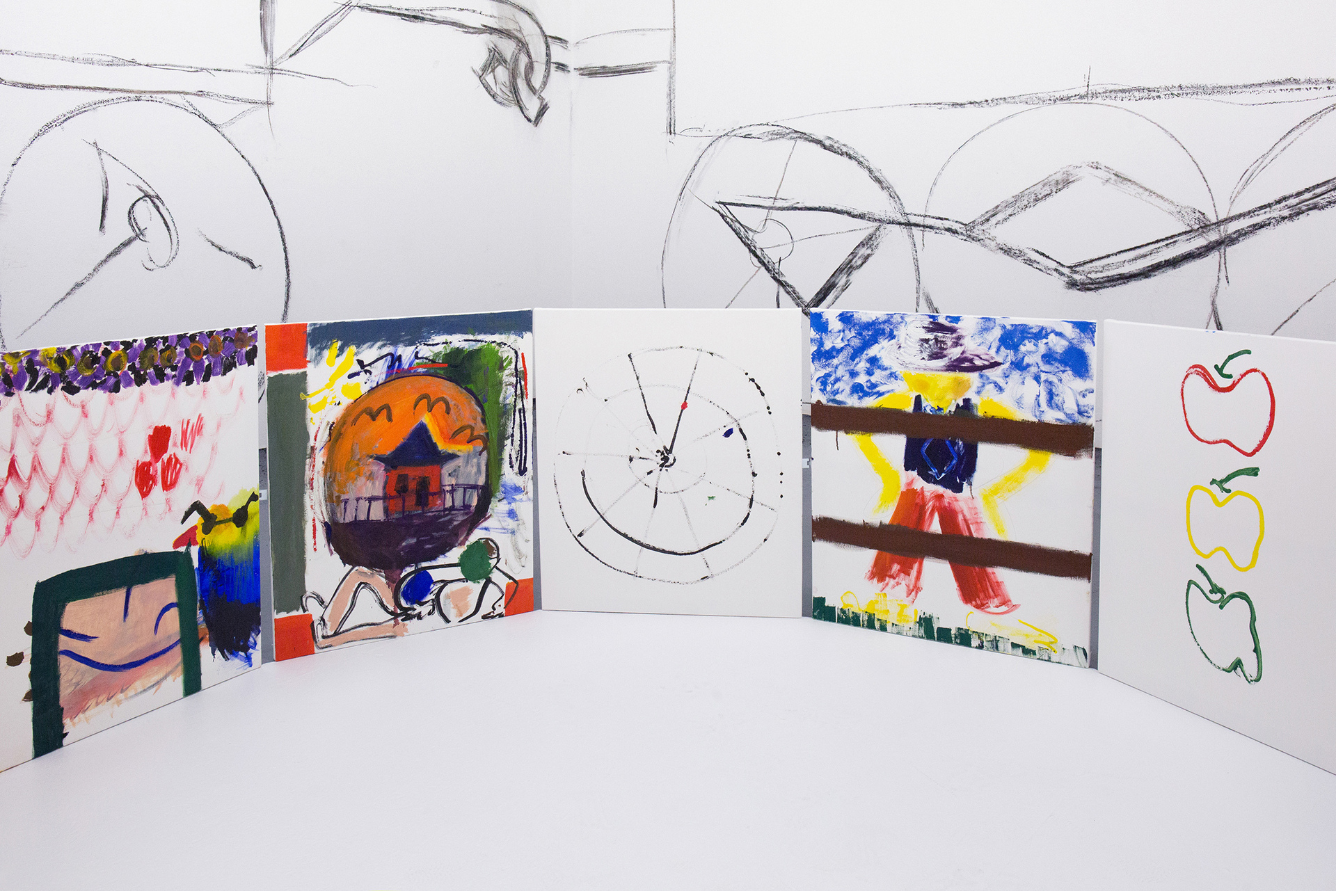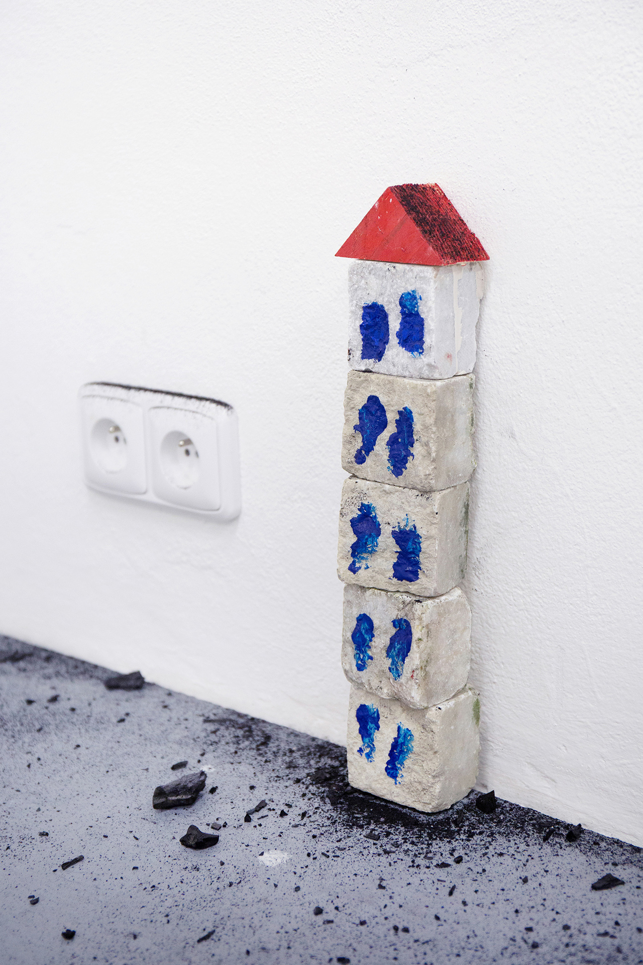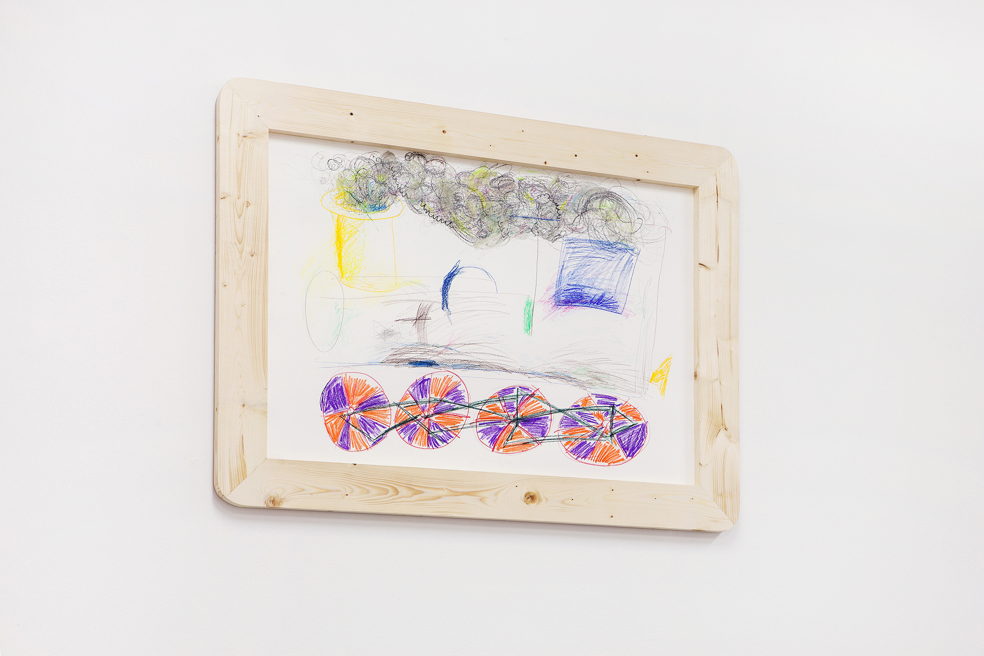 We can feel a similar state of weightlessness from the projects of Jiří Pitrmuc, who, in his current exhibition, in addition to slapstick comedies, reveals another inspiration – the world of a specific logic of the artful language of child drawings. The artist recycles the topic of silent films stuck in the roots of modern culture, to divest this visual language full of joy and carefreeness, linked with a number of typical artefacts, of the tragedy of human presence, and he introduces it in his paintings and installations as a fresh game room of archetypes of the avant-garde. The actors have vanished, but there remains a visual game room full of unexpected situations, intersections and slapsticks, in which the lead role goes to the requisites associating the poetic world of silent films. The artist here is that magician with a high hat, not pulling doves or rabbits out of it, but his paintings.