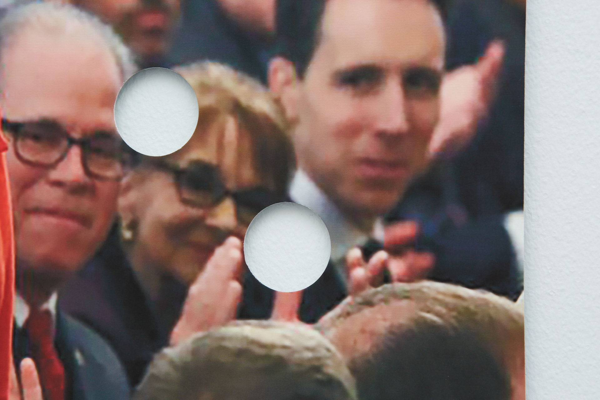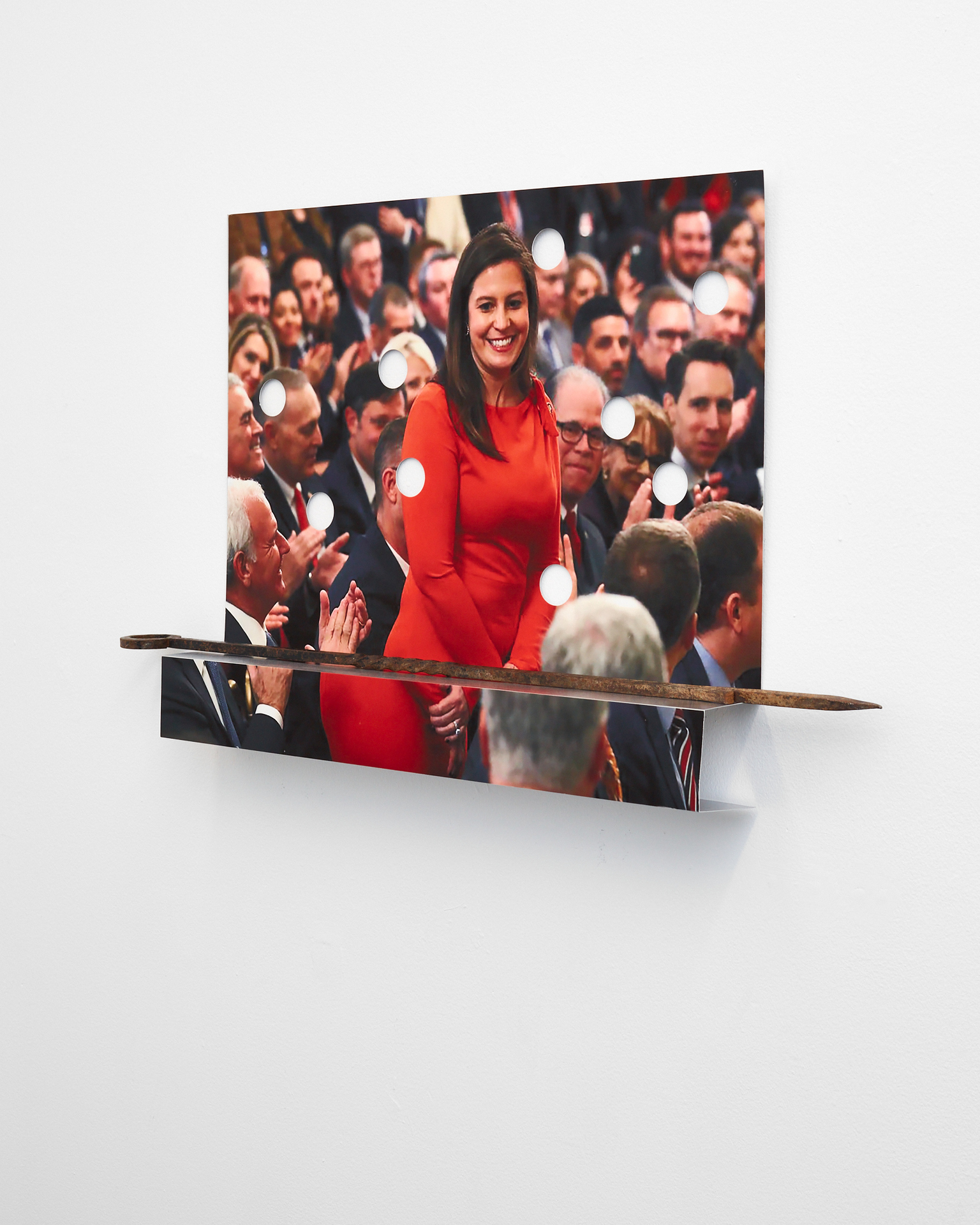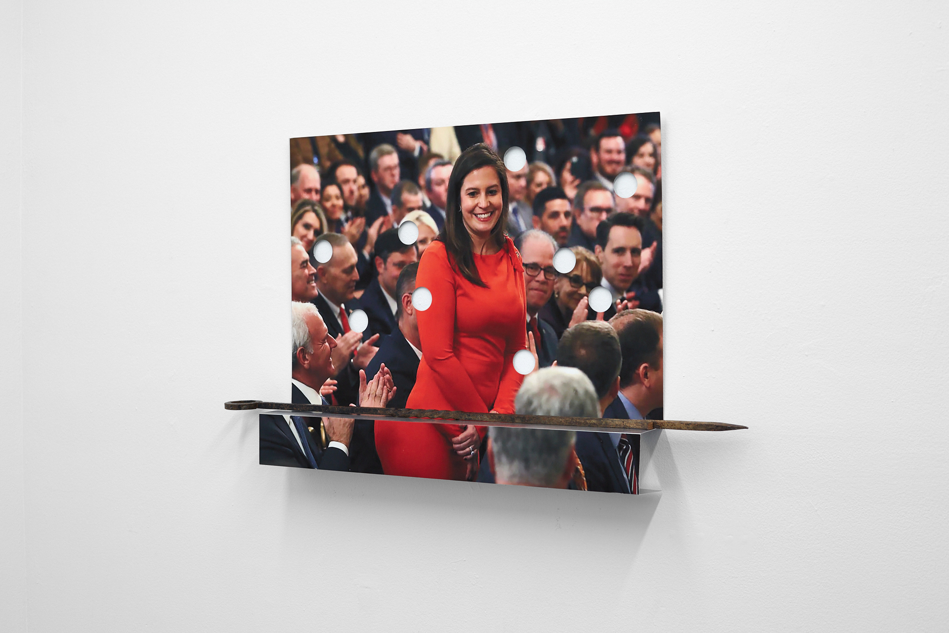 On February 26, 2020, Elise Stefanik, a congresswoman from New York and a member of Donald Trump’s impeachment defense team, received a round of applause while being publicly acknowledged by Trump a day after the US Senate acquitted him on two articles of impeachment. In the image Stefanik stands out in a red dress in a sea of mostly navy or black suits, a newly minted symbol of Trumpism. Stefanik, once lauded for being a millennial moderate, induces both identities through physical signaling that applies splitting based on the viewer.