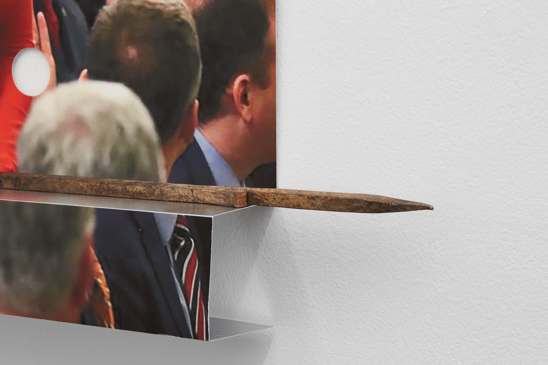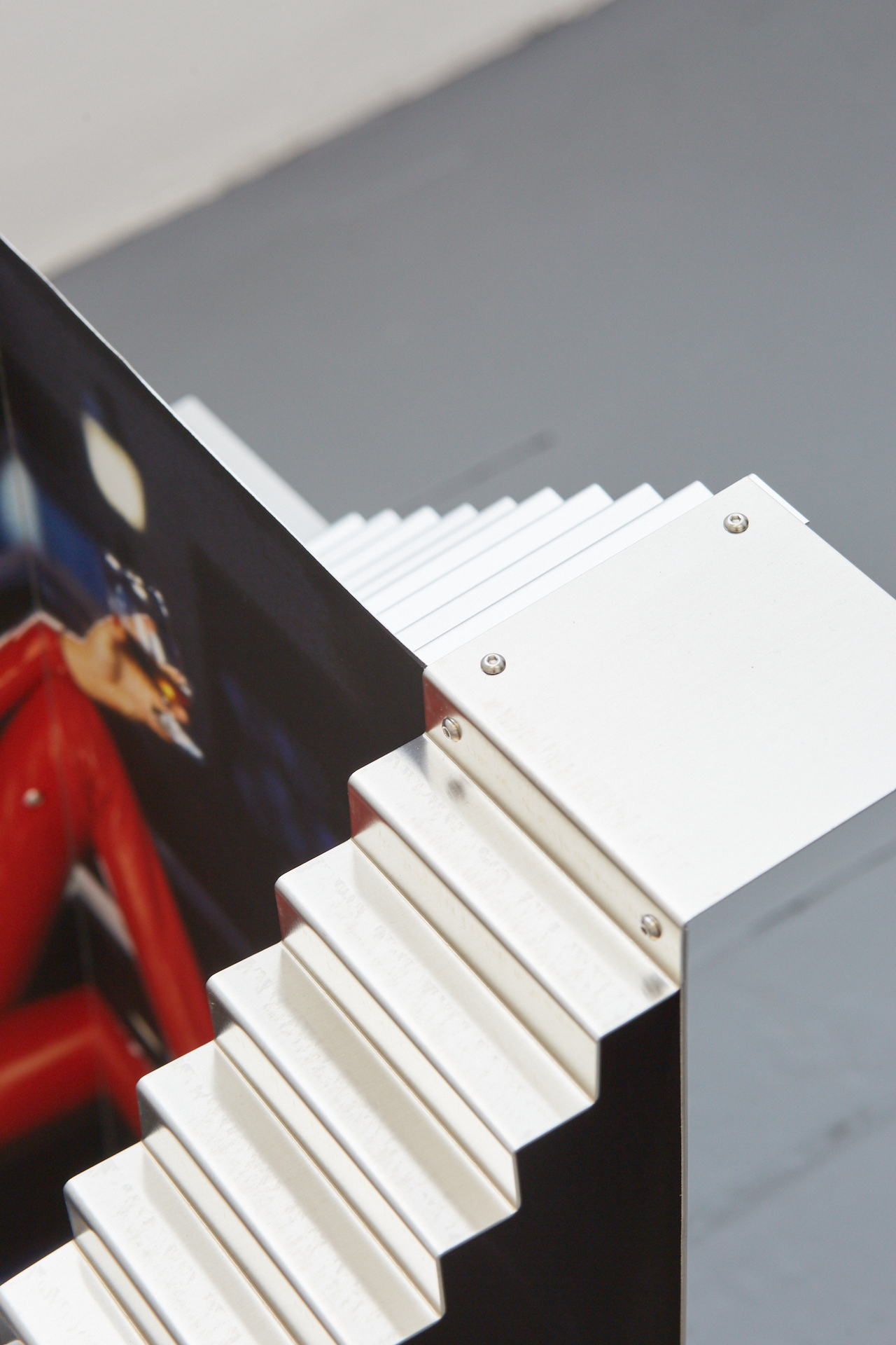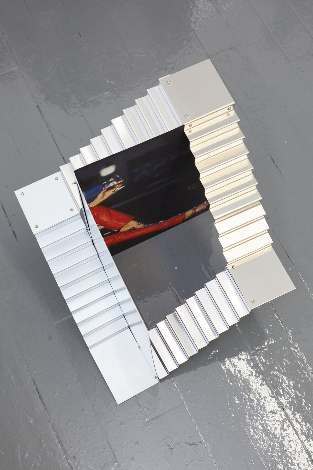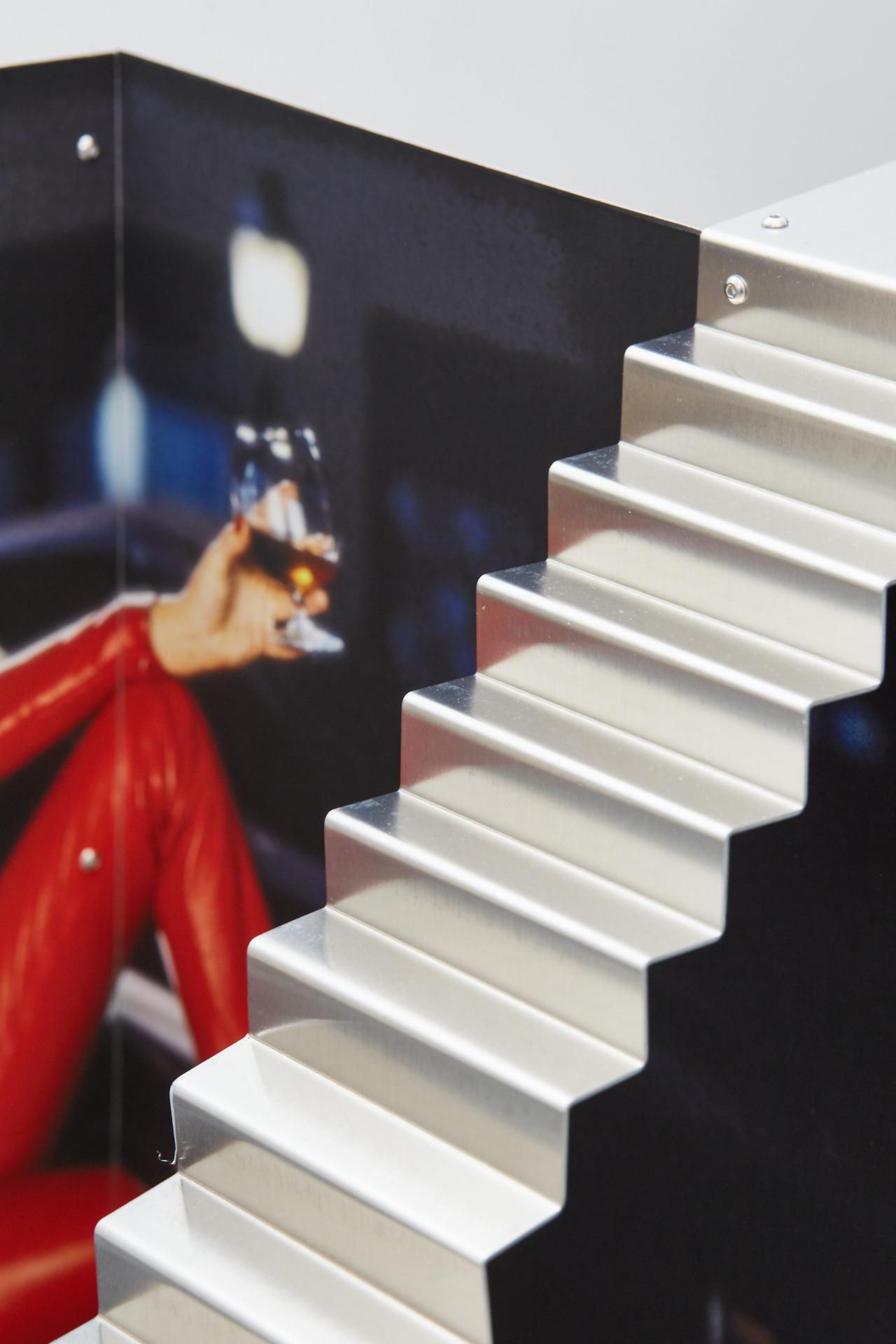 Visualized through a mix of architecture and iconic imagery, the works in Wrecking Ball apply a presupposed value where the stereotypical symbol of each woman acts as a main driver for the images selected by Mackeson. As a literal interpretation of the visual and mental climb these roles provoke, the grouping of ‘women’ and ‘red dress’ become a physical barrier built of immediate, predetermined stereotypes and their worn references materialized in thin aluminum framing.