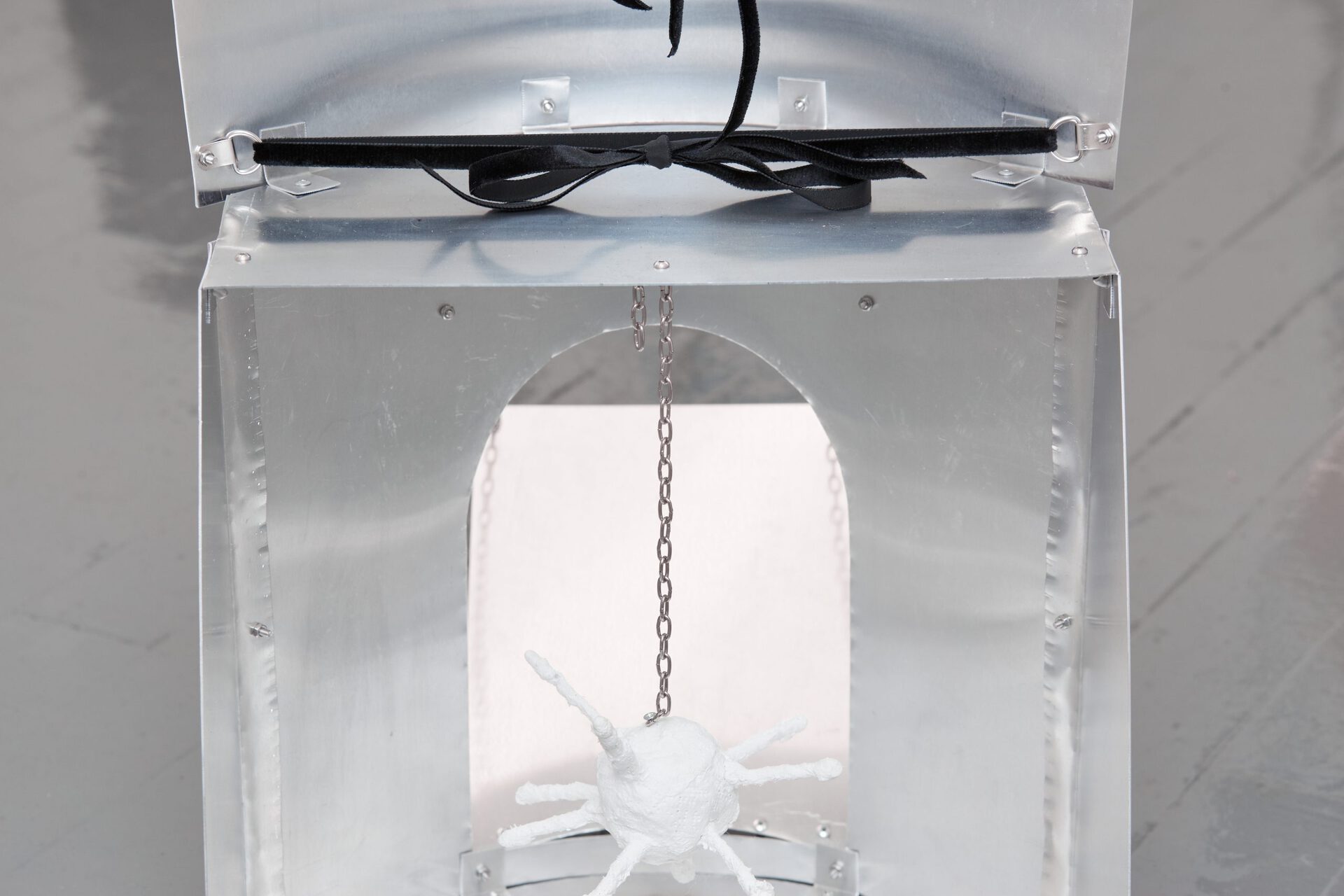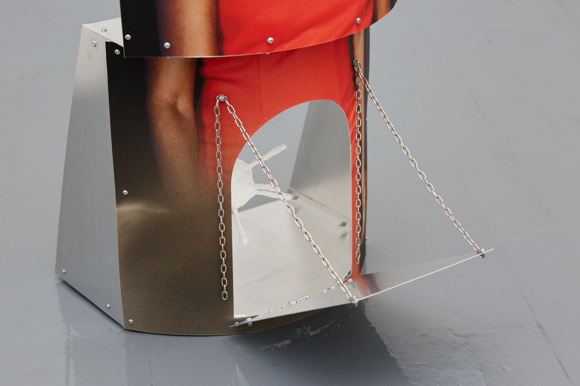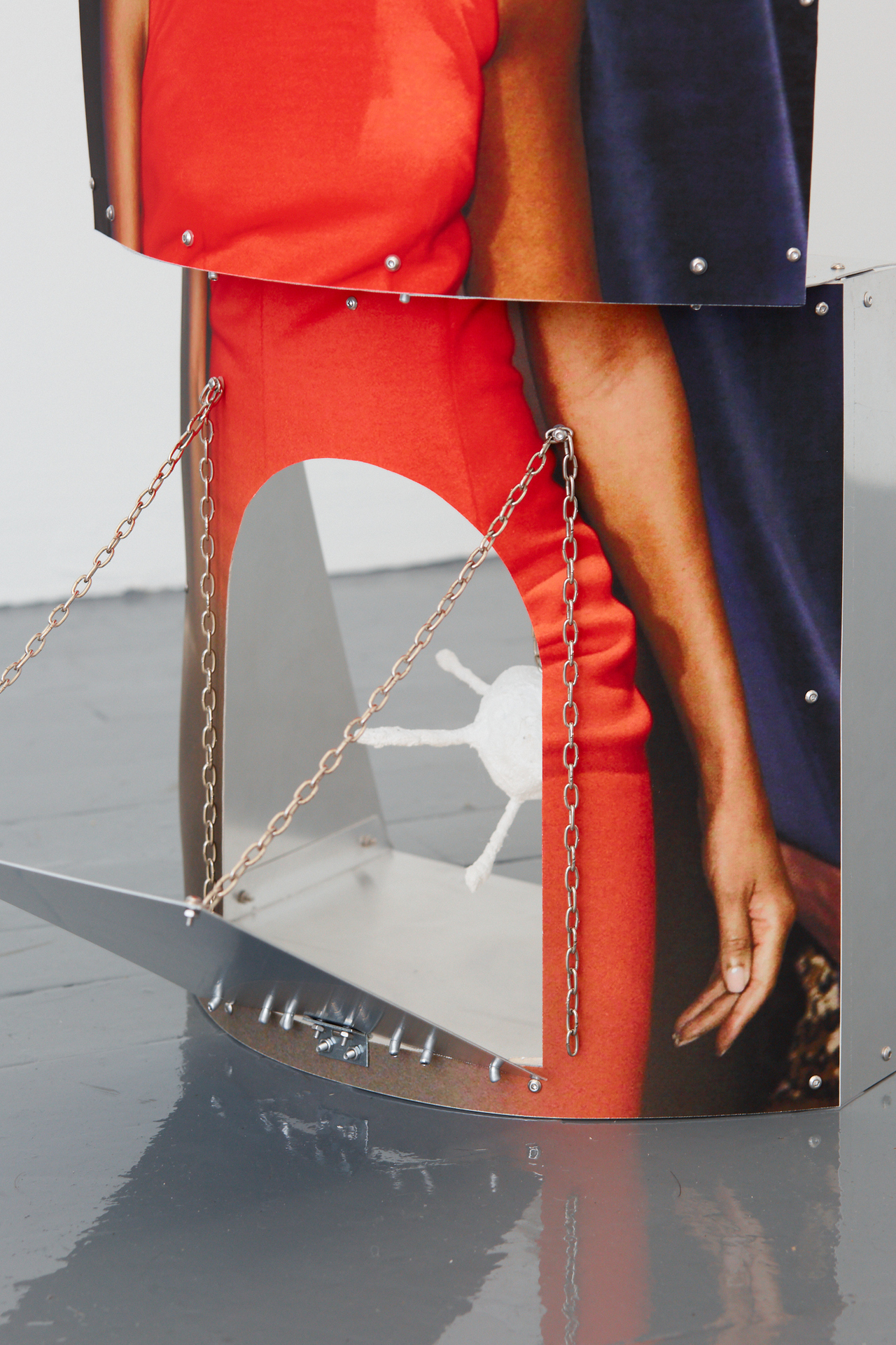 Historically women have faced unique scrutiny through socialized mechanisms coded to dissolve the individual host into concepts that cycle through polarities meant to provoke on demand. The caging definition of a ‘woman in a red dress’, a mythological type, acts as a compulsion to signal visibility through a framework, an element that is activated through the sculptural works.