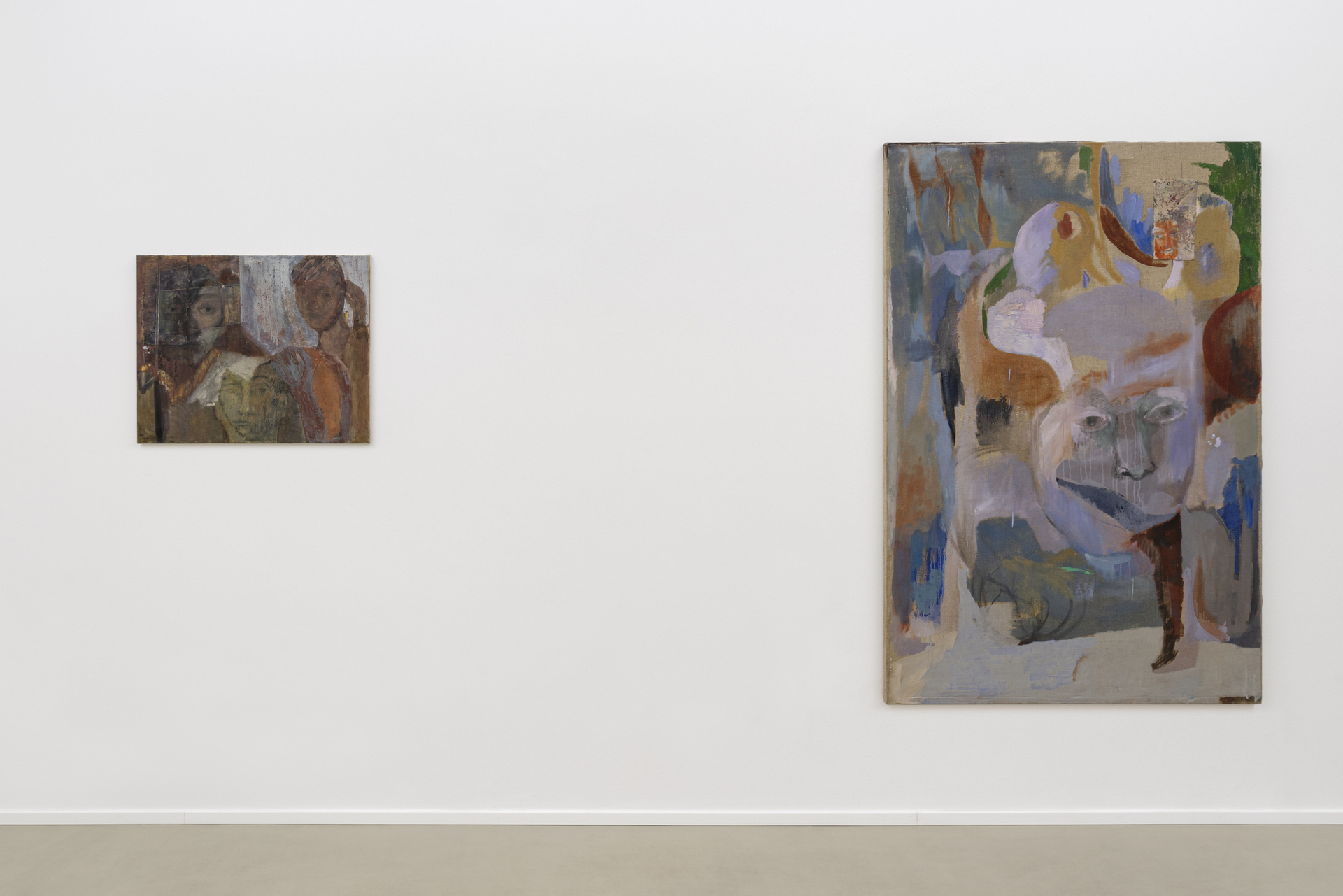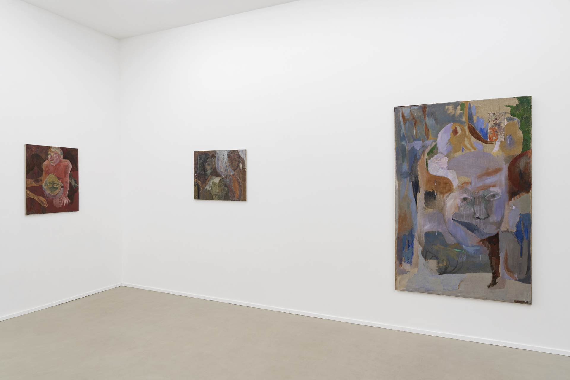 Each one of Wesołowska’s paintings has a different methodology and contains novel accidents. The canvas is initially confronted with a seed or hope in tow, followed by the artist employing her instinct. Paint is regularly supplied then rubbed away or sanded off, resulting in ruin-like layers on each surface. This process allows her figures to retain an element of vagueness. Wesołowska is plagued by a feeling of dissatisfaction with appearance until the composition is resolved in its “acceptance” stage. She works on simultaneous picture planes at once; essences abandoned on one canvas are picked up elsewhere. What happens around the figure is less specific than the expression contained within the face, this aspect being the foundation for each composition. These faces tend to sport a common gaze, one that points inward rather than toward the viewer, thus fueling a desire to access the subject’s psyche.