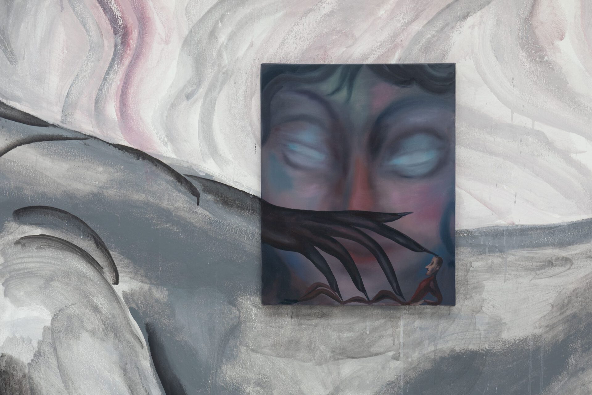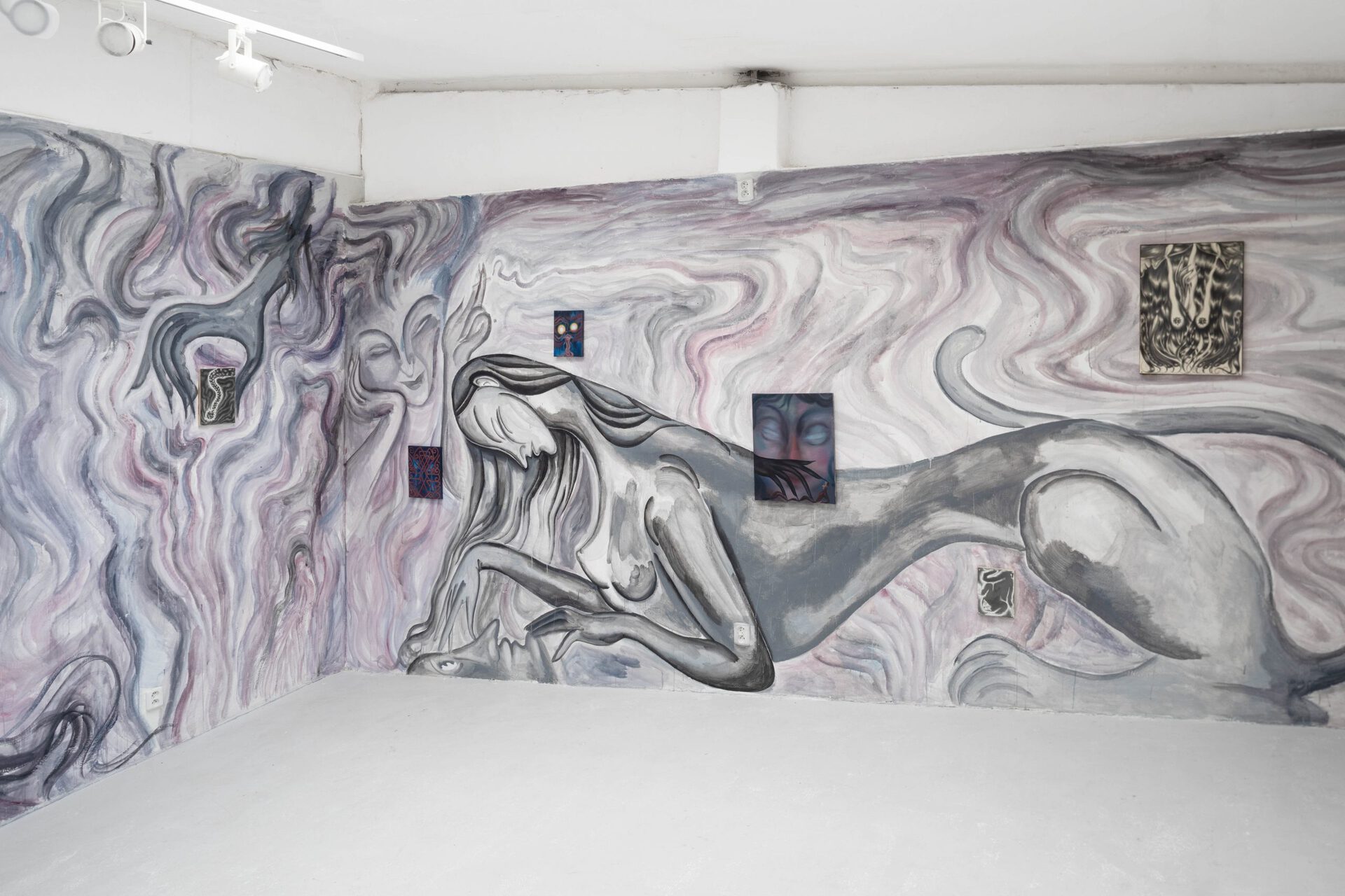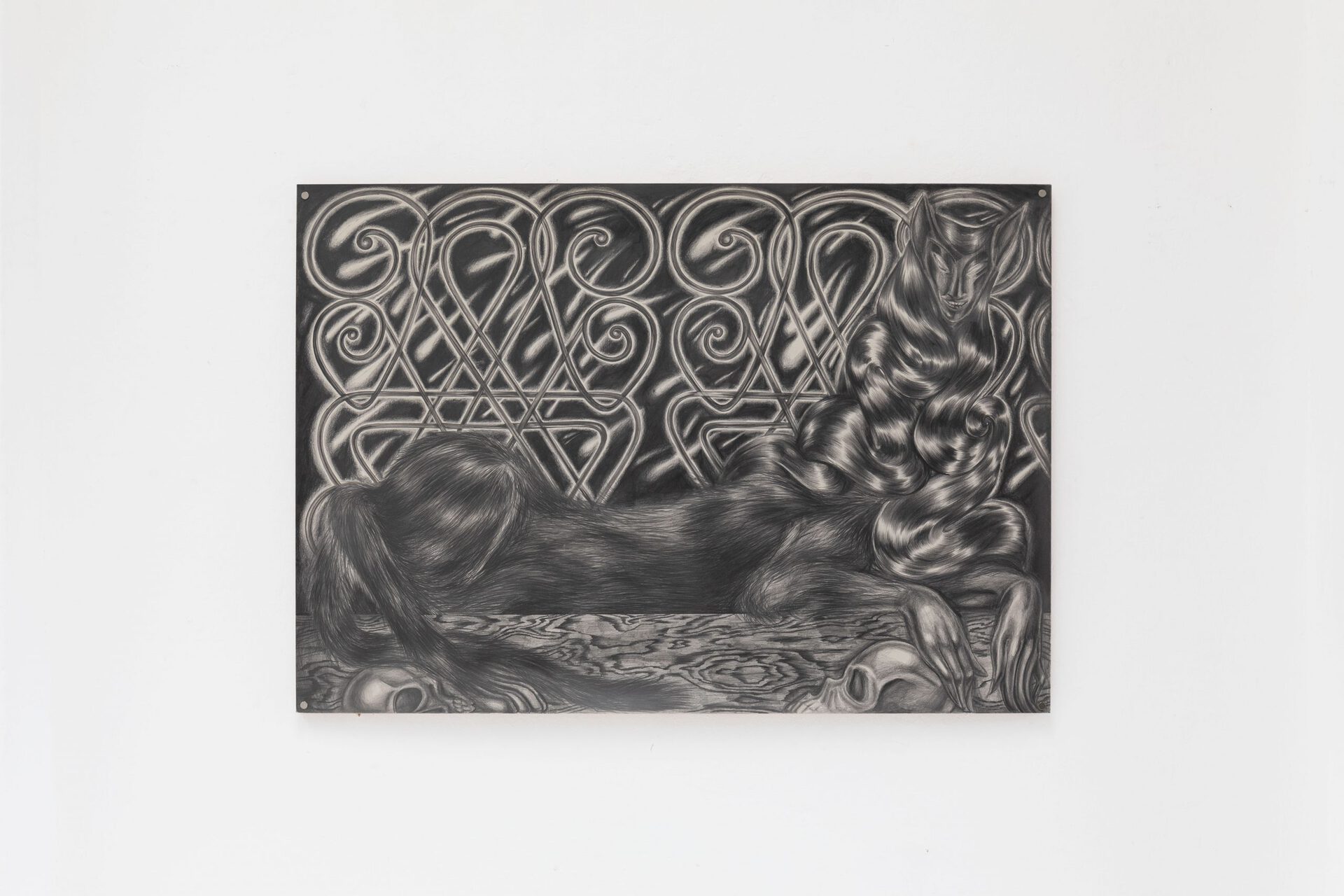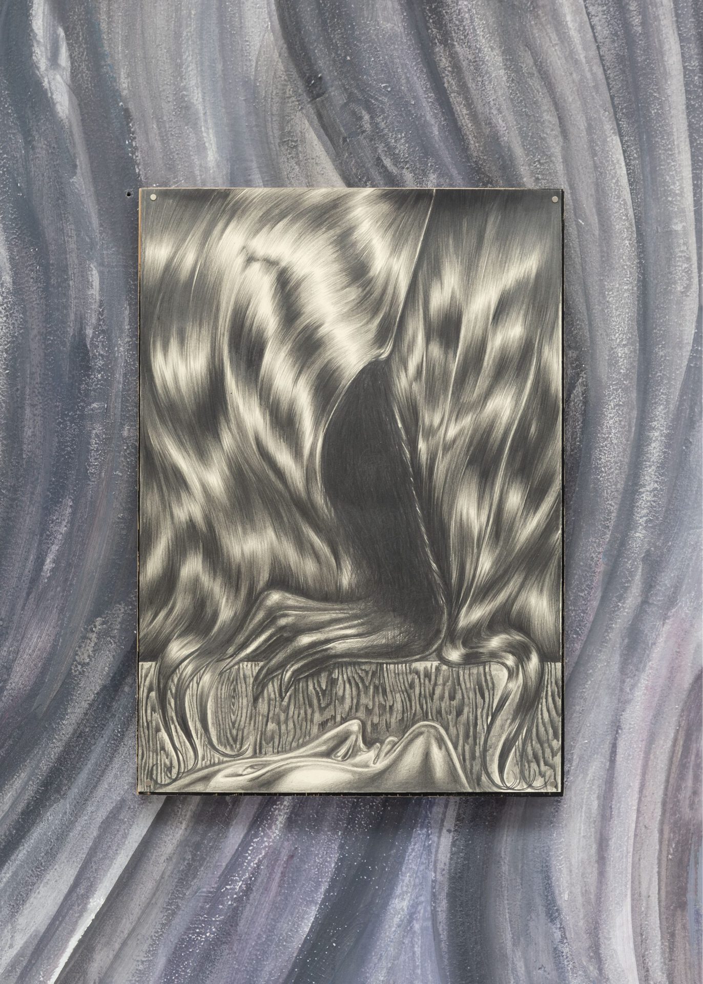 Paweł Olszczyński's pencil drawings are almost intoxicating in their fascination with structures, concentrated in subtle formats. Between contrasting annual rings of plywood, latex-shiny hands and demonicly deformed faces, the seductive texture of flowing hair that flows like a glistening river is repeated, braided into tight braids, or comes to life like Medusa's snakes. Hair is itself a multifaceted symbol that can evoke positive and negative emotions depending on the context. The thick mane symbolizes health and youth, success and power. In contrast, even a single hair on the edge of the plate is enough to make us feel absolutely disgusted. In Paweł's drawings, the ambivalence of hair works as a metaphor for the dark seductiveness of female power with which his hybrid female heroines fight their revenge for equality. Another recurring dichotomous motif is the tear, whose sad but aerodynamic shape can also be used as an offensive weapon in Paweł's drawings. Paintings on canvas, which complement the cycle of drawings, naturally leaves behind the graphic nature of expression. By their colour scheme, limited to greys, blues and purples, they symbiotically subvert the belligerence of drawings with decadent melancholy. The concentrated strength in smaller formats of both colour and black and white works is supported in the exhibition by a wider scale of wall scenes. Their motifs and cover of the space refer to period decorative architectural elements and Paweł's research on works by Czech symbolists, most obviously Portmoneum by Josef Váchal, as well as paintings by Jaroslav Panuška, Jan Preisler and Karl Šlenger.