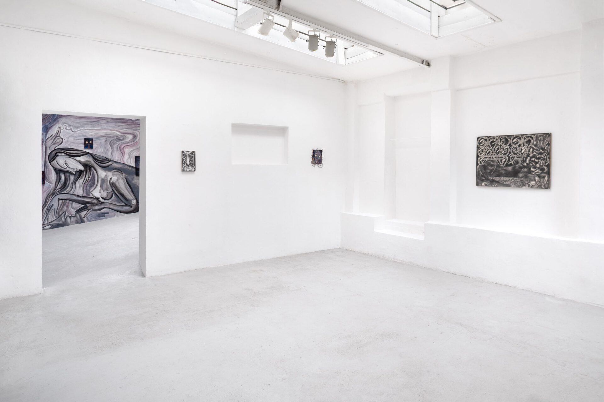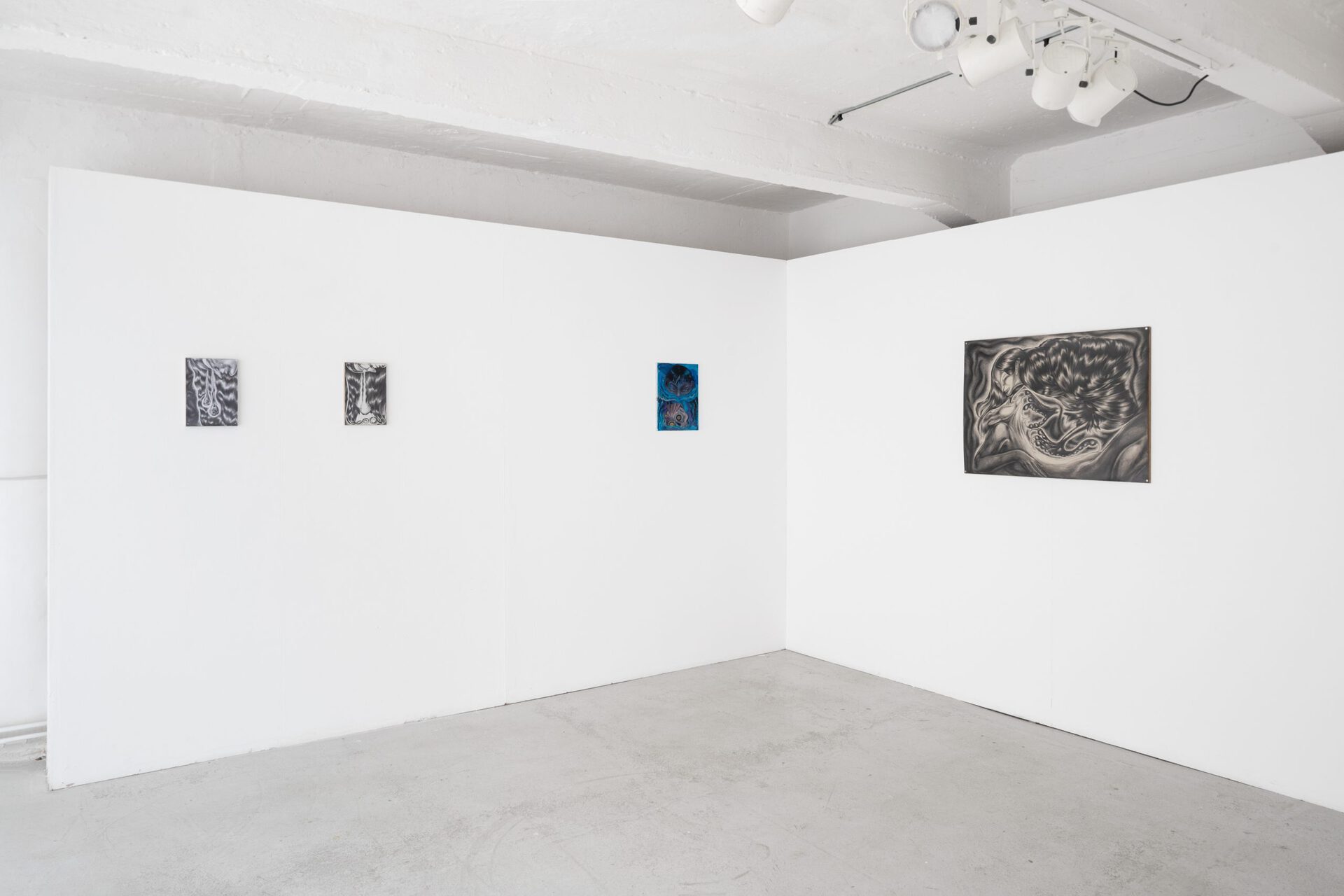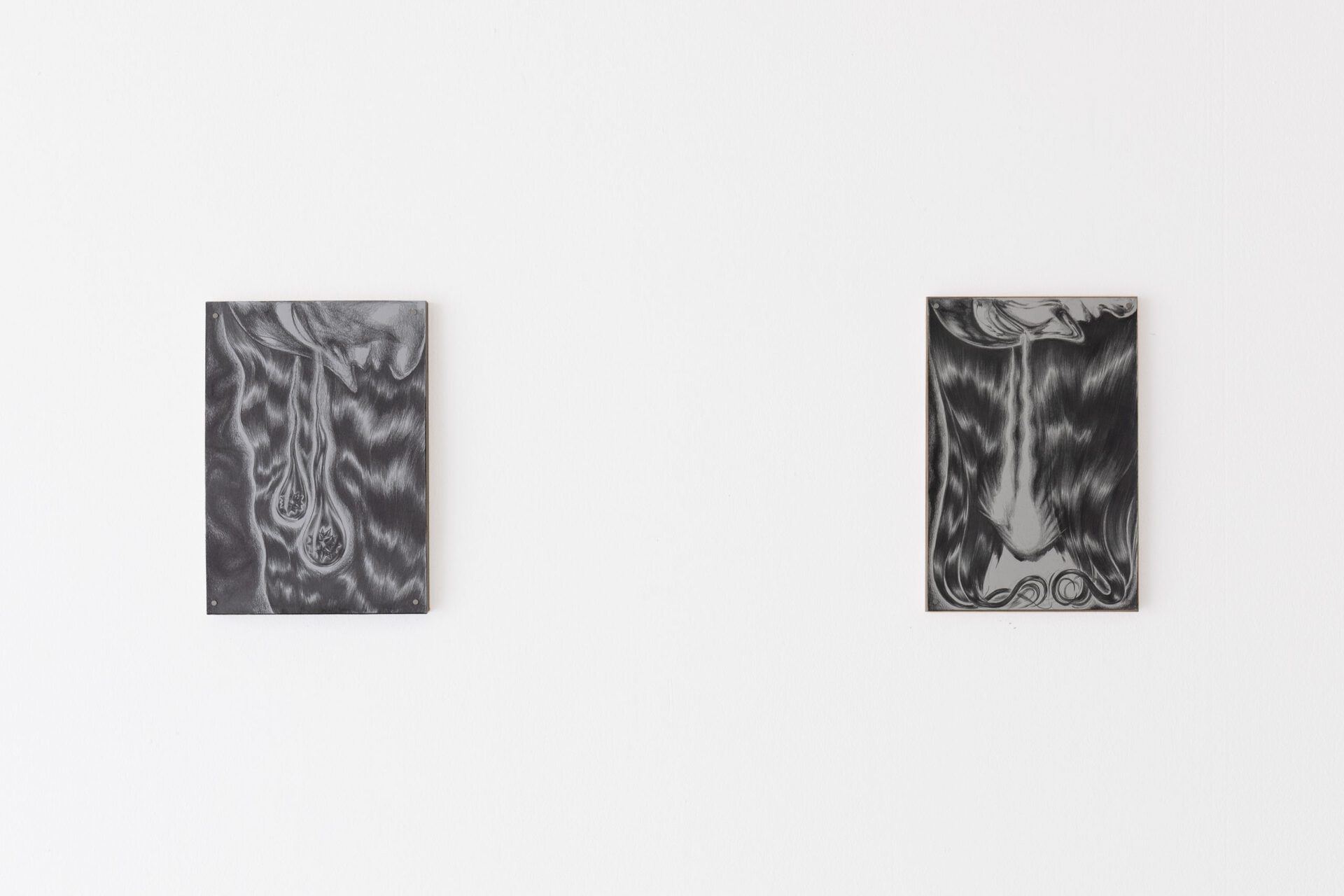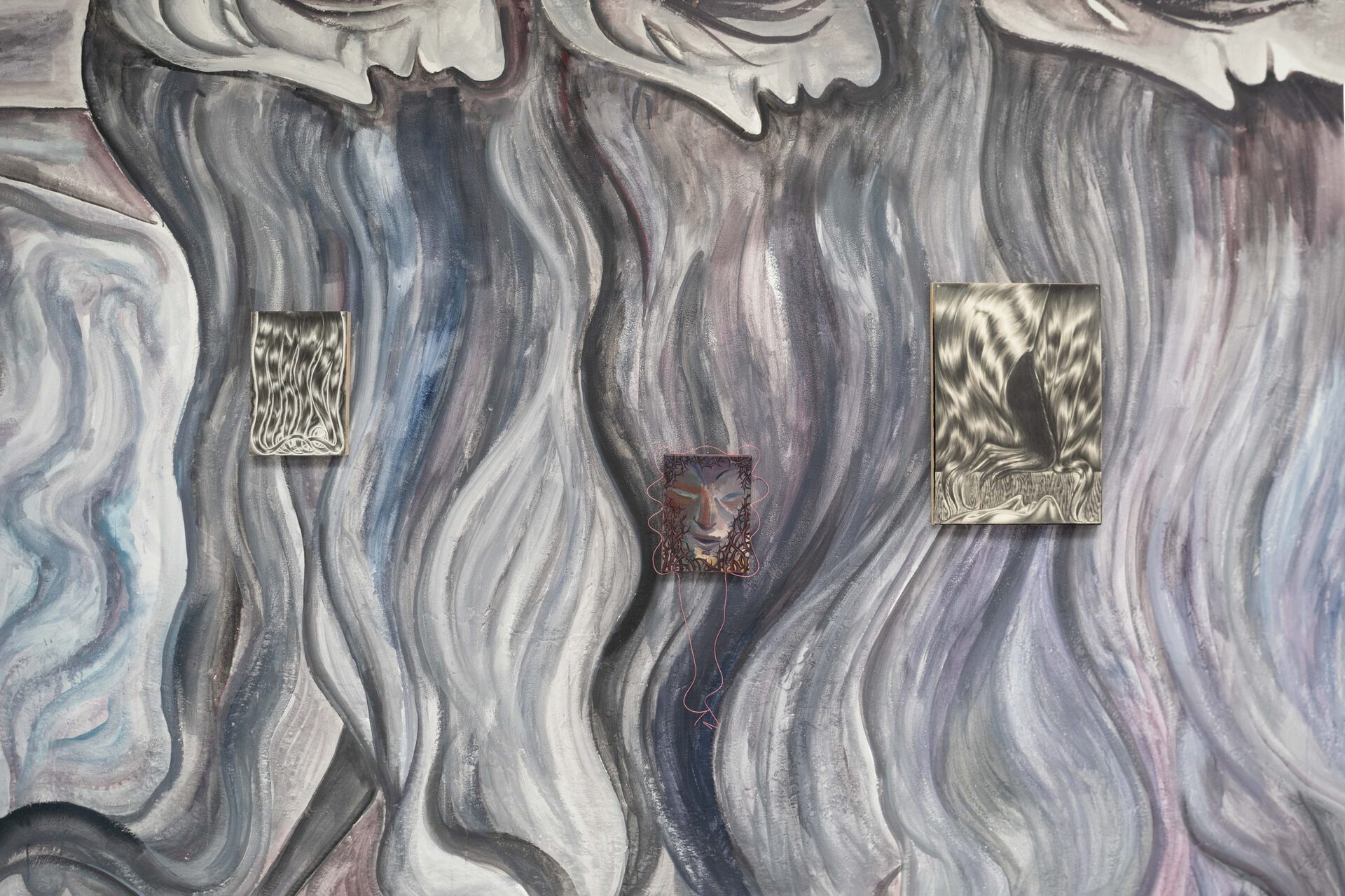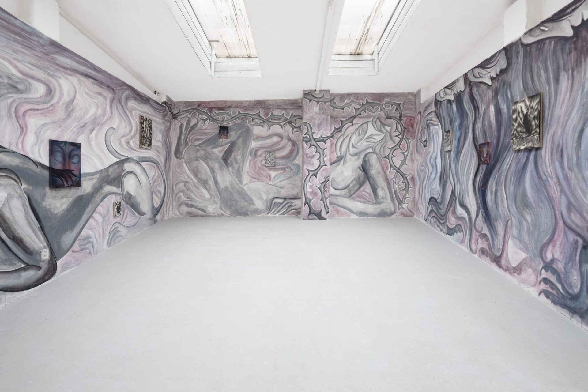 Paweł Olszczyński's pencil drawings are almost intoxicating in their fascination with structures, concentrated in subtle formats. Between contrasting annual rings of plywood, latex-shiny hands and demonicly deformed faces, the seductive texture of flowing hair that flows like a glistening river is repeated, braided into tight braids, or comes to life like Medusa's snakes. Hair is itself a multifaceted symbol that can evoke positive and negative emotions depending on the context. The thick mane symbolizes health and youth, success and power. In contrast, even a single hair on the edge of the plate is enough to make us feel absolutely disgusted. In Paweł's drawings, the ambivalence of hair works as a metaphor for the dark seductiveness of female power with which his hybrid female heroines fight their revenge for equality. Another recurring dichotomous motif is the tear, whose sad but aerodynamic shape can also be used as an offensive weapon in Paweł's drawings. Paintings on canvas, which complement the cycle of drawings, naturally leaves behind the graphic nature of expression. By their colour scheme, limited to greys, blues and purples, they symbiotically subvert the belligerence of drawings with decadent melancholy. The concentrated strength in smaller formats of both colour and black and white works is supported in the exhibition by a wider scale of wall scenes. Their motifs and cover of the space refer to period decorative architectural elements and Paweł's research on works by Czech symbolists, most obviously Portmoneum by Josef Váchal, as well as paintings by Jaroslav Panuška, Jan Preisler and Karl Šlenger.