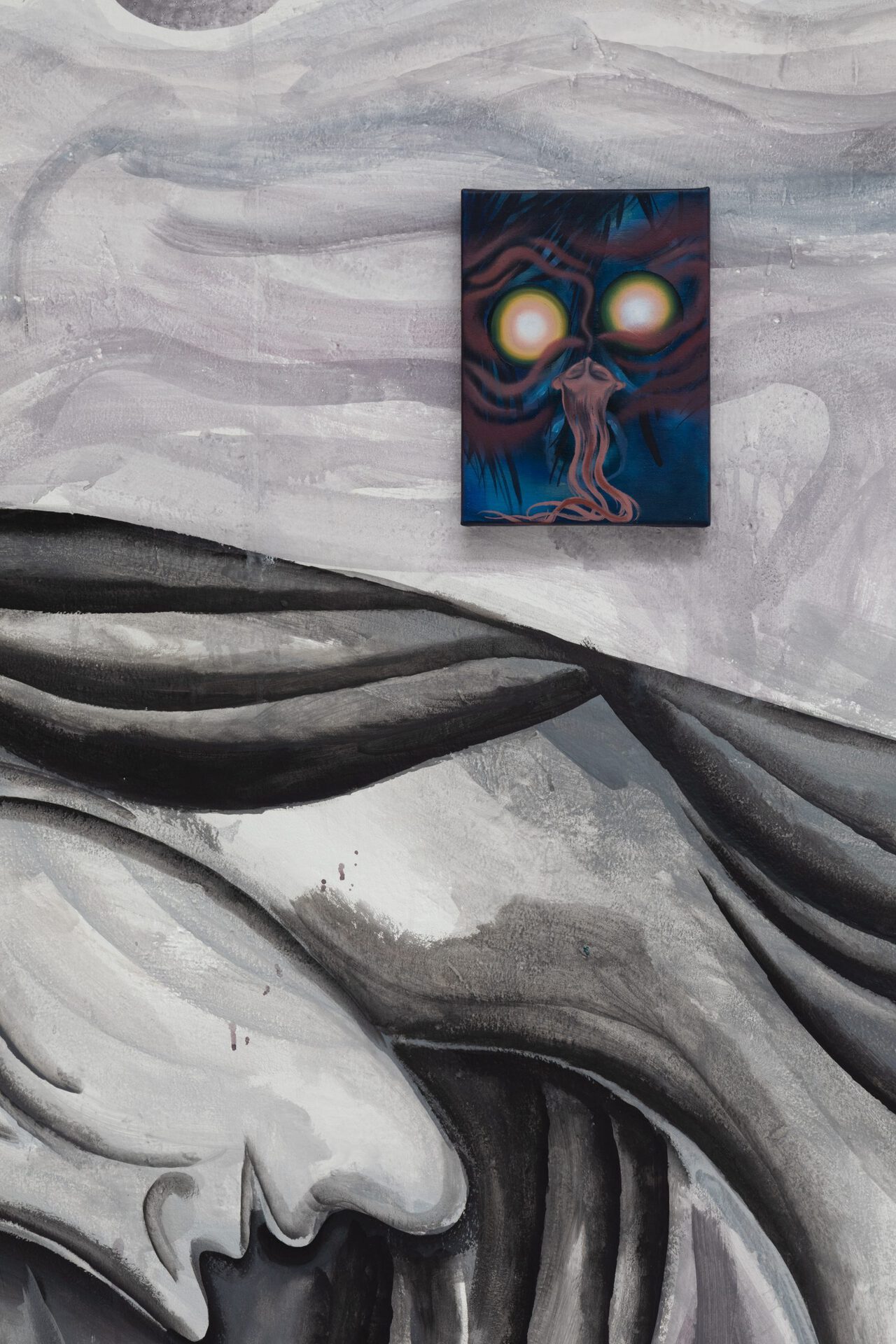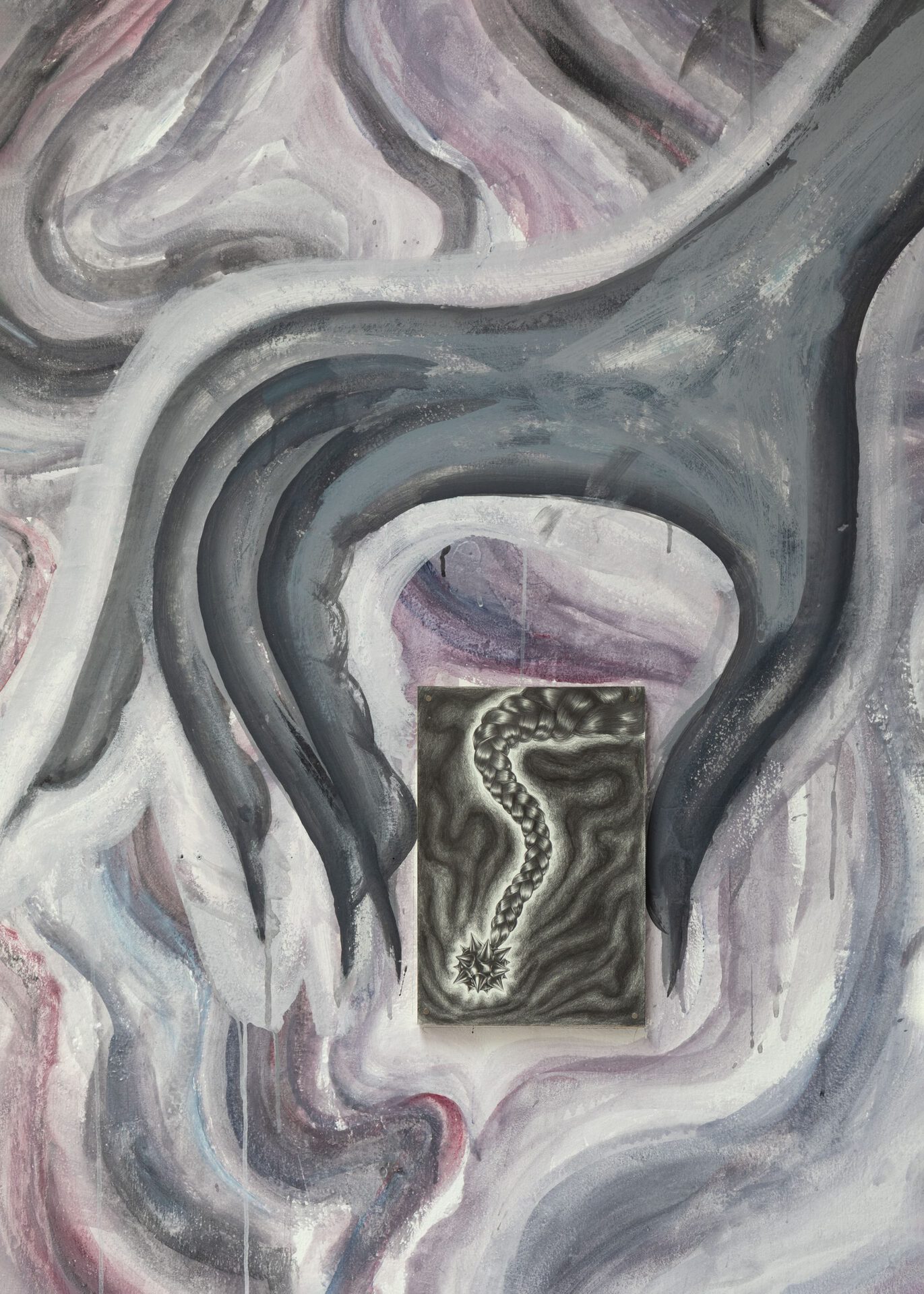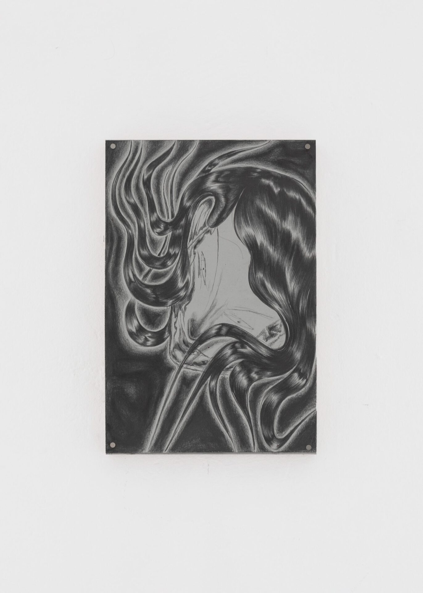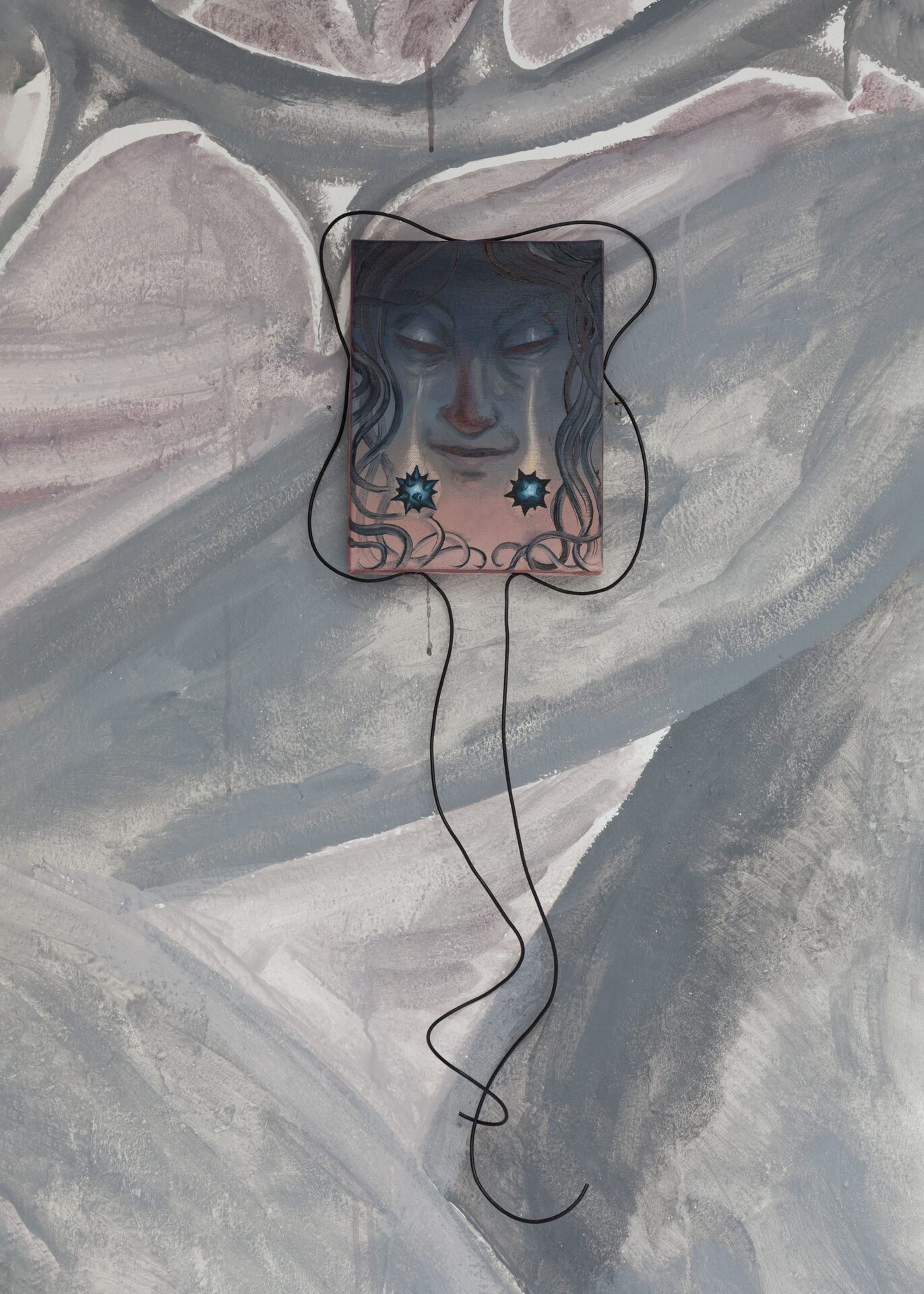 Paweł Olszczyński's pencil drawings are almost intoxicating in their fascination with structures, concentrated in subtle formats. Between contrasting annual rings of plywood, latex-shiny hands and demonicly deformed faces, the seductive texture of flowing hair that flows like a glistening river is repeated, braided into tight braids, or comes to life like Medusa's snakes. Hair is itself a multifaceted symbol that can evoke positive and negative emotions depending on the context. The thick mane symbolizes health and youth, success and power. In contrast, even a single hair on the edge of the plate is enough to make us feel absolutely disgusted. In Paweł's drawings, the ambivalence of hair works as a metaphor for the dark seductiveness of female power with which his hybrid female heroines fight their revenge for equality. Another recurring dichotomous motif is the tear, whose sad but aerodynamic shape can also be used as an offensive weapon in Paweł's drawings. Paintings on canvas, which complement the cycle of drawings, naturally leaves behind the graphic nature of expression. By their colour scheme, limited to greys, blues and purples, they symbiotically subvert the belligerence of drawings with decadent melancholy. The concentrated strength in smaller formats of both colour and black and white works is supported in the exhibition by a wider scale of wall scenes. Their motifs and cover of the space refer to period decorative architectural elements and Paweł's research on works by Czech symbolists, most obviously Portmoneum by Josef Váchal, as well as paintings by Jaroslav Panuška, Jan Preisler and Karl Šlenger.