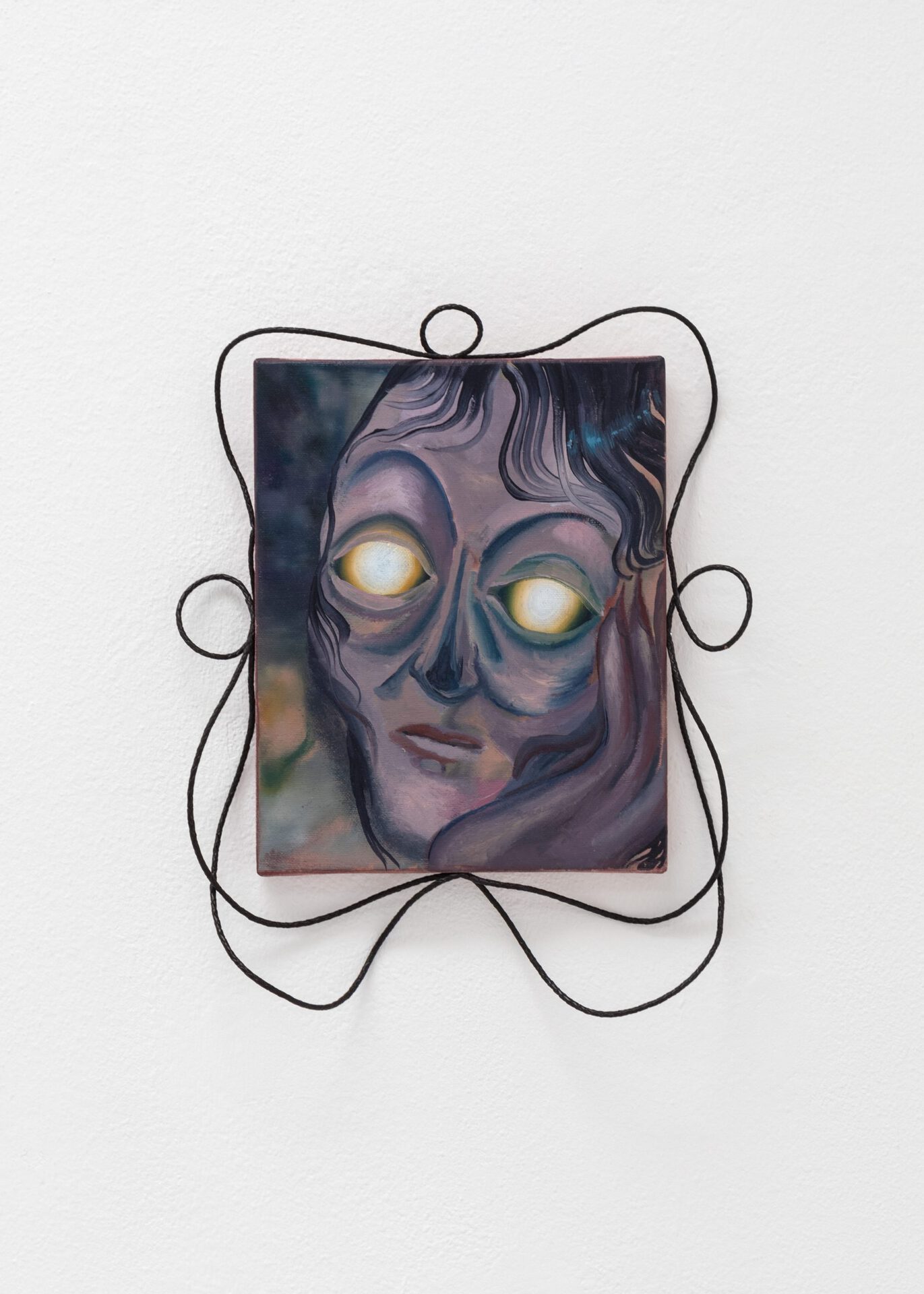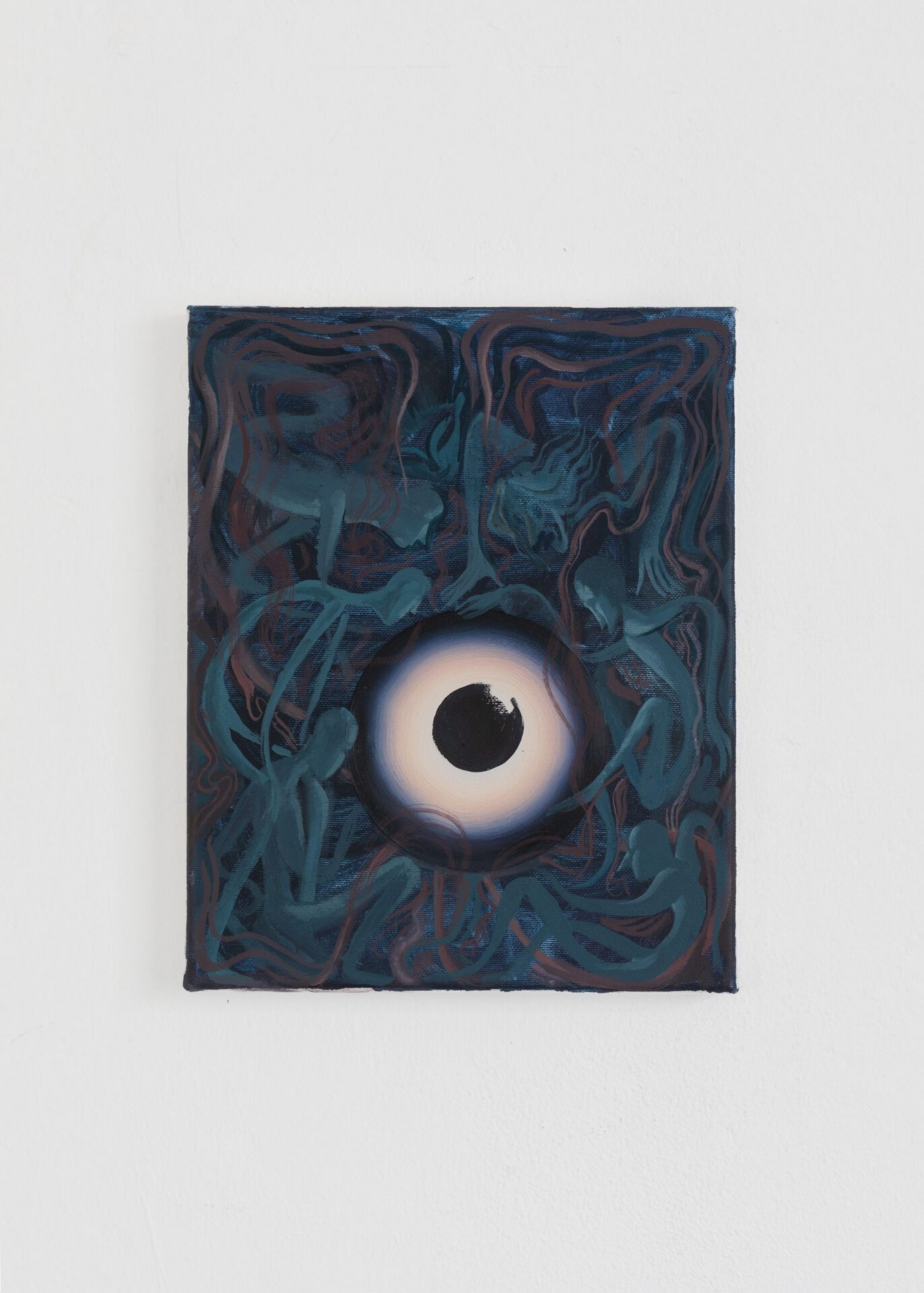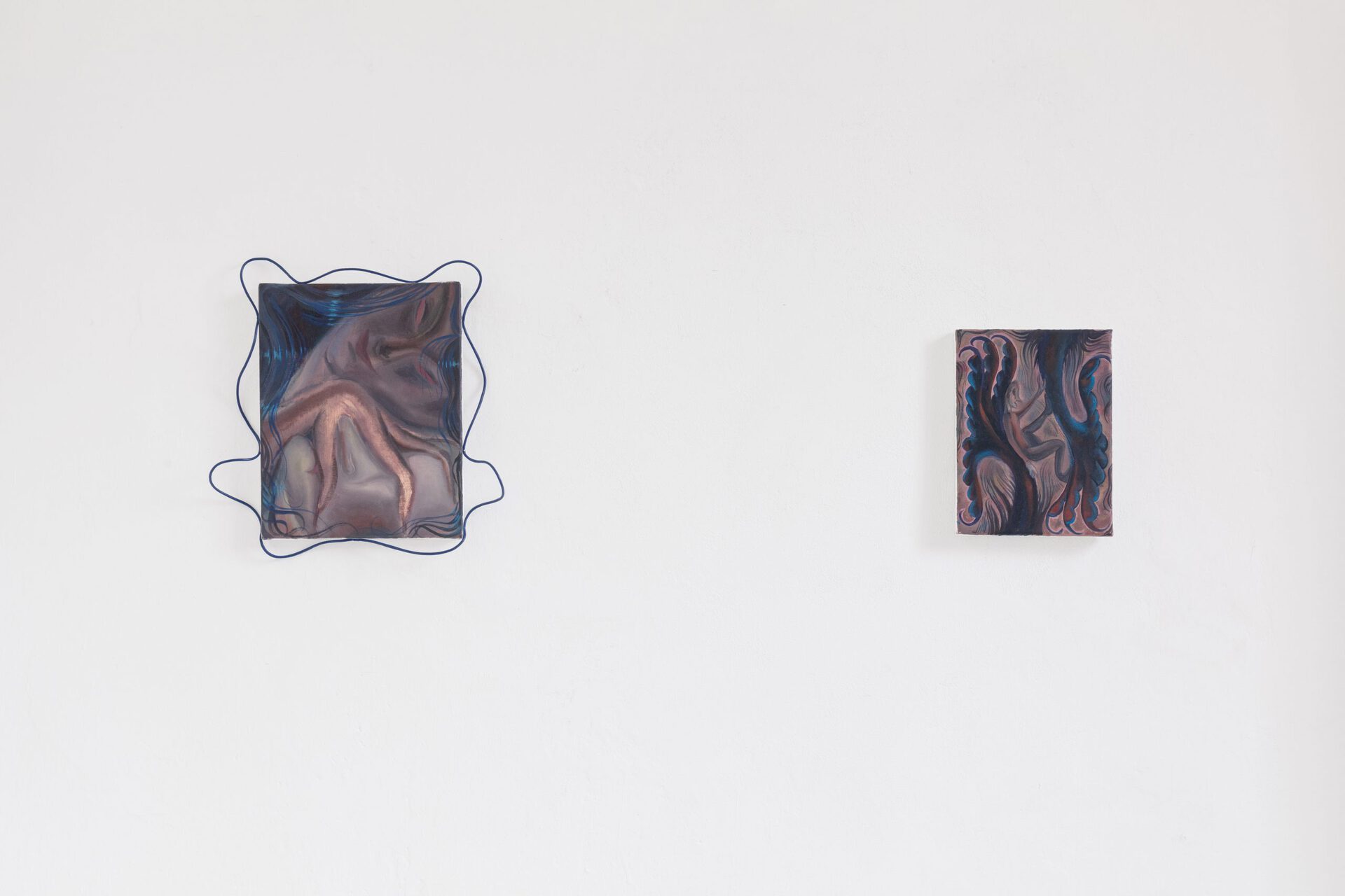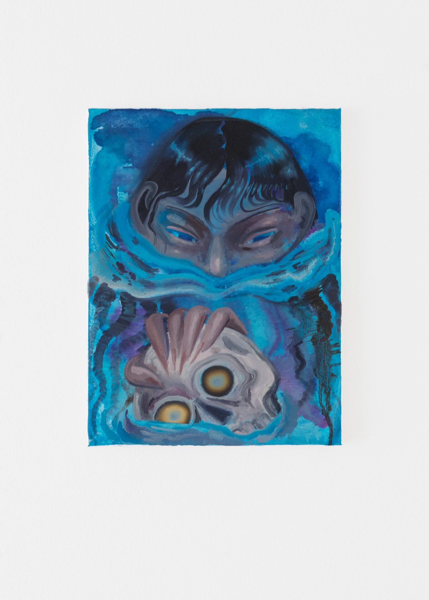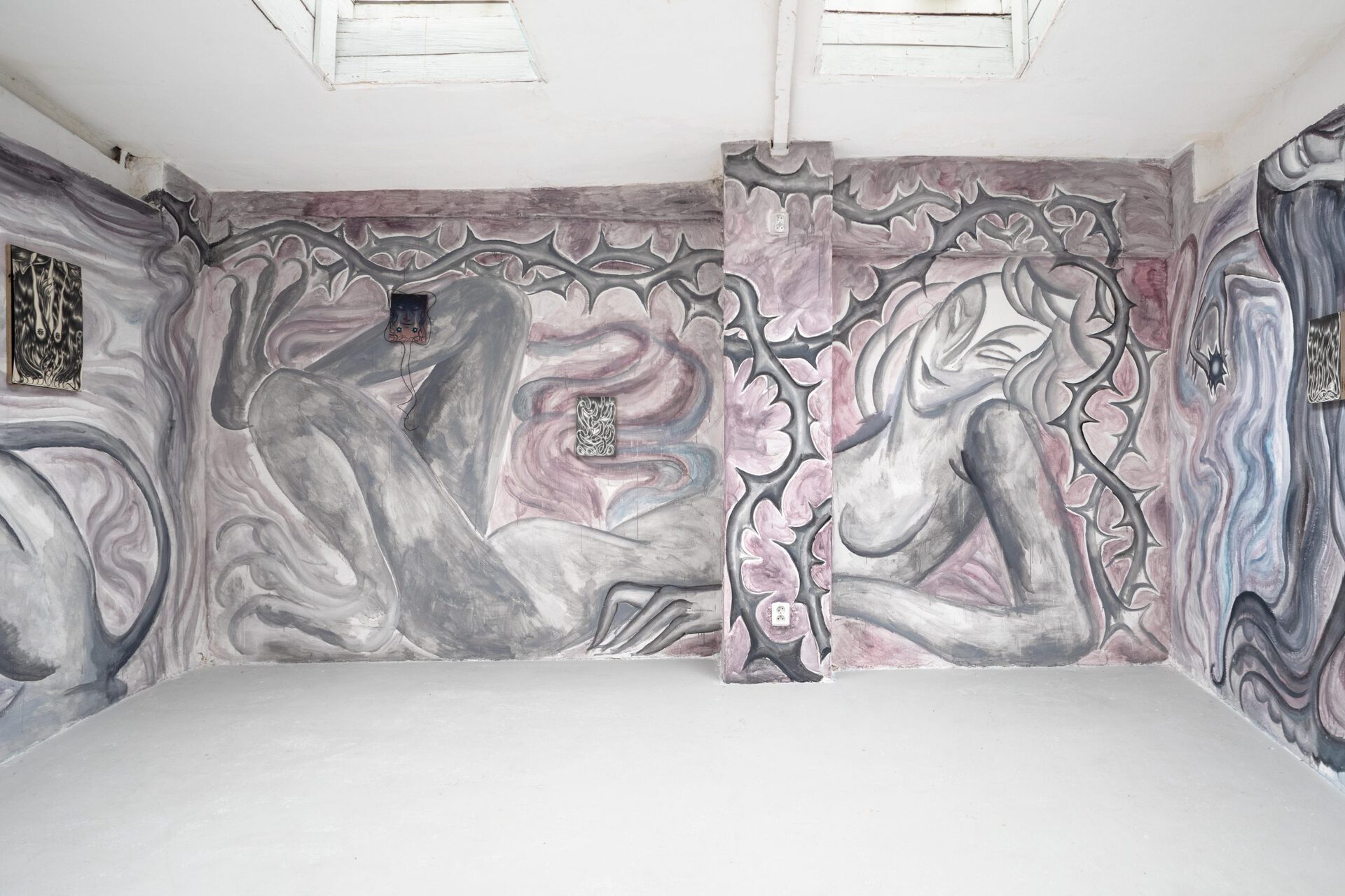Paweł Olszczyński's pencil drawings are almost intoxicating in their fascination with structures, concentrated in subtle formats. Between contrasting annual rings of plywood, latex-shiny hands and demonicly deformed faces, the seductive texture of flowing hair that flows like a glistening river is repeated, braided into tight braids, or comes to life like Medusa's snakes. Hair is itself a multifaceted symbol that can evoke positive and negative emotions depending on the context. The thick mane symbolizes health and youth, success and power. In contrast, even a single hair on the edge of the plate is enough to make us feel absolutely disgusted. In Paweł's drawings, the ambivalence of hair works as a metaphor for the dark seductiveness of female power with which his hybrid female heroines fight their revenge for equality. Another recurring dichotomous motif is the tear, whose sad but aerodynamic shape can also be used as an offensive weapon in Paweł's drawings. Paintings on canvas, which complement the cycle of drawings, naturally leaves behind the graphic nature of expression. By their colour scheme, limited to greys, blues and purples, they symbiotically subvert the belligerence of drawings with decadent melancholy. The concentrated strength in smaller formats of both colour and black and white works is supported in the exhibition by a wider scale of wall scenes. Their motifs and cover of the space refer to period decorative architectural elements and Paweł's research on works by Czech symbolists, most obviously Portmoneum by Josef Váchal, as well as paintings by Jaroslav Panuška, Jan Preisler and Karl Šlenger.