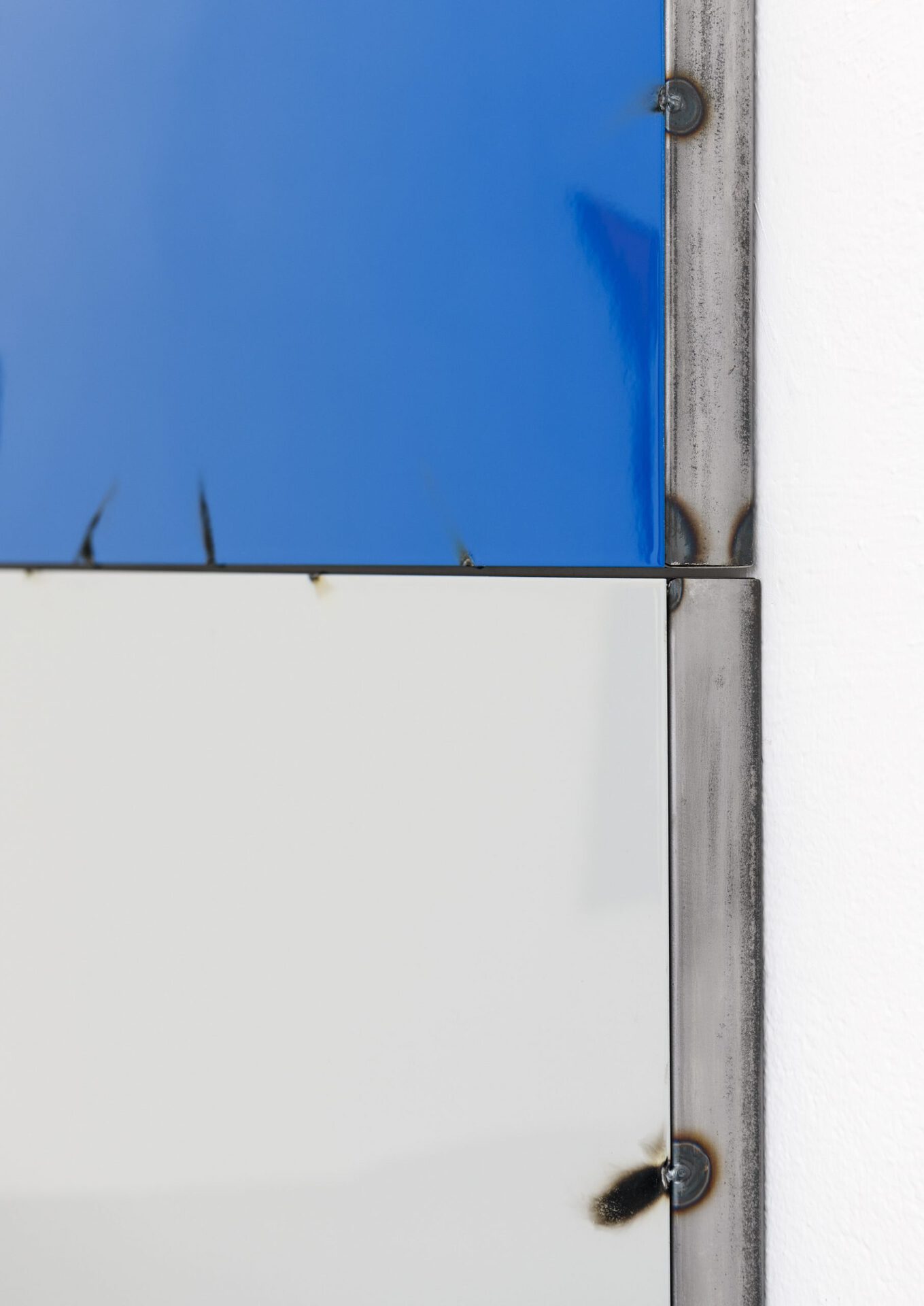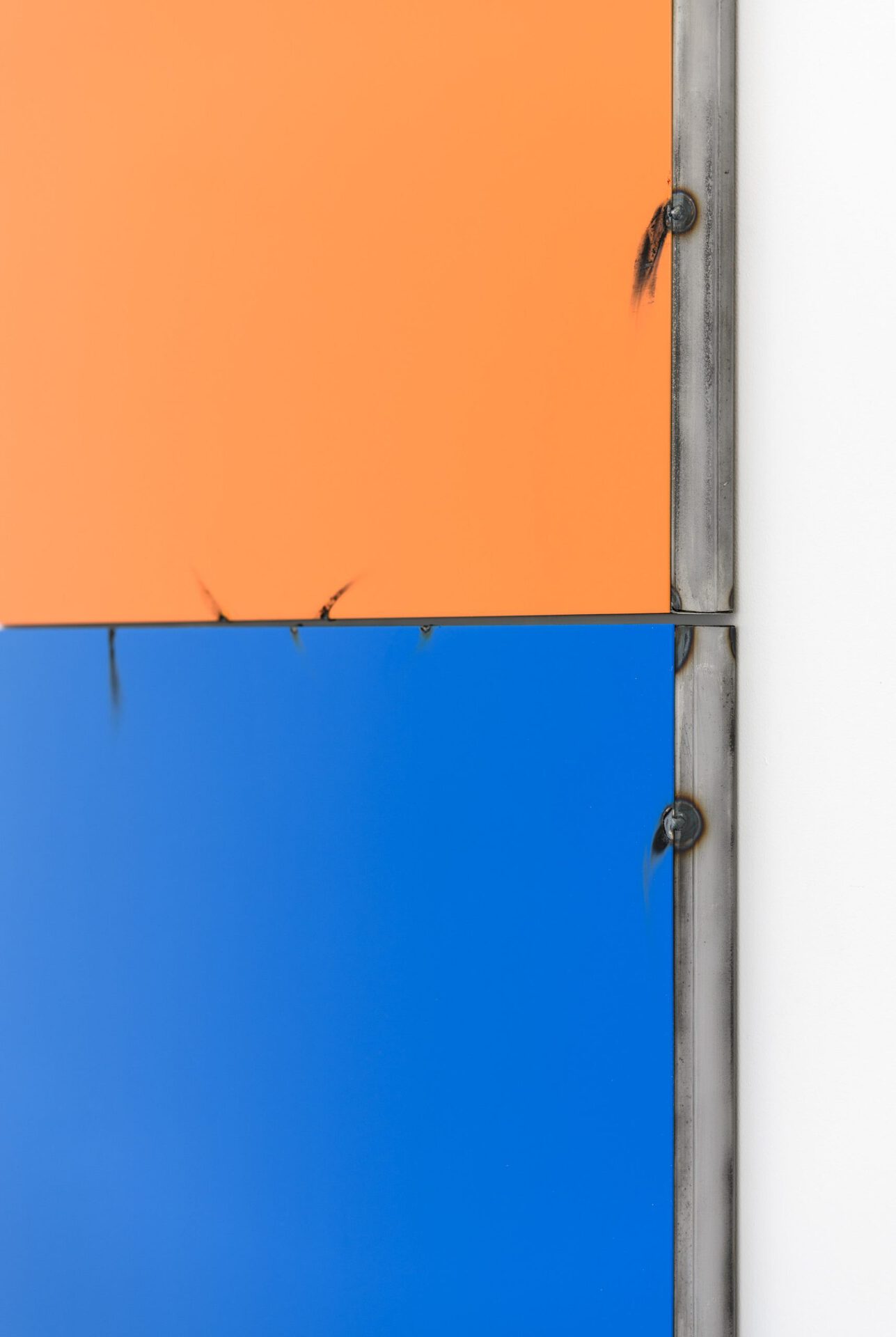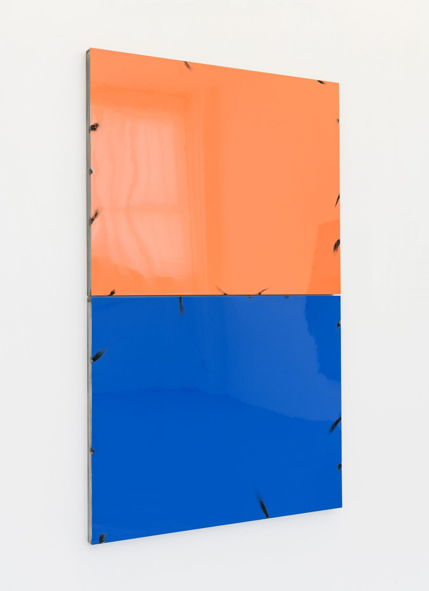 In his series of Blech Paintings (Tin Paintings) coloured metal plates are welded on a steel frame where the intervention is made visible.The focus on fixation contributes to a rythm emerging at the edges of the work and grants something brutal which contrast the shiny surface and juicy colours. The paintings are charged with impulses of the present, distansing themselves from a purely historical attribution to the Finish Fetish movement, which emerged in Southern-California in the 1969's, perhaps as a reacton of New York Minimalism. Jenssen, like the Californians were, is inspired by influences from Pop Art and, using paints, metals, and de-contextualized objects.