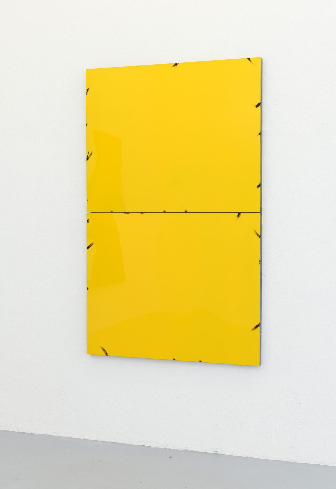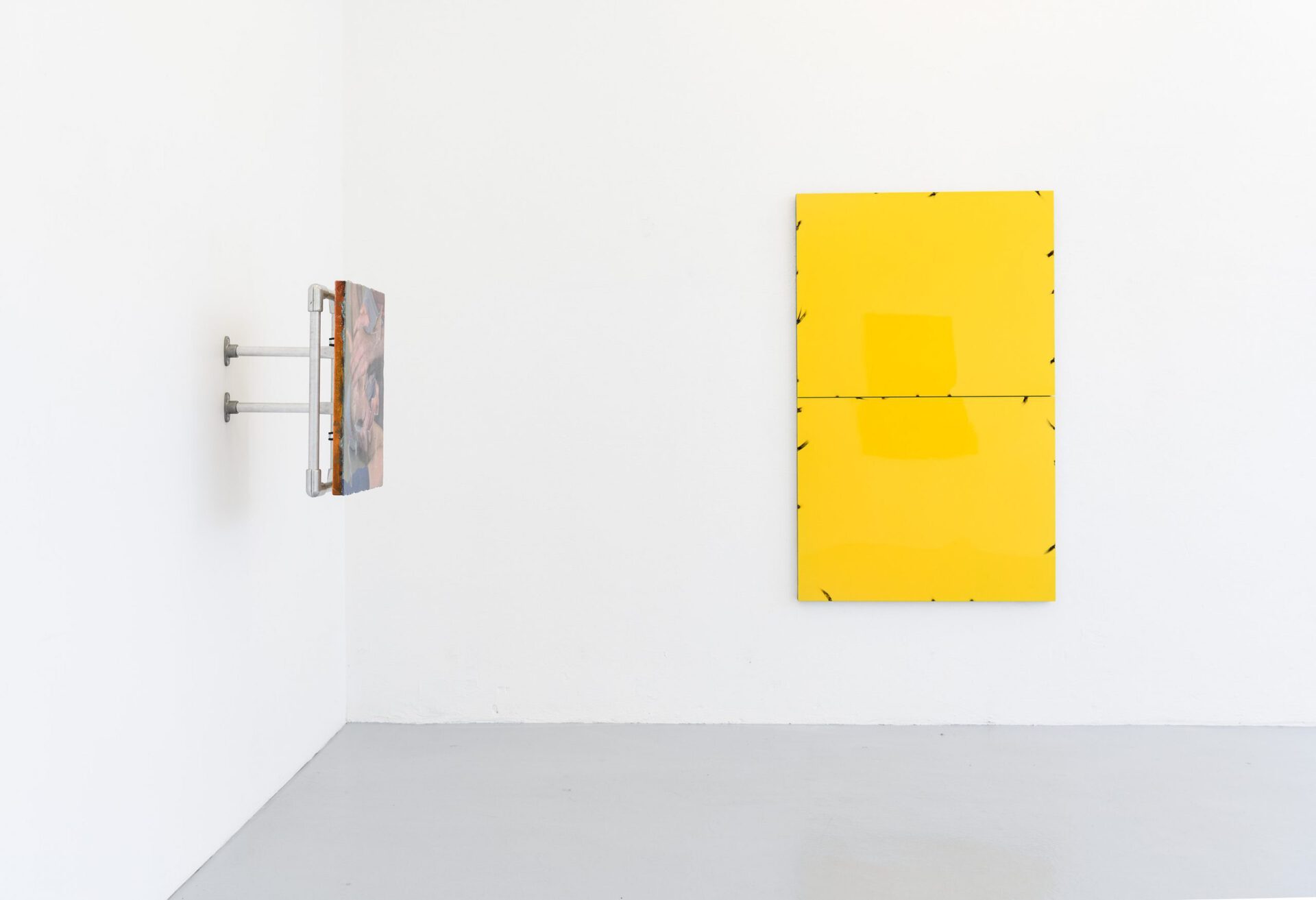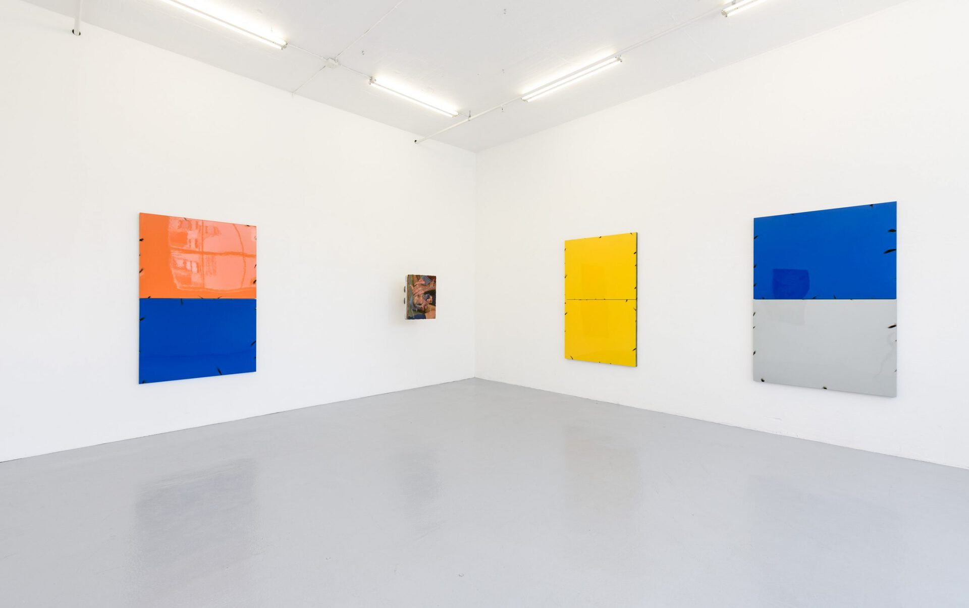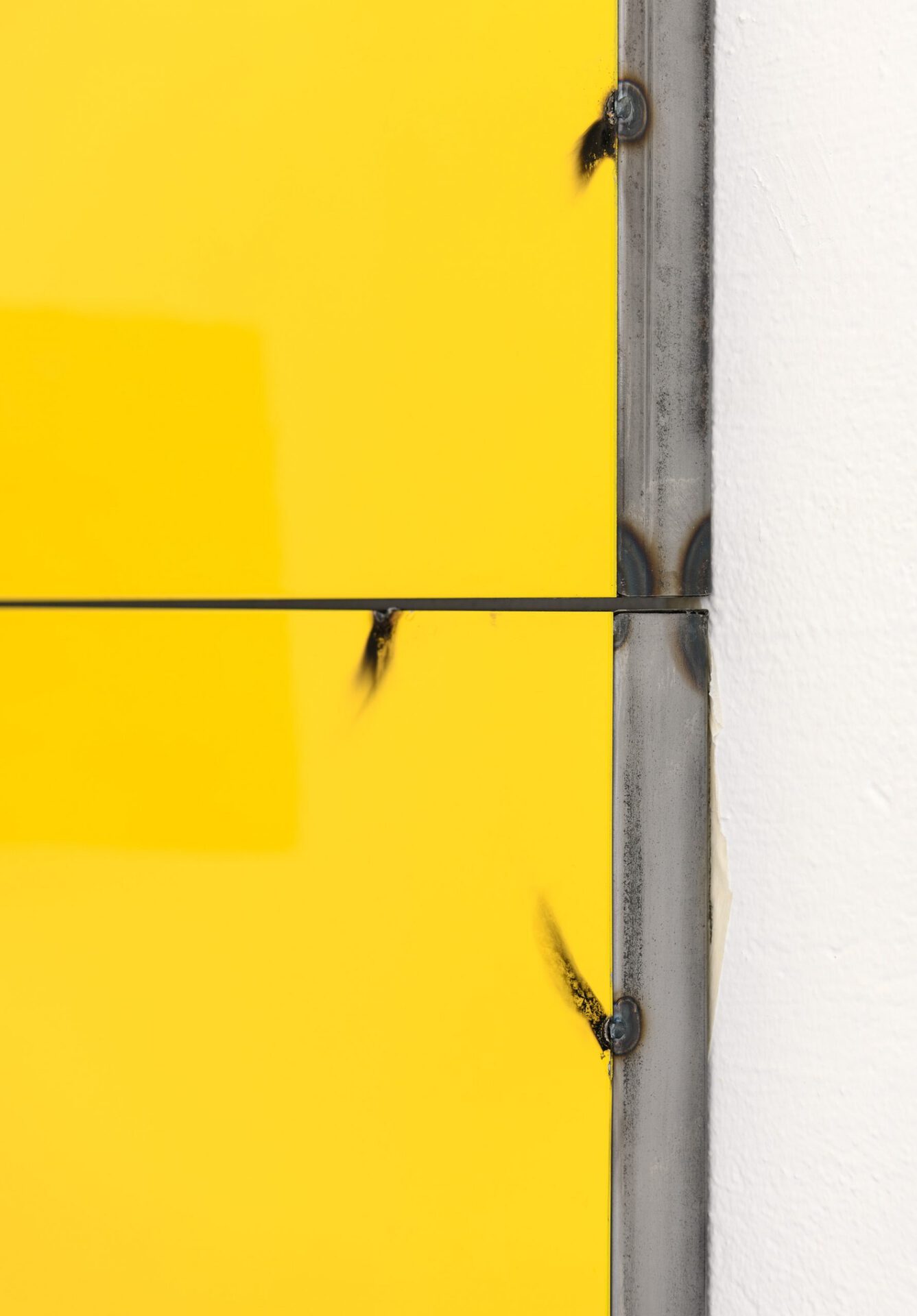 In his series of Blech Paintings (Tin Paintings) coloured metal plates are welded on a steel frame where the intervention is made visible.The focus on fixation contributes to a rythm emerging at the edges of the work and grants something brutal which contrast the shiny surface and juicy colours. The paintings are charged with impulses of the present, distansing themselves from a purely historical attribution to the Finish Fetish movement, which emerged in Southern-California in the 1969's, perhaps as a reacton of New York Minimalism. Jenssen, like the Californians were, is inspired by influences from Pop Art and, using paints, metals, and de-contextualized objects.