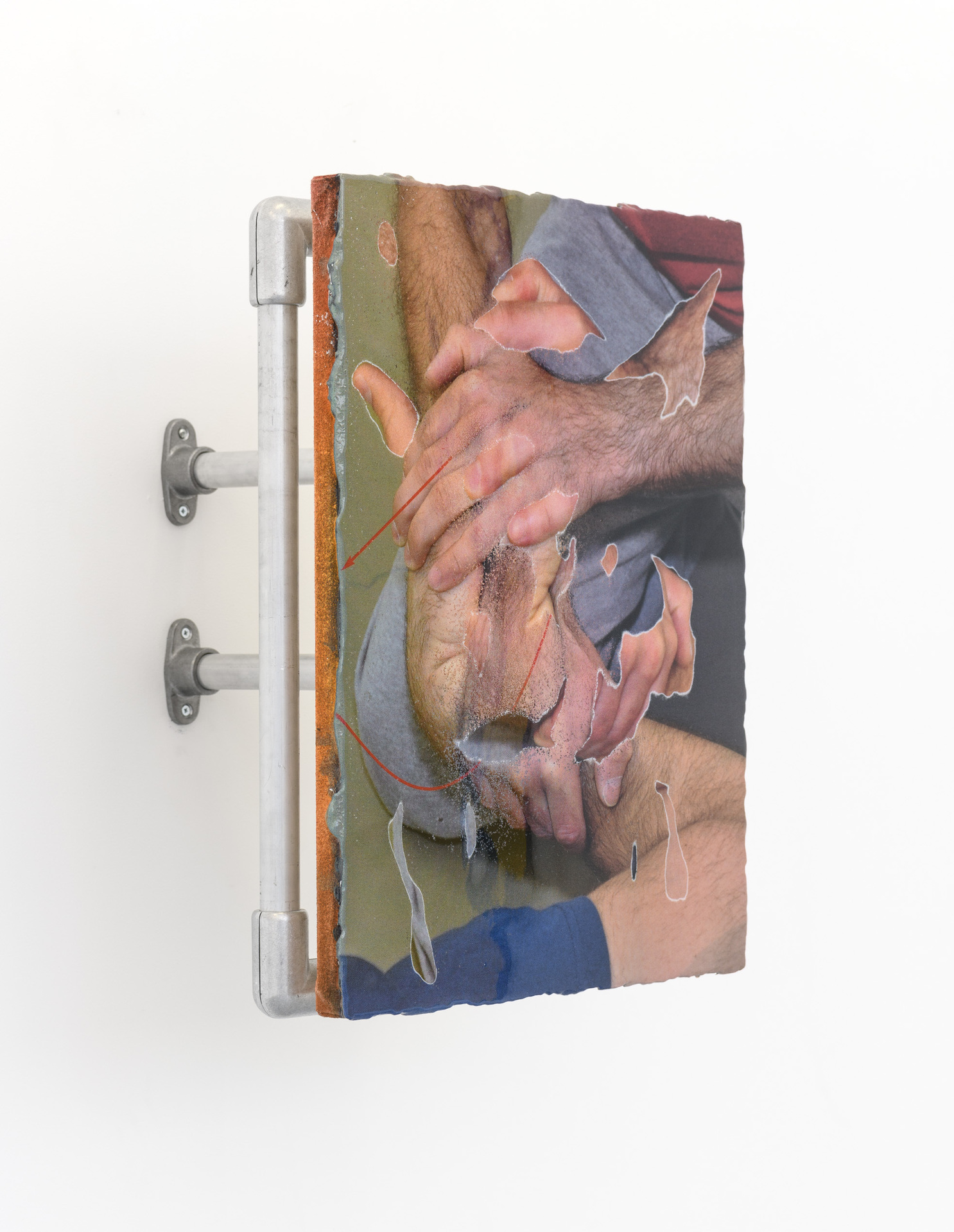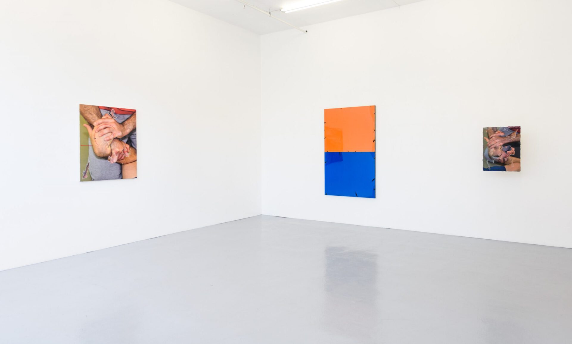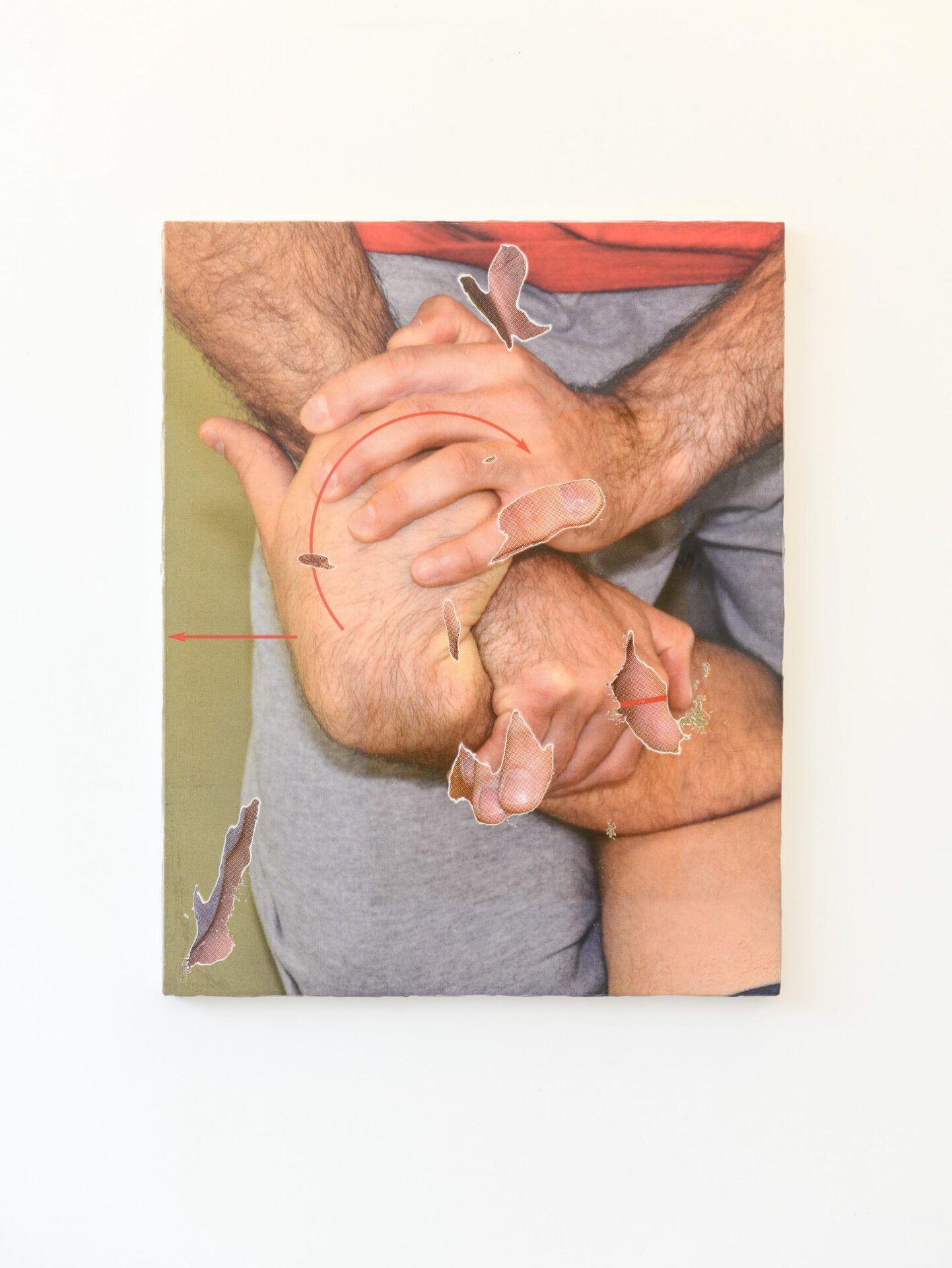 Thilo Jenssen's new series takes two to tango at Galleri Opdahl elongates the artists eximination of first aid measures, in which the ambvialence of hold/support andcontrol/restriction was thematised. Based on his paintery practice, the artist replaces layers of paint with pictorial motifs from a manual for transport and fixing holds, which are printed on top of each other and then sanded. The physical moment of the painterly practice is repeated in the motifs of body limbs that