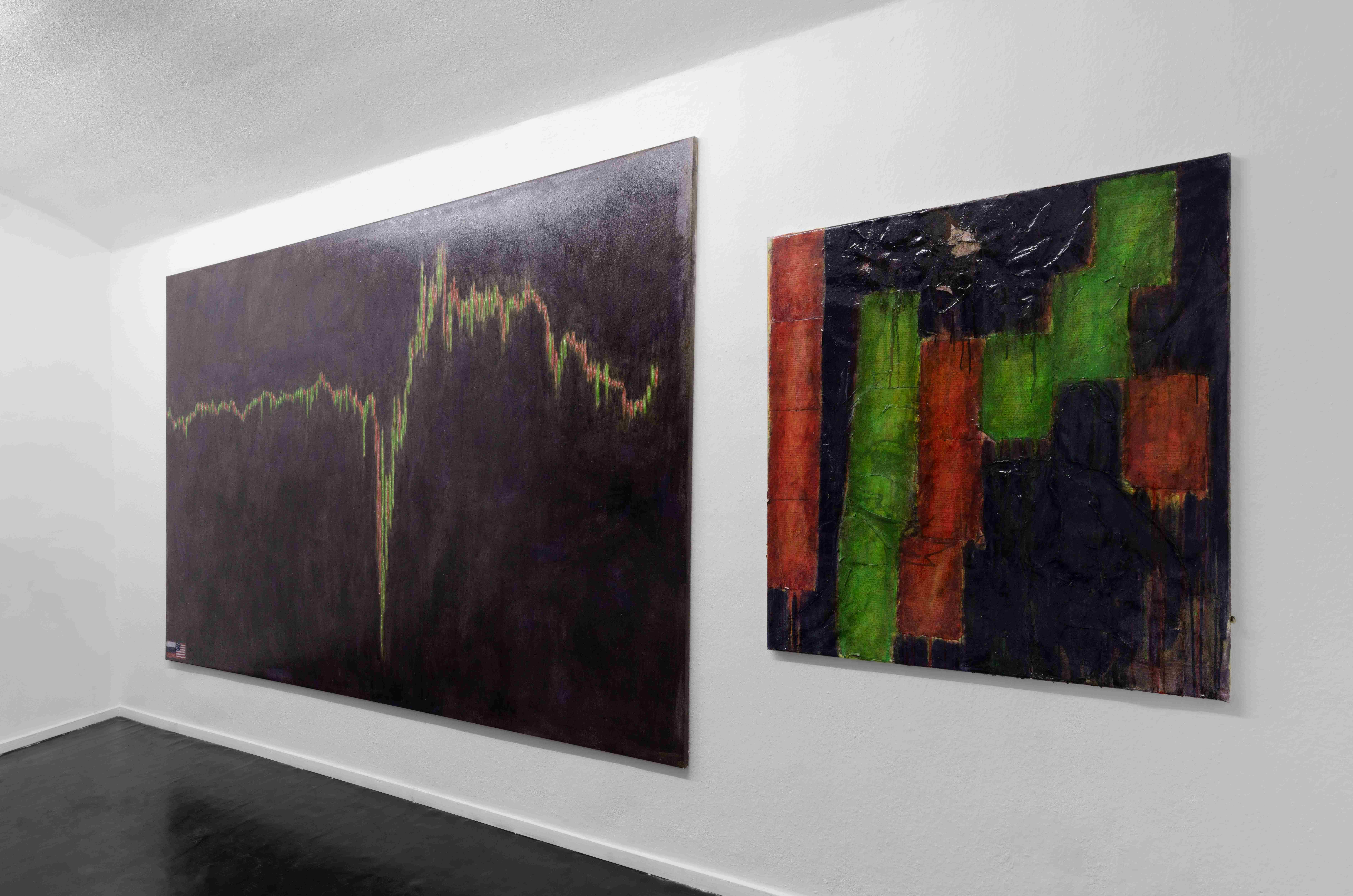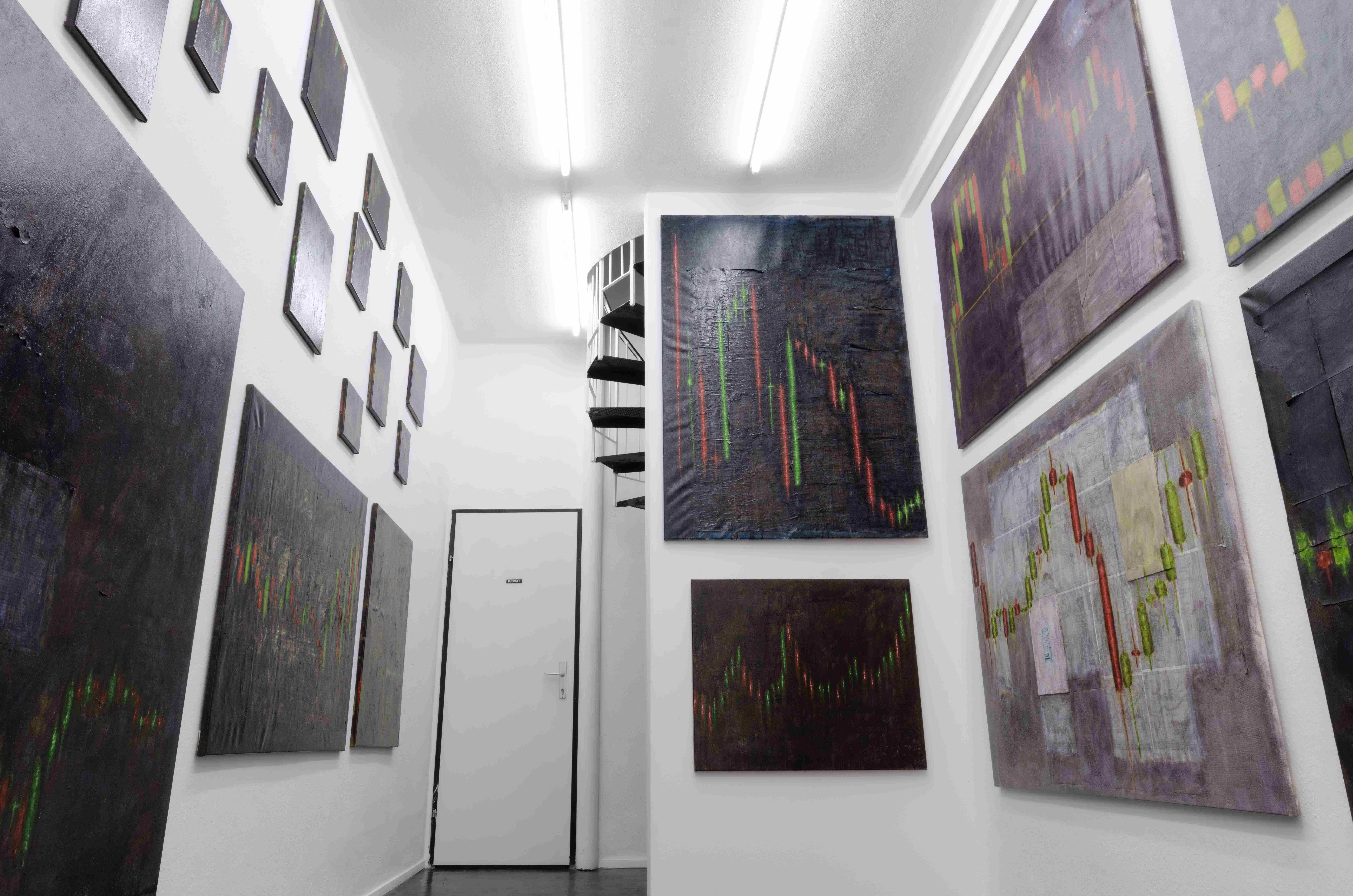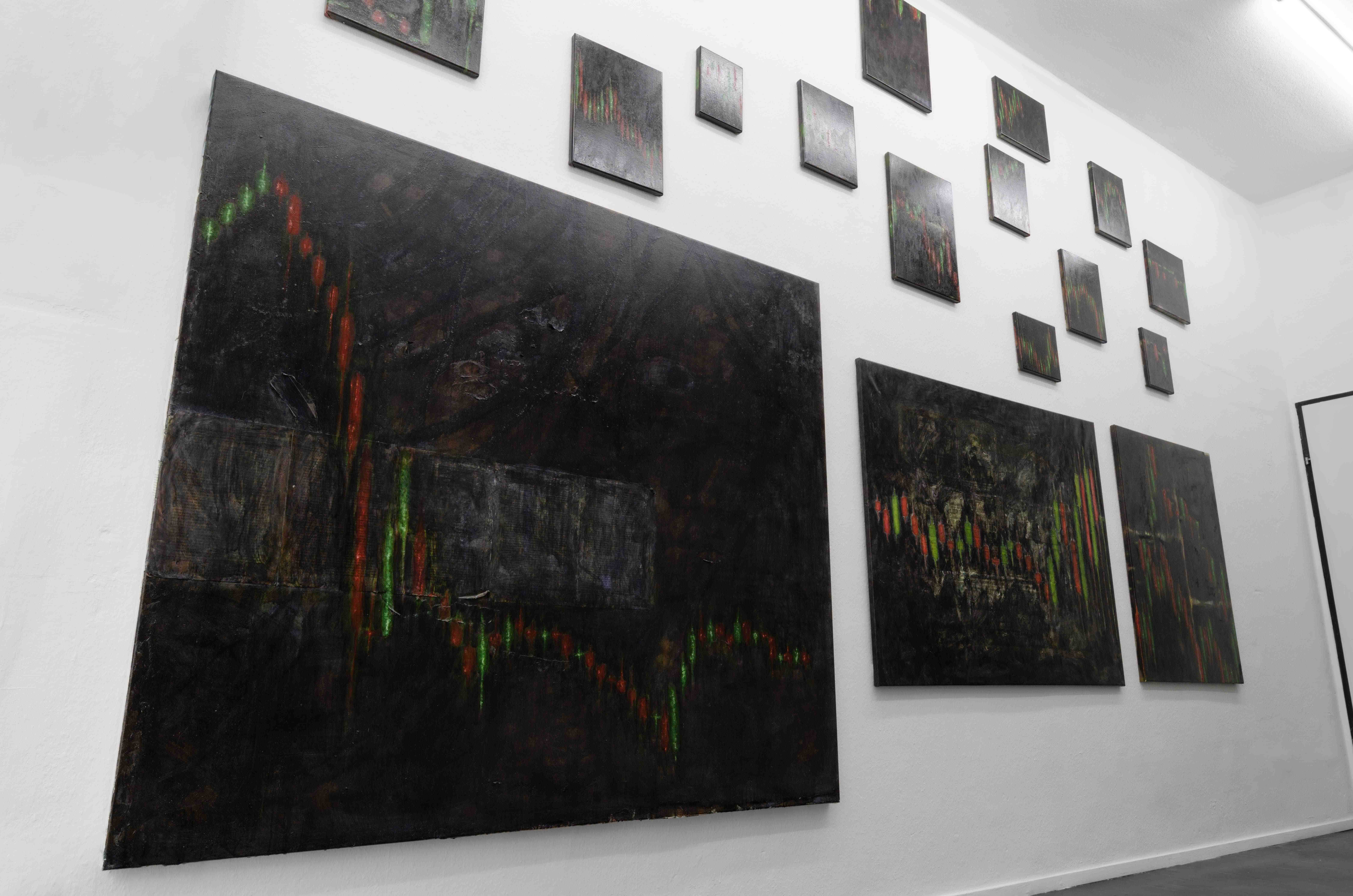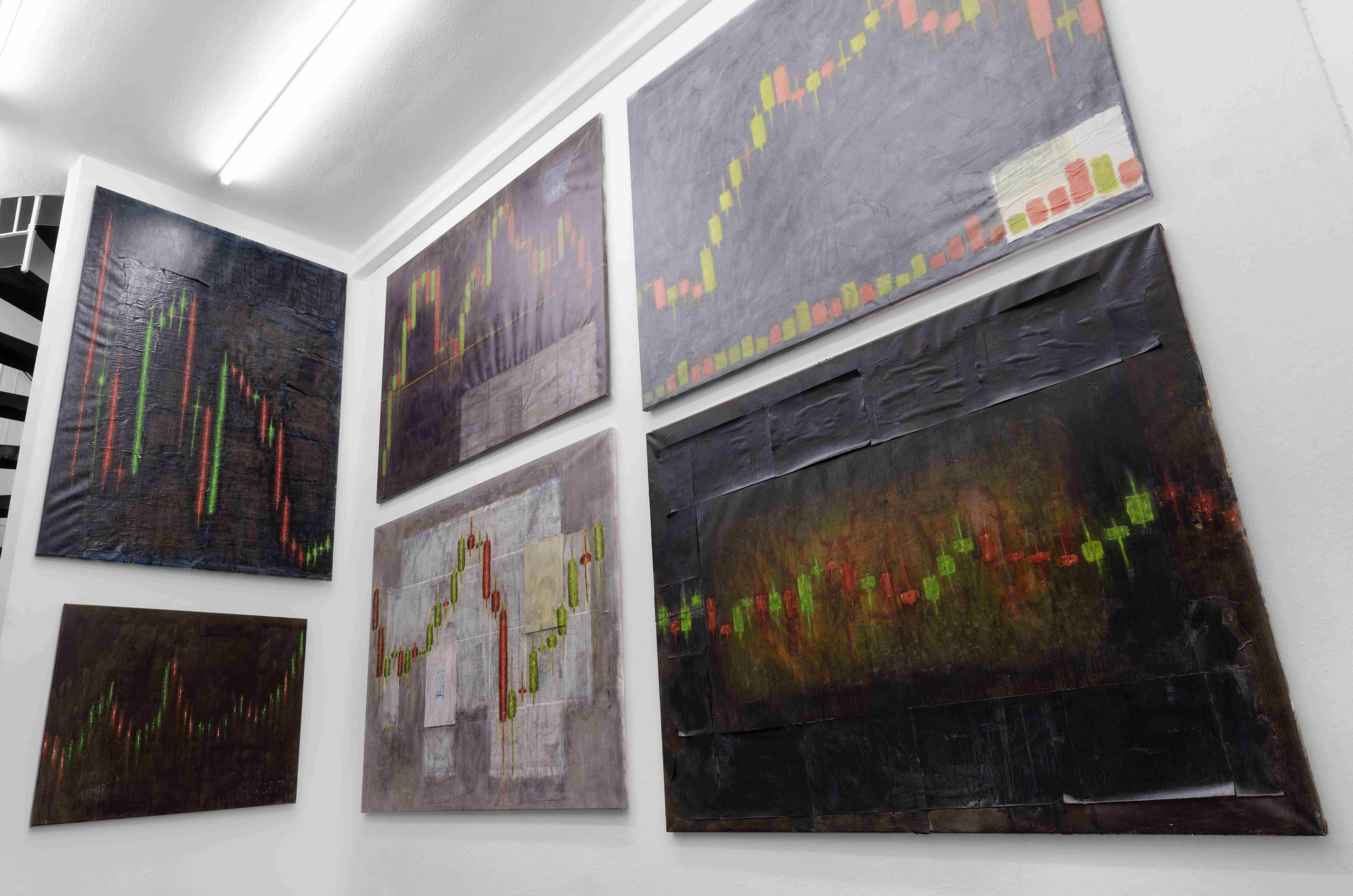 The paintings in this exhibition are representations of candlestick charts commonly used by traders and analysts to track the price movements of financial assets. Invented by a Japanese rice trader in the 18th century and popularised in the late 20th century by stocks and commodities traders, they have recently proliferated through the public consciousness and image circulation system through their extensive use with Bitcoin and alternative cryptocurrencies.