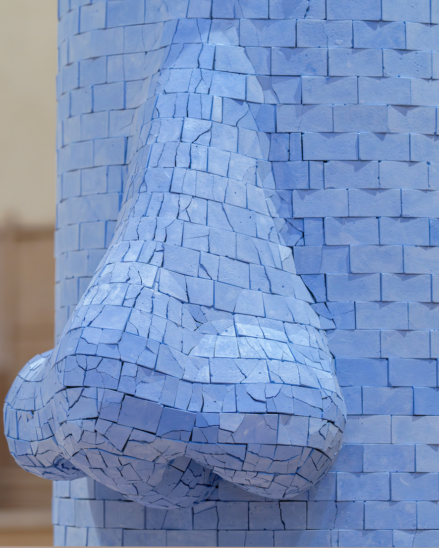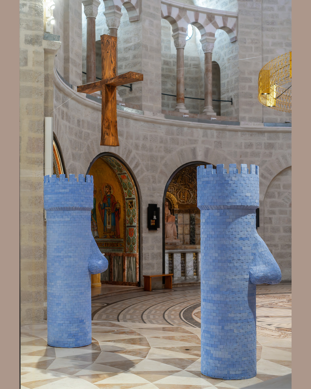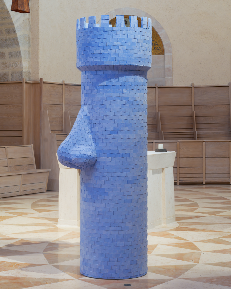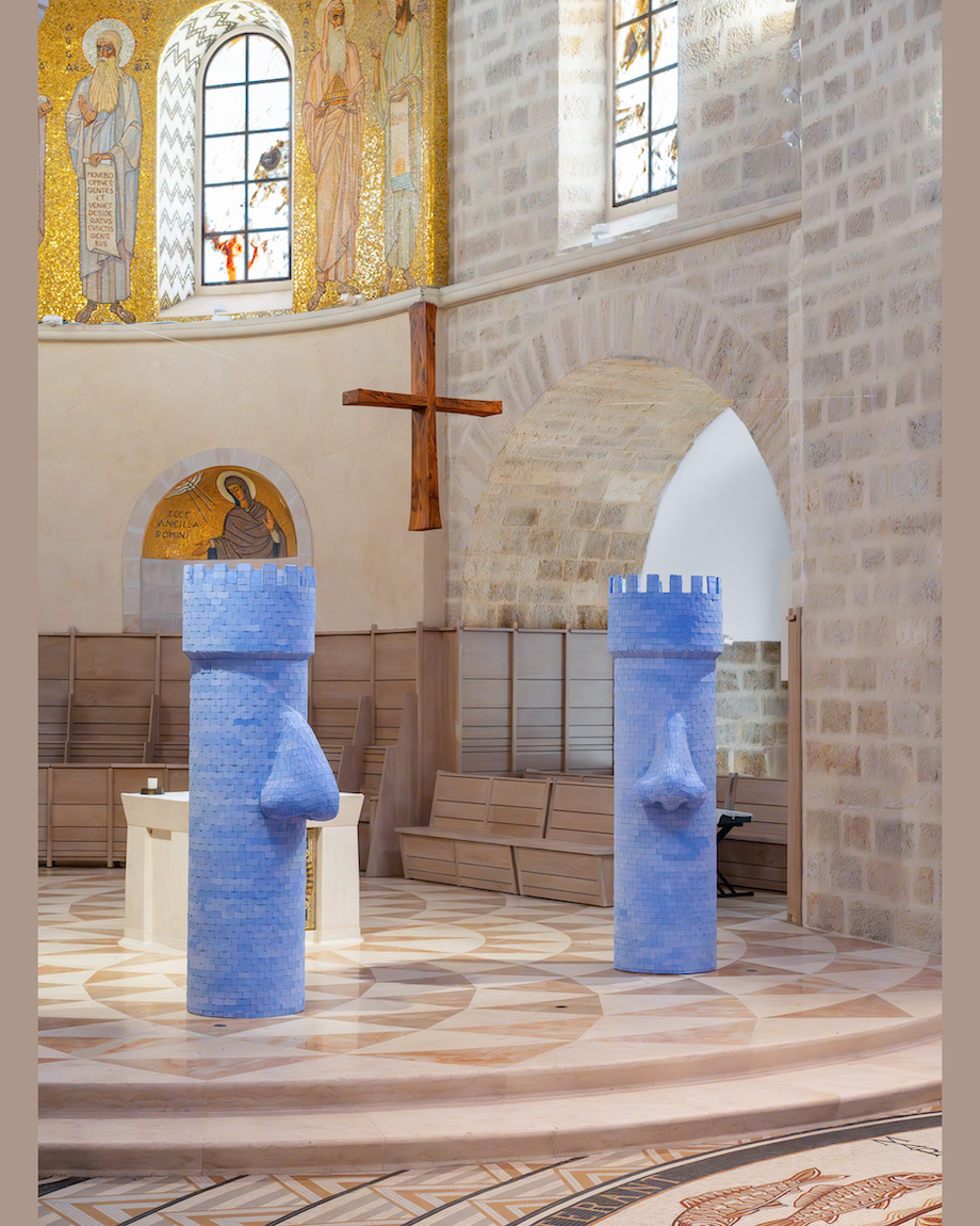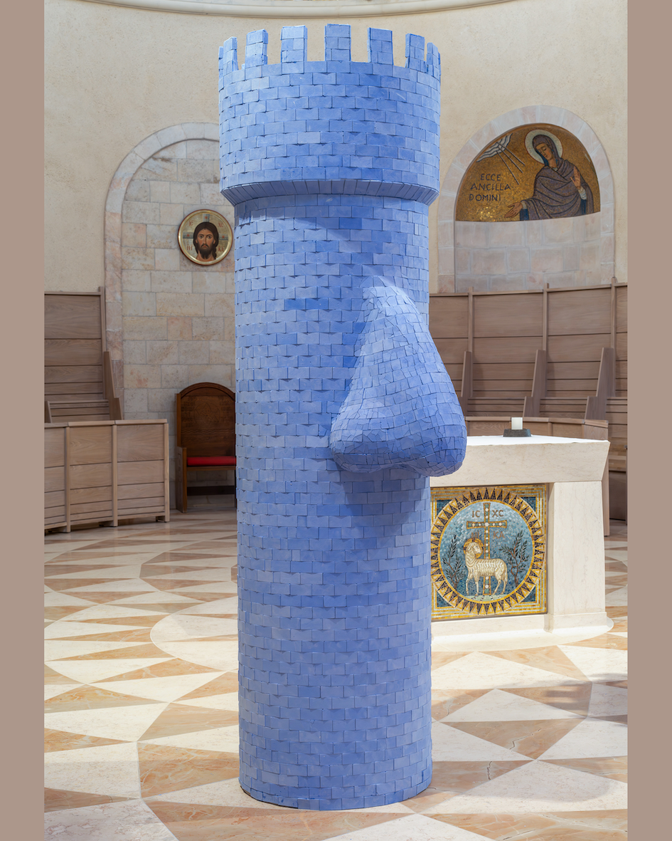 In his work, Zamir severs the local turret from its natural environment, detaches it from the walls of the Old City, multiplies it and places the turrets inside the exhibition space. He "turns them on their heads", brings them from the outside to the inside and thus gives them a different appearance. By placing the turrets in the new environment, the objects become functionless, they are taken from the structure they represent and are left exposed, ready to contain the new story that the artist will tell. Zamir added an organ to each of the turrets â a large nose. This simple action ridicules the powerful image and makes the turret almost infantile, and no less than that â human. Unlike the way turrets tower over us in reality â large and powerful â in the exhibition their scale is small, and our face-to-face encounter with them becomes less threatening. Each of the turrets has a different nose, with a different character, and when we look at these turrets we are attached to them.