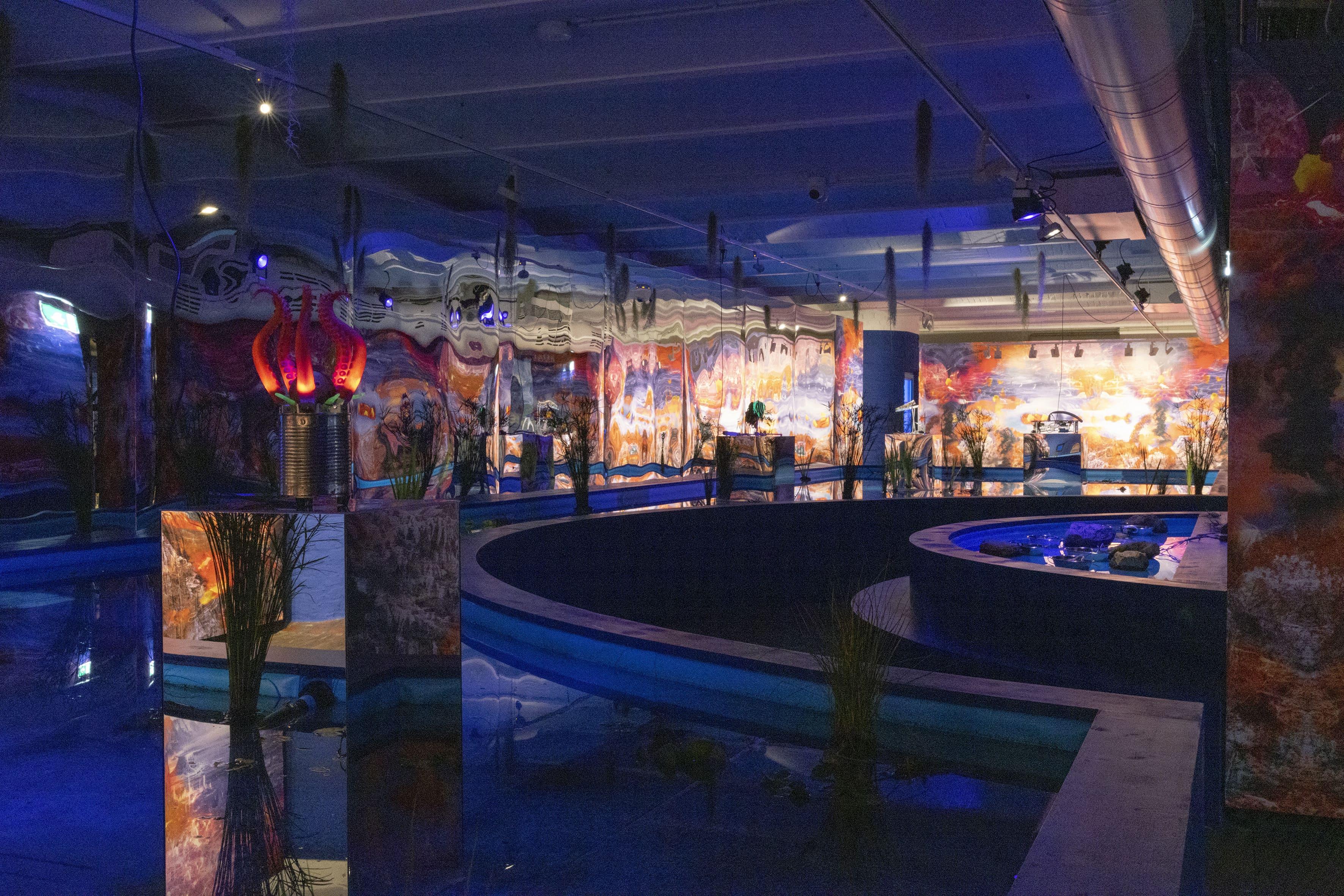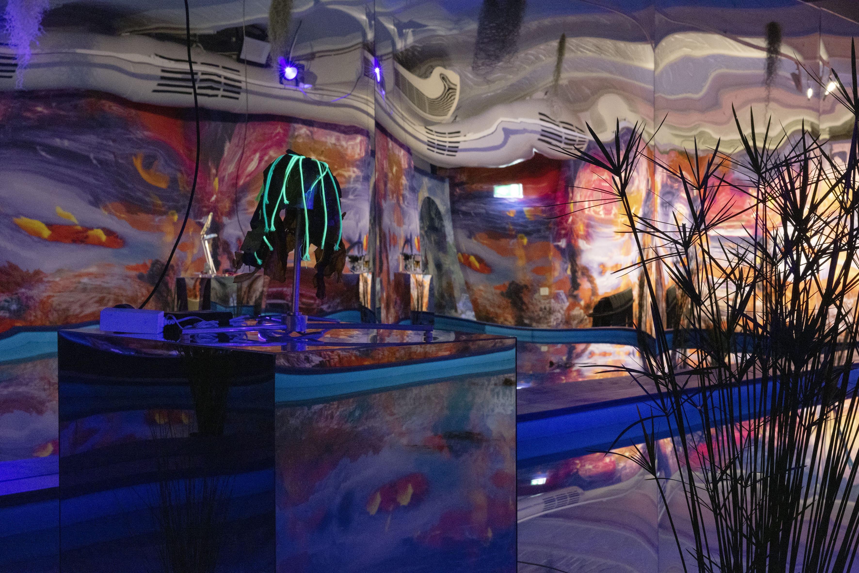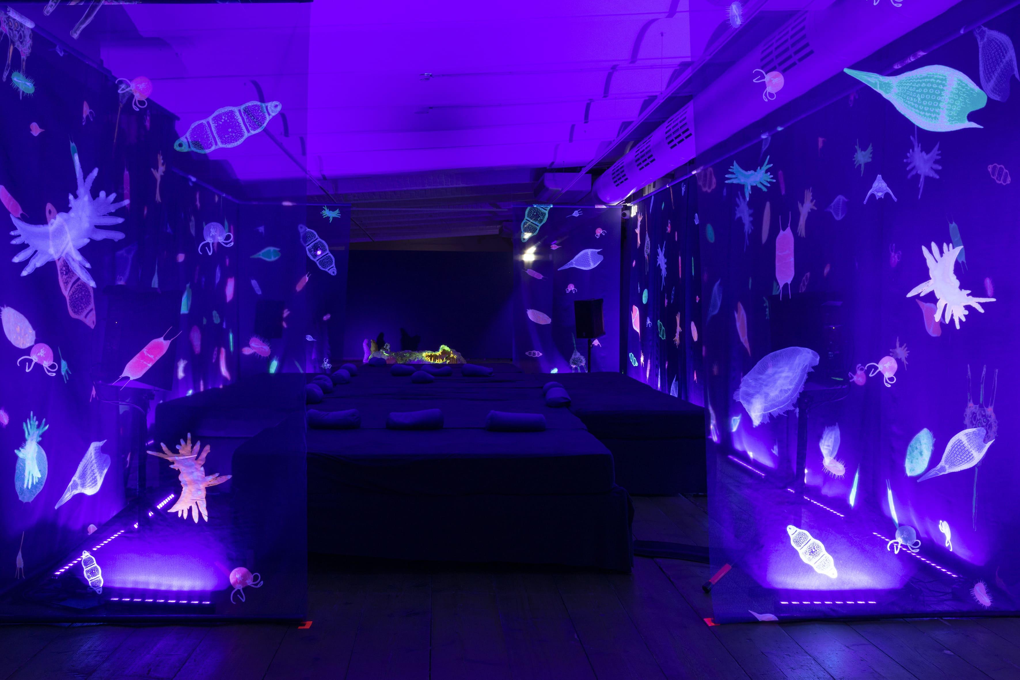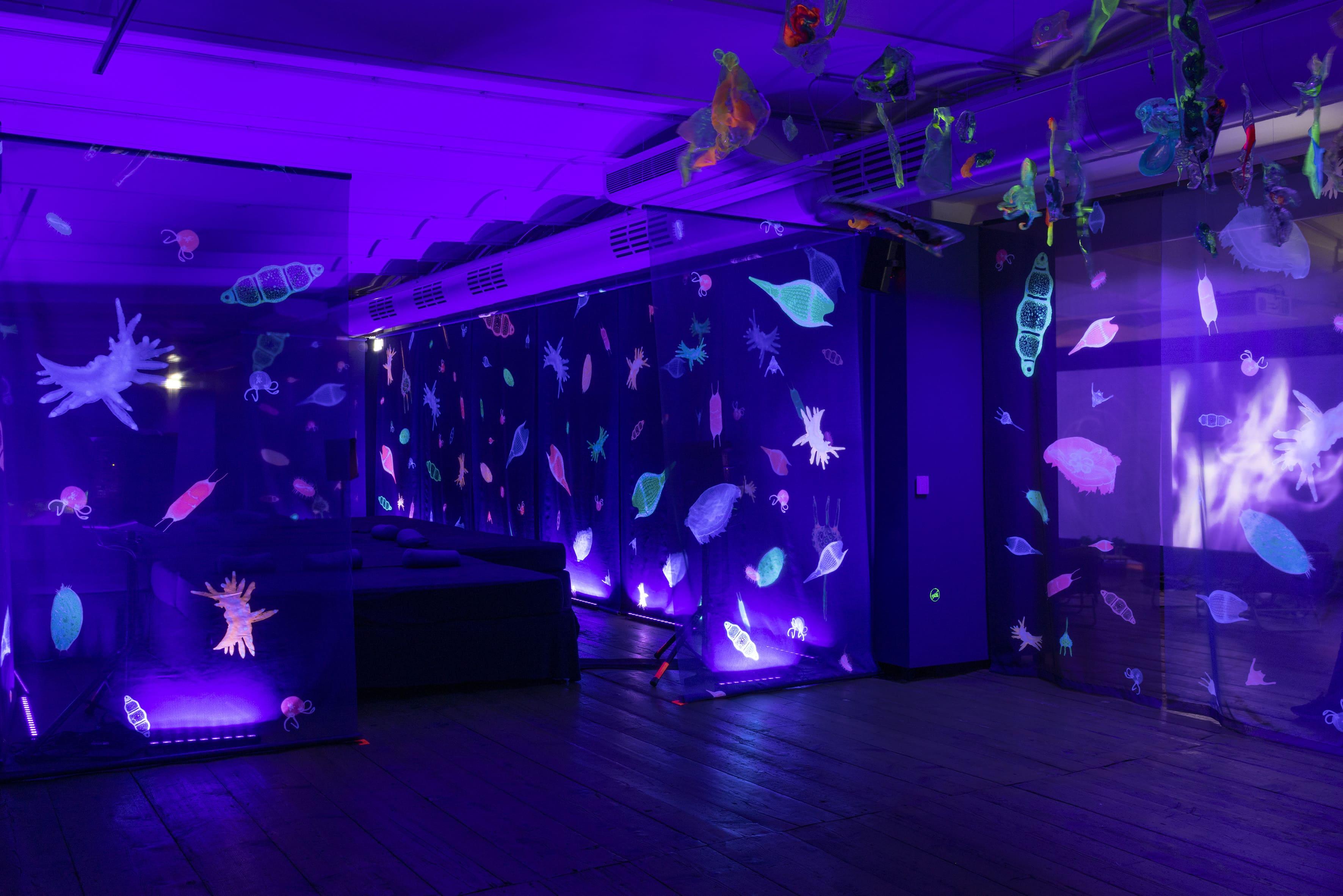 Developed specifically for the KunstHausWien, the multisensory exhibition presents two worlds on two levels: starting from the Archean Eon, when the first life arose on the Earth thanks to an oxygen-rich atmosphere, the scenery transforms into a magical fluorescing underwater world that enables visitors to plunge to the depths of an ocean populated by fantastic creatures and microscopically tiny phytoplankton.
