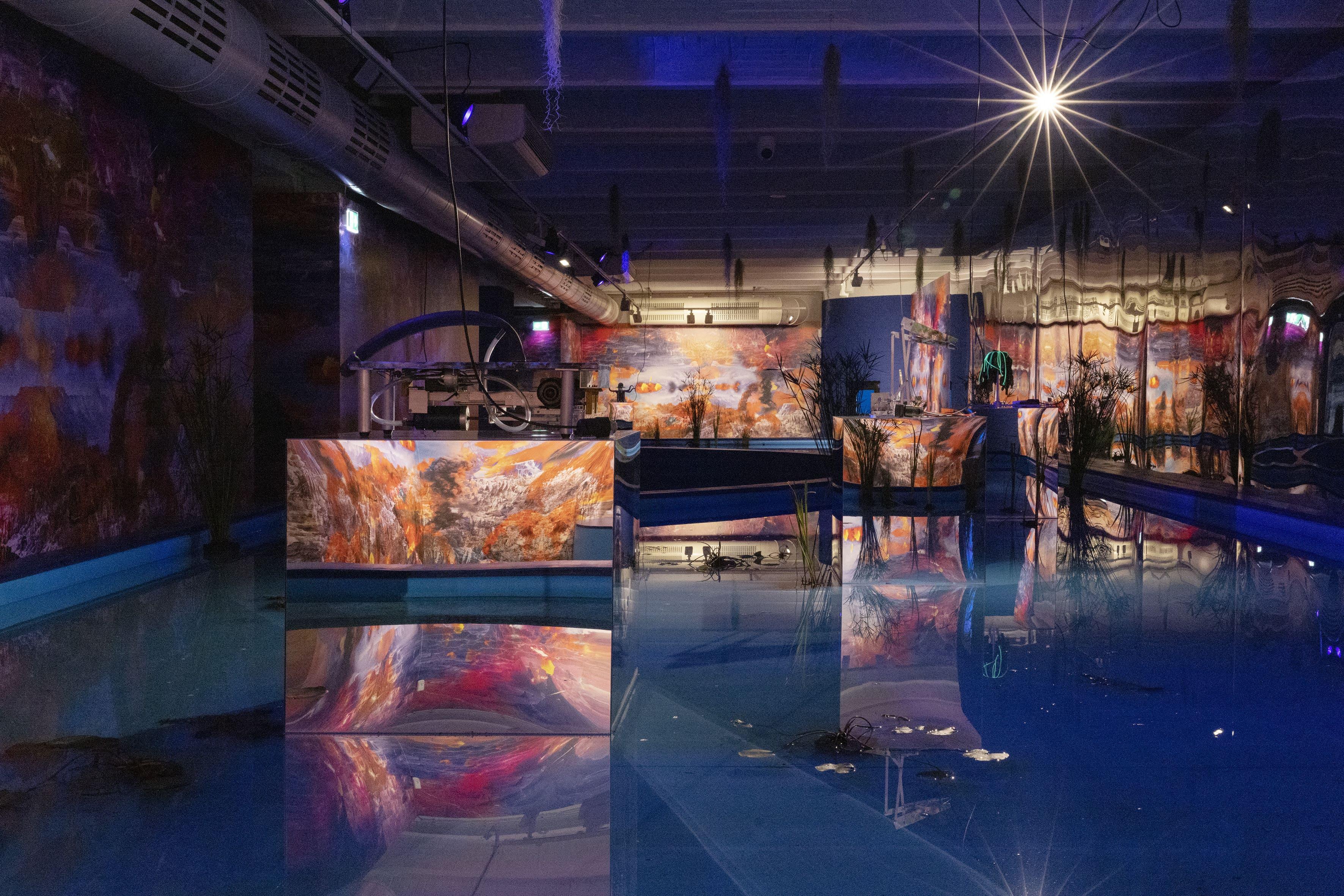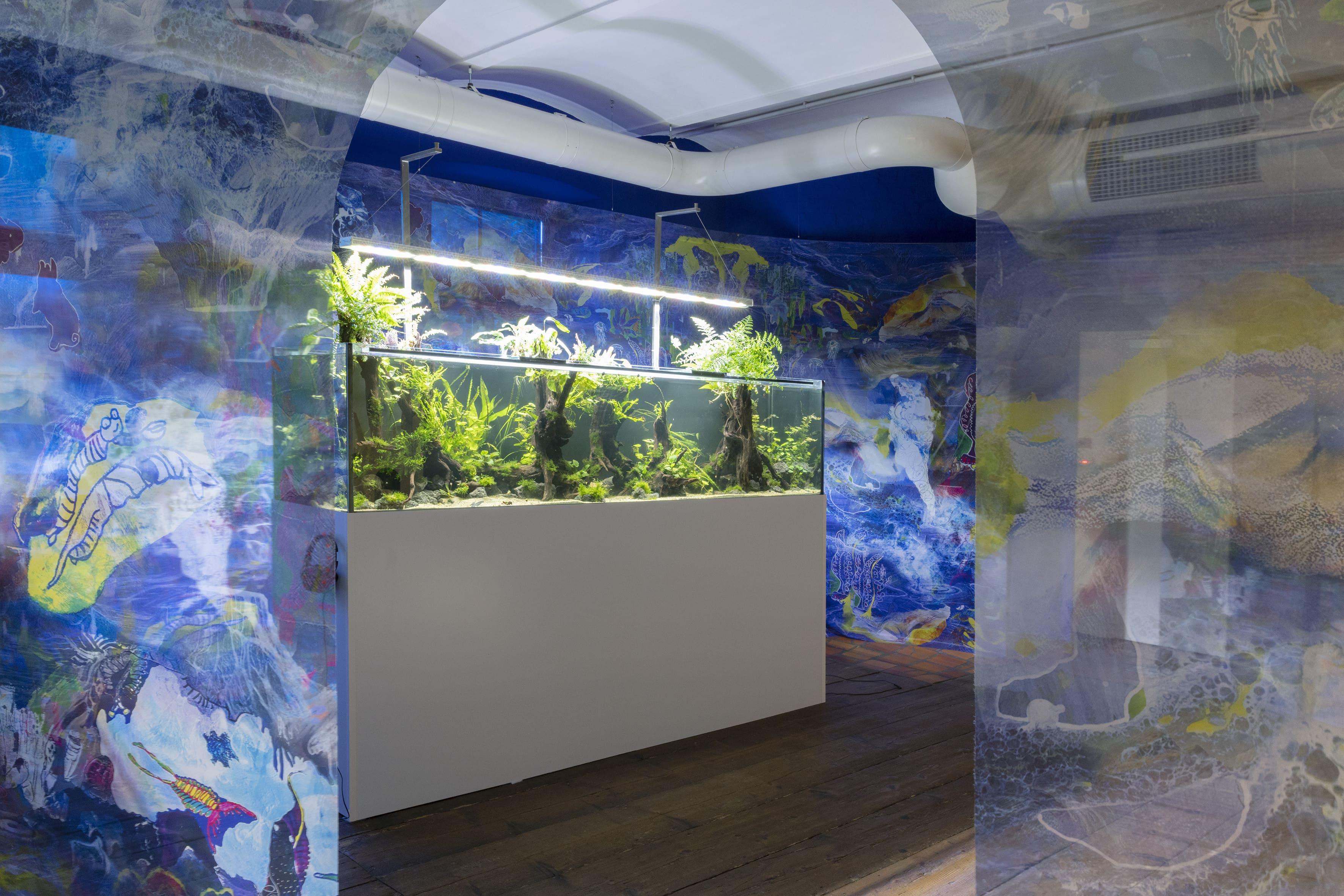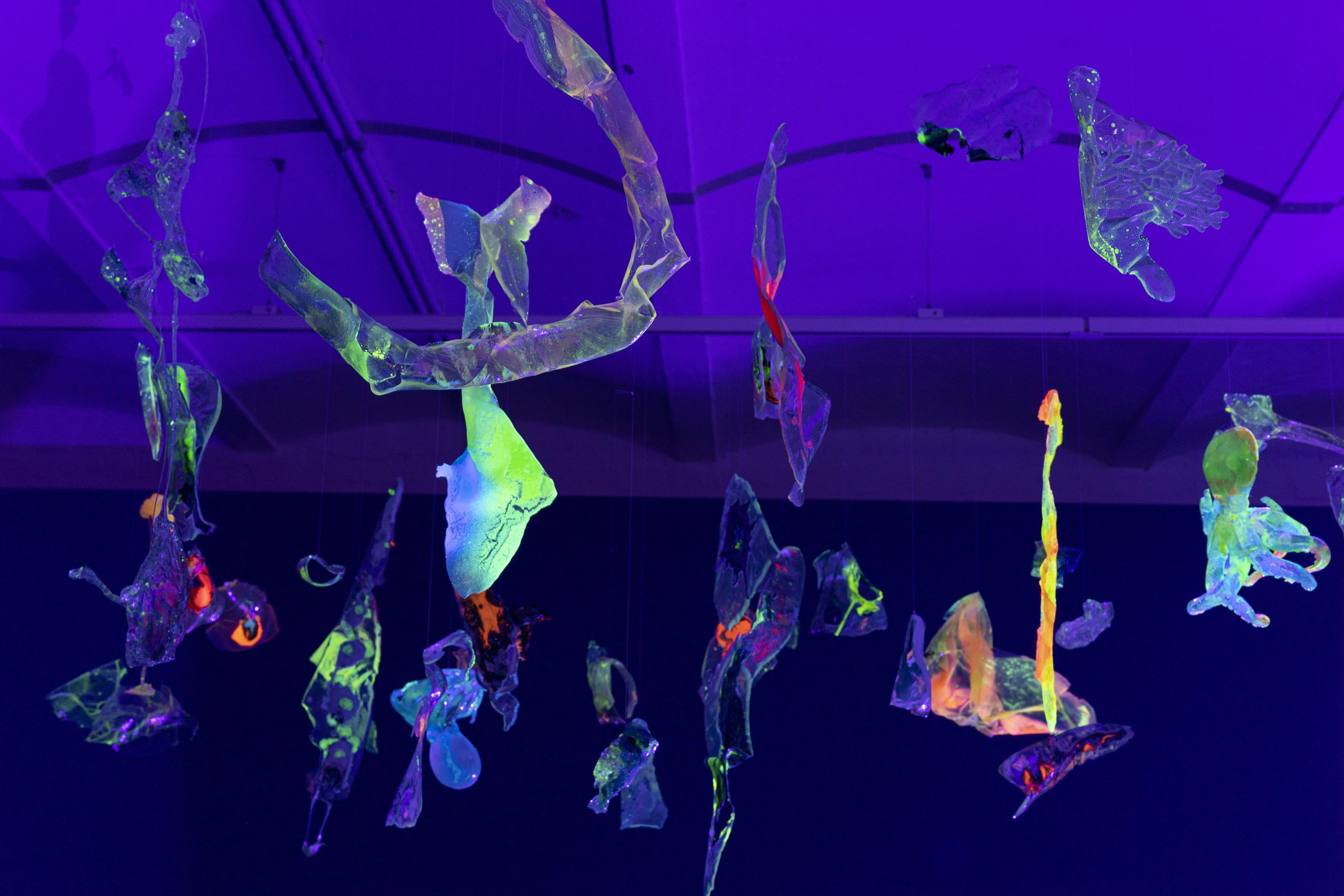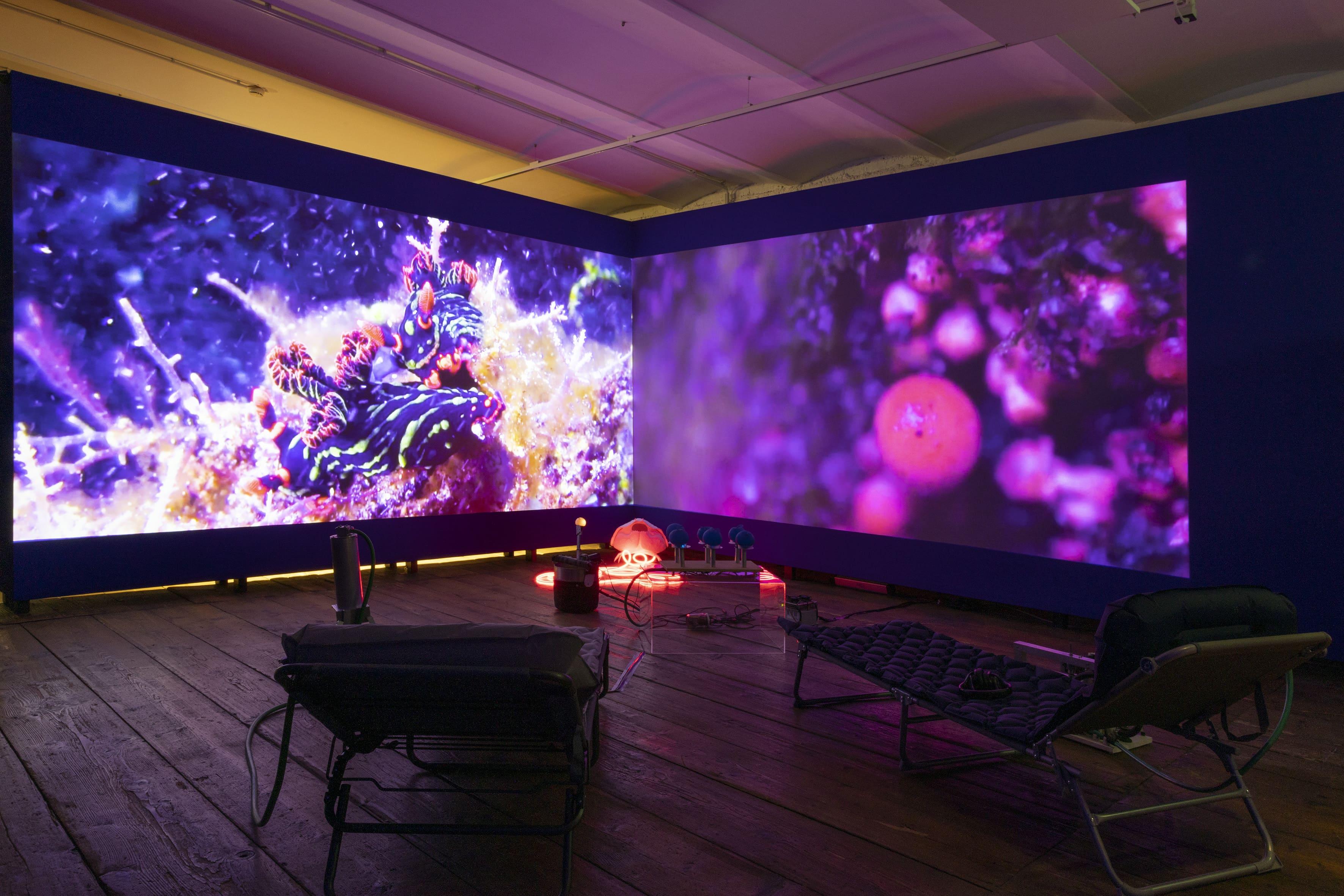 Developed specifically for the KunstHausWien, the multisensory exhibition presents two worlds on two levels: starting from the Archean Eon, when the first life arose on the Earth thanks to an oxygen-rich atmosphere, the scenery transforms into a magical fluorescing underwater world that enables visitors to plunge to the depths of an ocean populated by fantastic creatures and microscopically tiny phytoplankton.