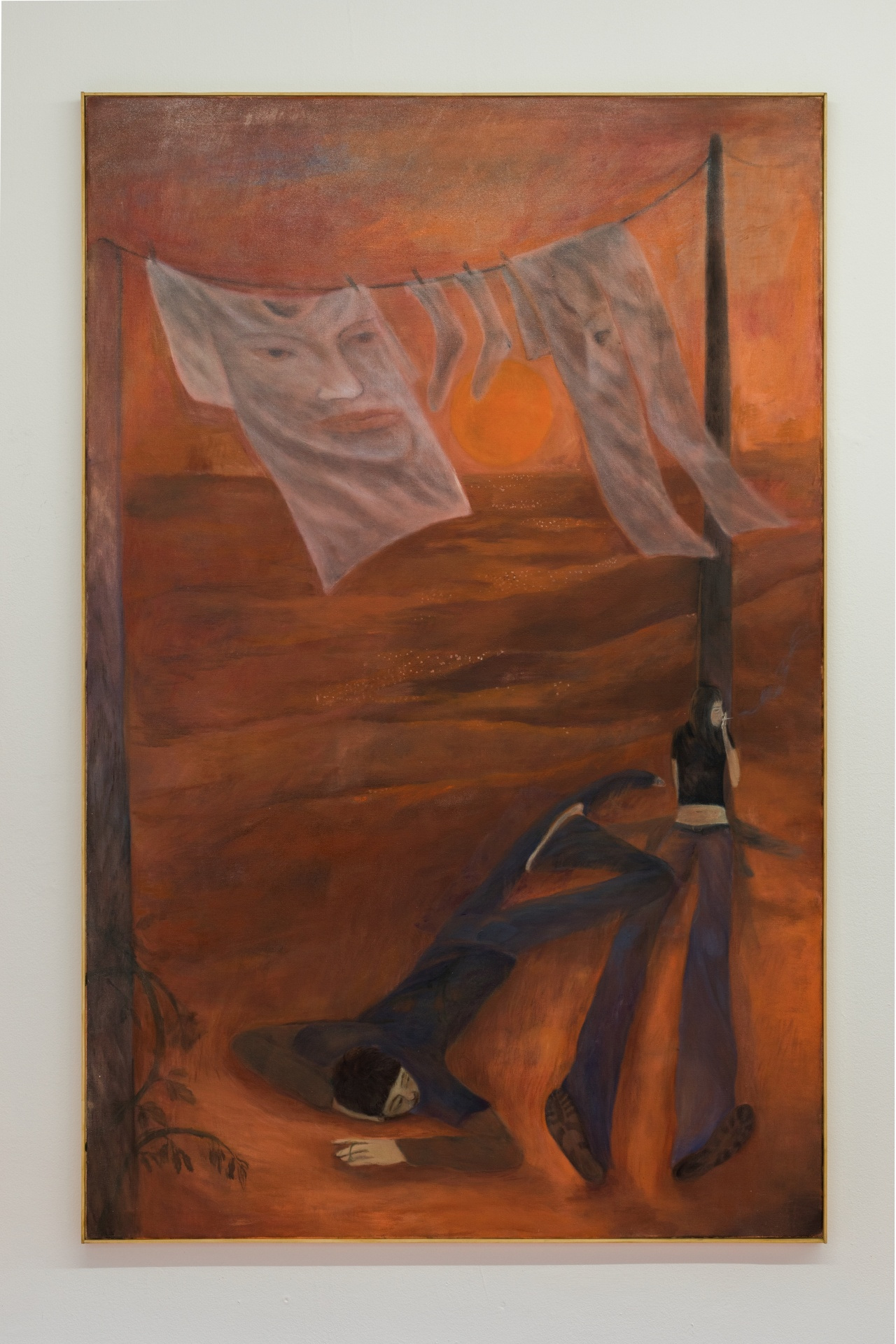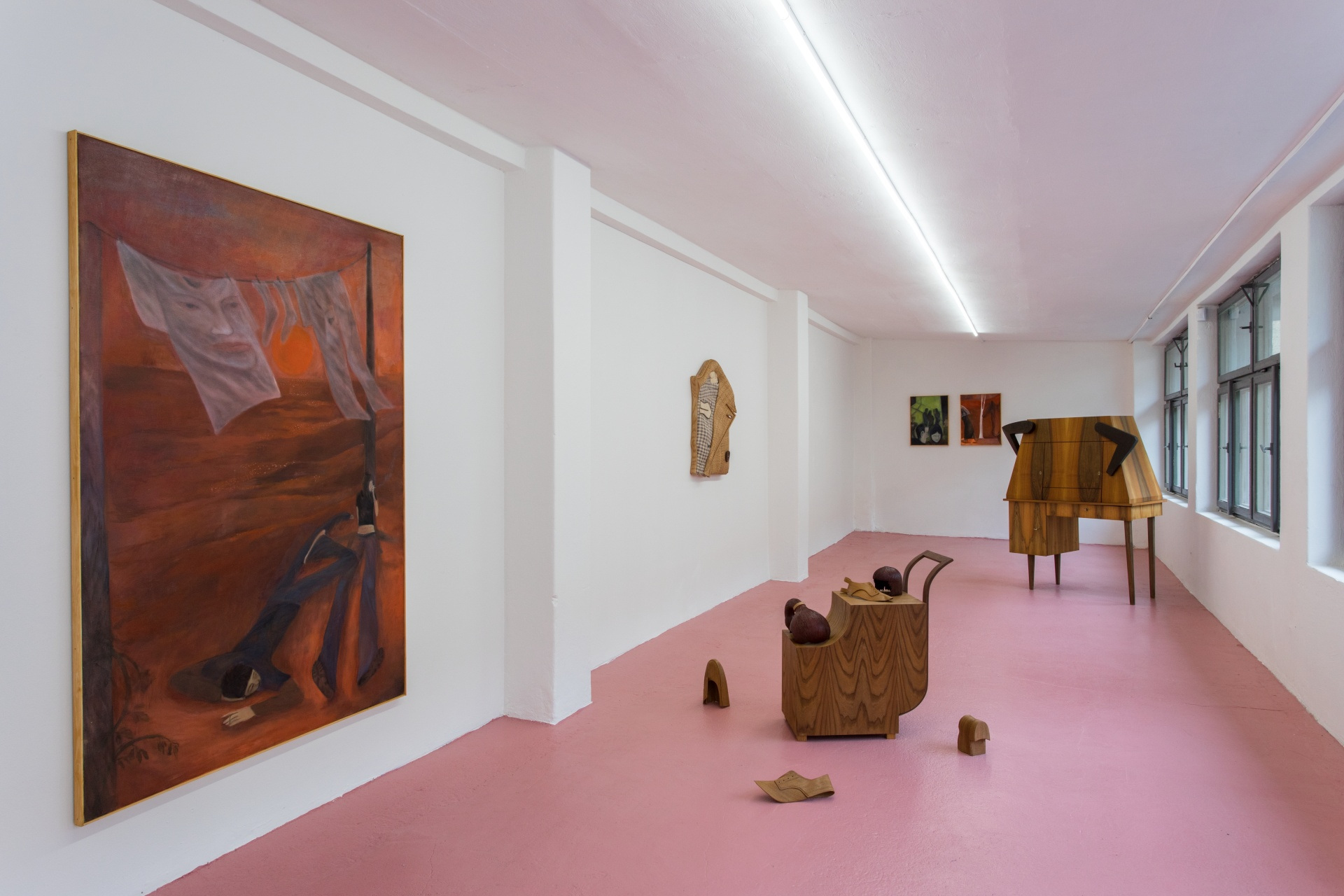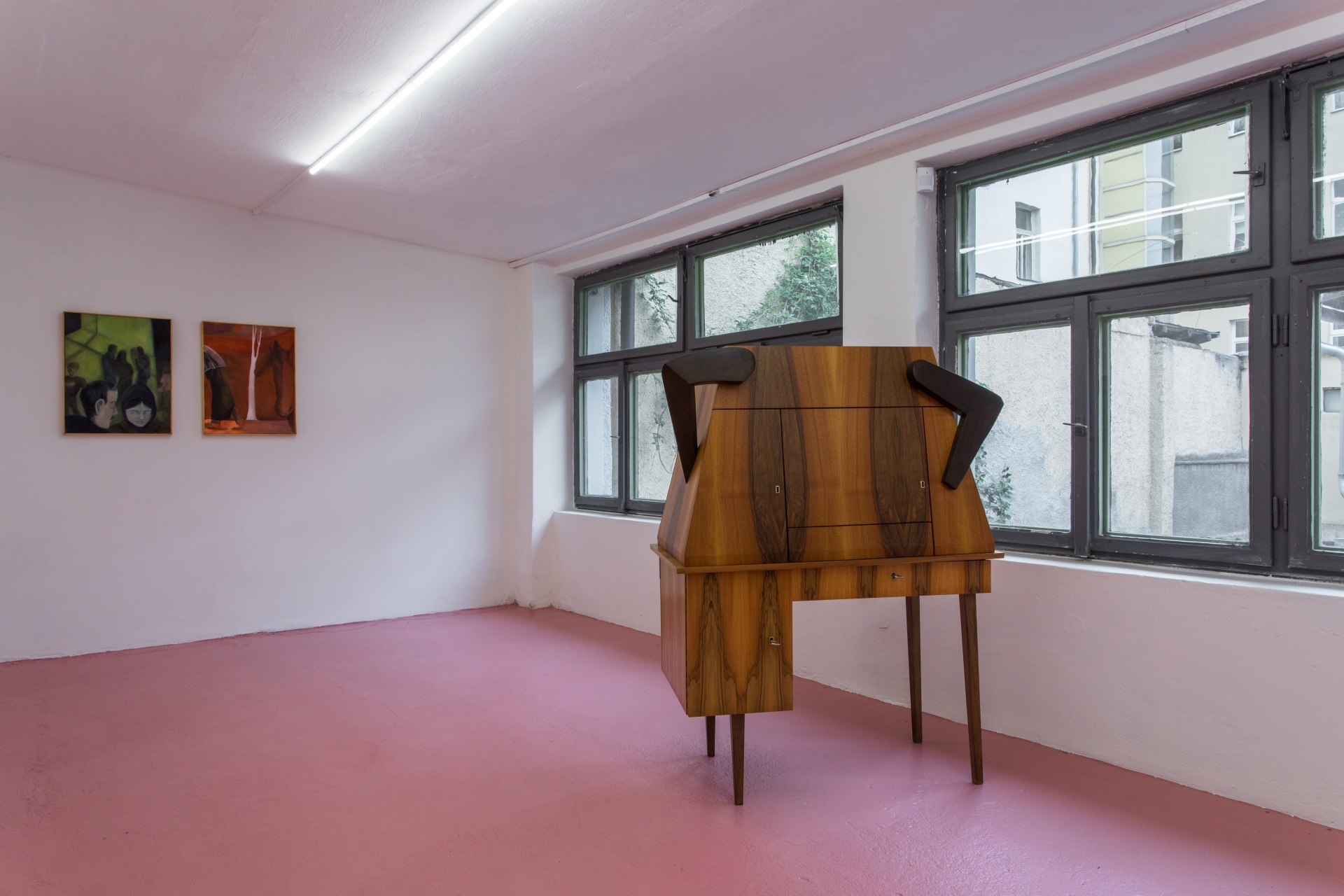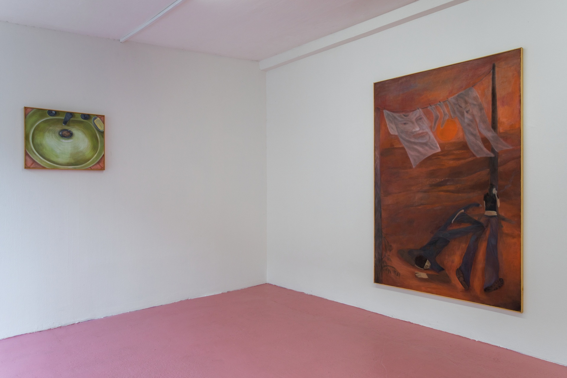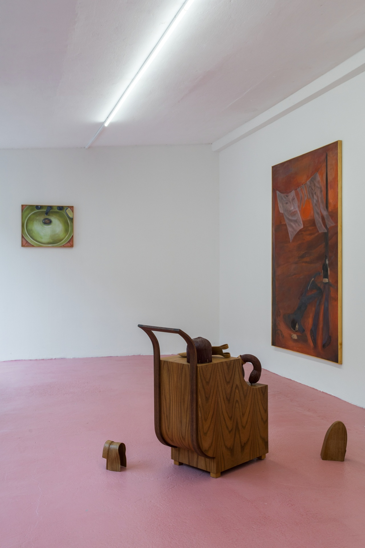 A quiet melancholy and a certain type of nostalgia fills the intimate space of the courtyard space of hunt kastner. In the hazy flood of the blushing floor, whose reflections softly lick the walls, familiar objects of domestic life appear at first glance: an antique wooden cabinet, a wig cart, kicked-off shoes. A few canvases in warm colours furnish the austere white surface of the walls. The air almost seems to smell of bergamot tea, the letterbox full of unopened post, and the telephone, the one next to the brass ashtray, relentlessly droning in the distance, offering a smoky evening glass of wine. But beneath the veil of the warm familiarity that Sofia Tobiášová and Tobias Izsó are building, one can sense a tension. As if by our presence, we have intruded on the private lives of things, become part of a moment when they too need to take a moment to breathe, giving us a glimpse of their unmasked face beneath the surface of the mundane, when the mid-century cabinet shows its own hands and the drying laundry trapped in the canvas shows its face.