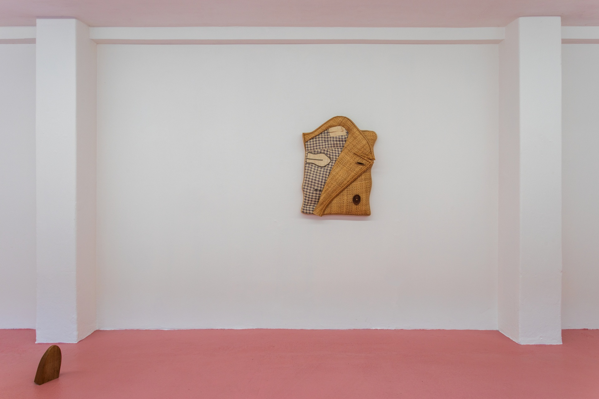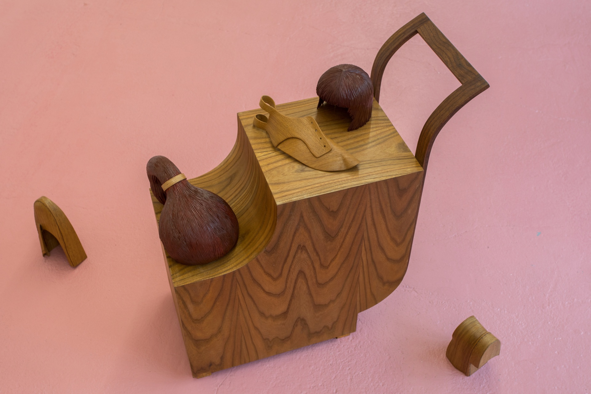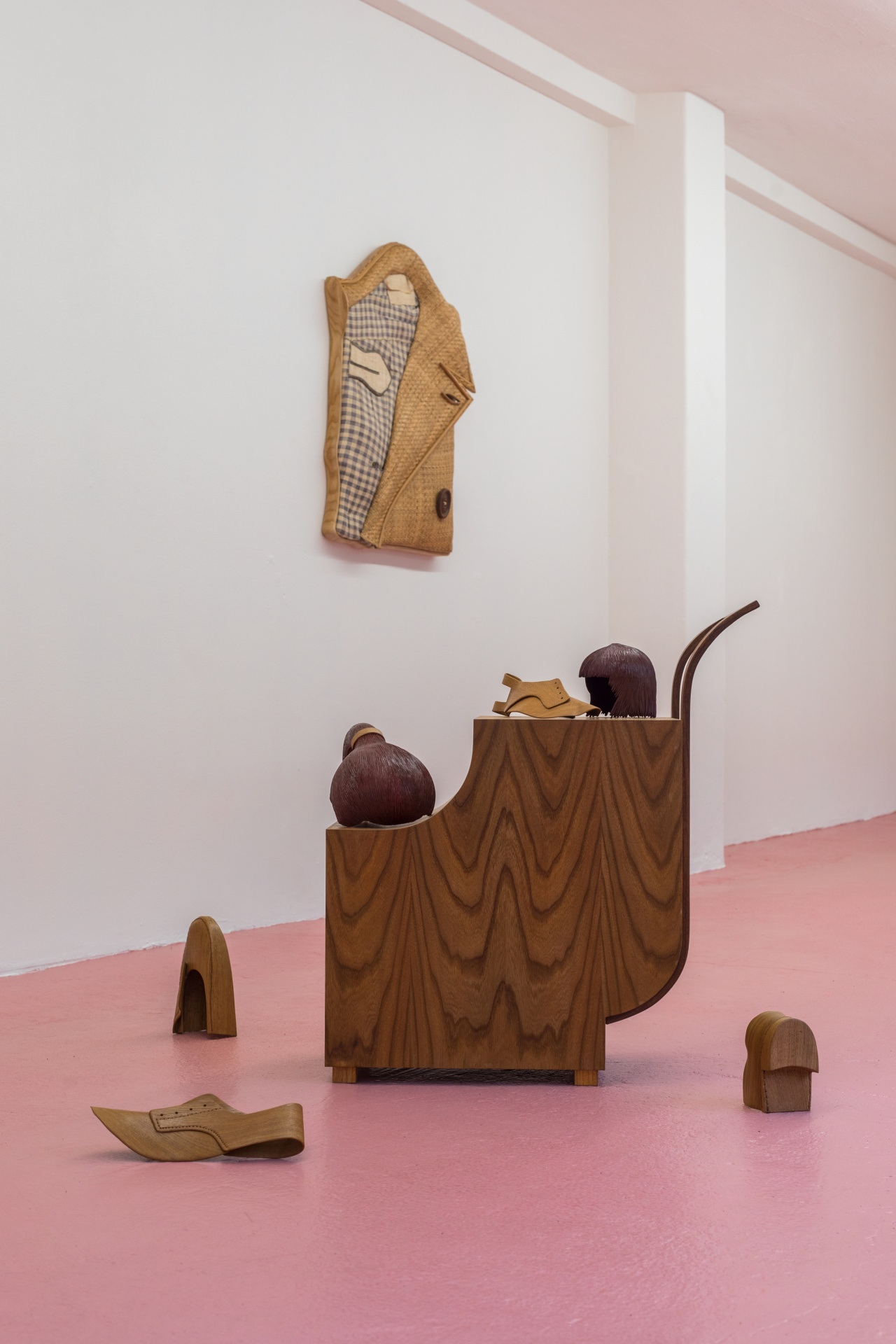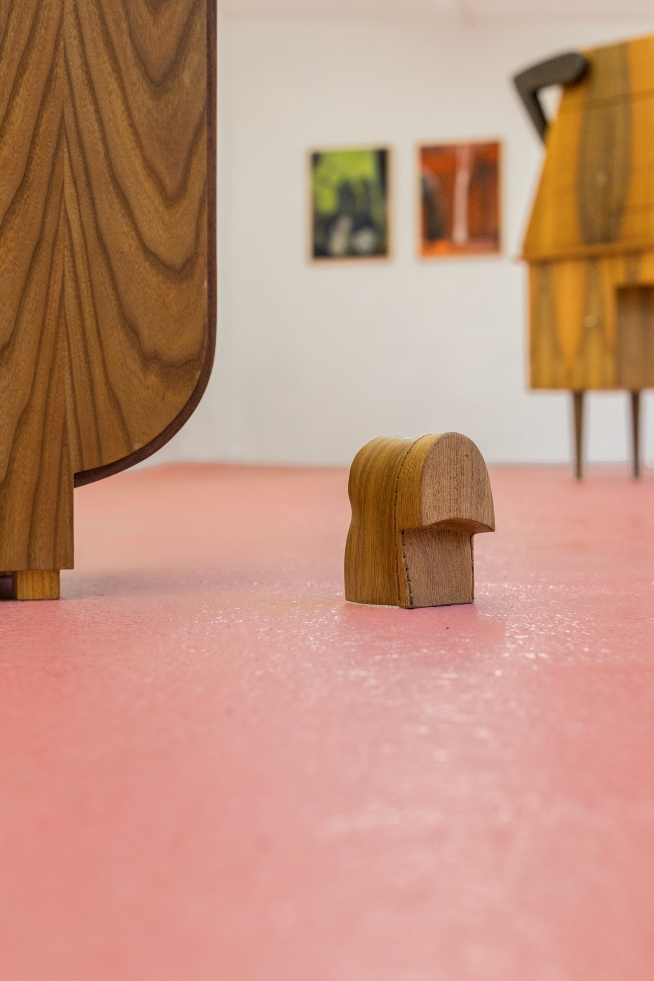 The anthropomorphic quality of Izsó's mid-century cabinet evokes a sense of unease when we're not sure whether it/he is attacking us or about to embrace us, just as when the wispy wig and leather derby shoes are corroded in material that is not their own. The finely crafted veneer that Izsó uses on the surface of his objects is reminiscent of a performative shell - how much pain does it take to step through a new fashionable pair of shoes, and how bittersweet is it to put away the wig after a long evening of socializing? And what does their silent presence actually tell us about ourselves? The well-being of artefacts seems to have abandoned their function; they wake up and claim their own fate. The quotidian and its authentic representation becomes a metaphor for the complexity of the self, where even furniture or clothes struggle with existential anxiety.