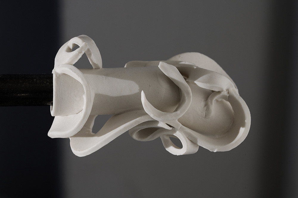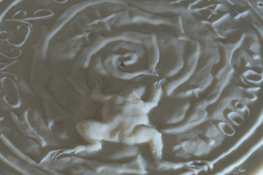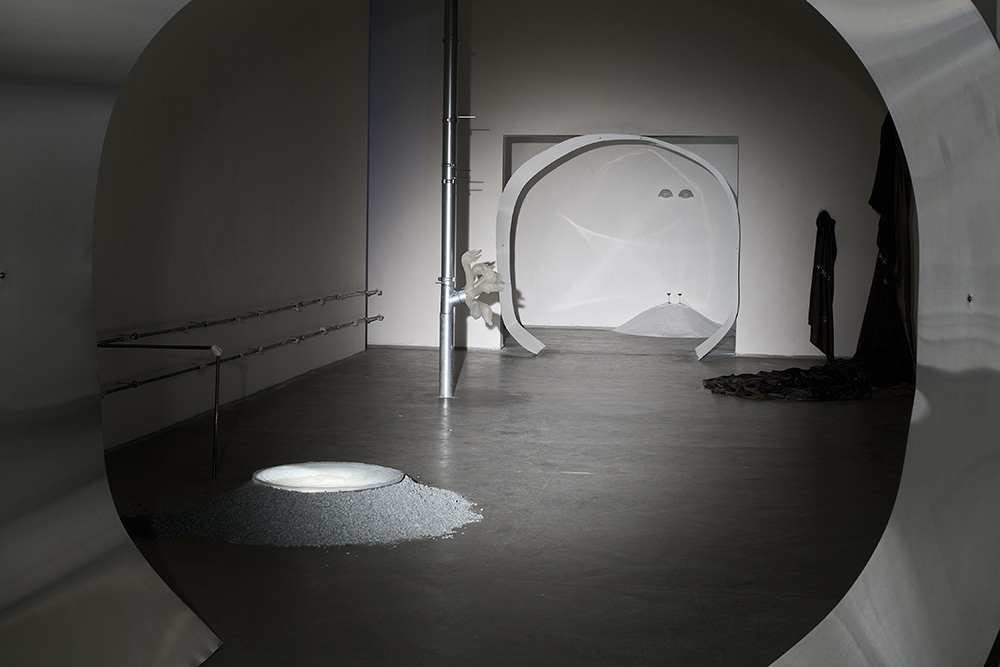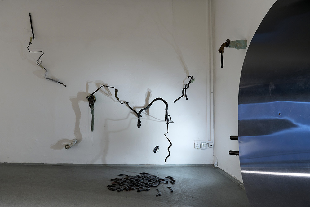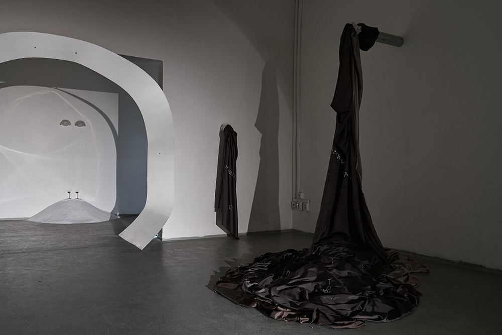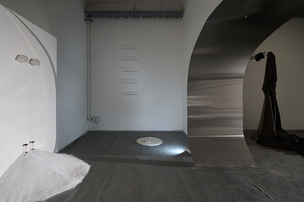 We stage the meeting place; the dream becomes a scene to which we can repeatedly return. We interpret the form of this event for each other; every part plays a vital role in the whole, permeable to the others. We enter from the light, moving deeper through the pipeline into layers that we attempt to illuminate and subsequently decipher. Each material represents a different source of emergenceâthe black, hardened stain urges us to imagine its nature. It is a boundary point through which organic matter becomes toxic, waste turns into a resource. The industrial pipeline, adorned with white porcelain, is a partially revealed skeletonâa contrasting play of seriality in varying scales, transforming the perception of building materials. Information emerging from the pipeline occasionally materializes as the flow of a substanceâthis substance is a depicted message, a carrier of sentences spoken into emptiness, whose meaning remains untransferable. At times, the channel suggests the presence of a mythological space. From gutters, we sense columns; shadows become phantoms; soap gargoyles in the shape of swan heads take on their protective function. They form an aestheticized interface between us and a liquid that has dystopically ceased to emerge.