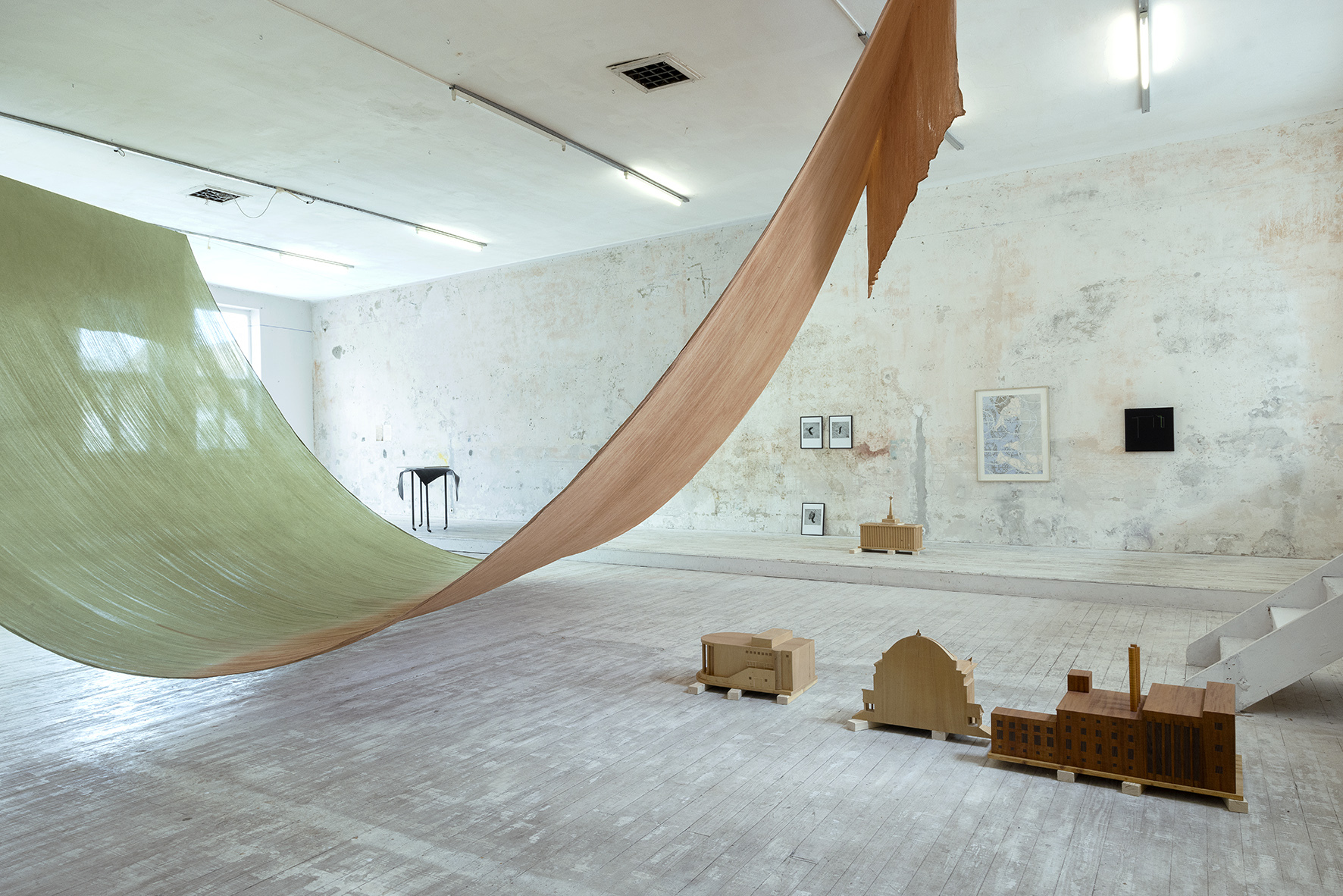 Constanze Schweiger, Green Earth for Schattendorf, earth pigment, raw and burnt, cotton muslin, steel rope, 1500 x 500 cm, 2025
