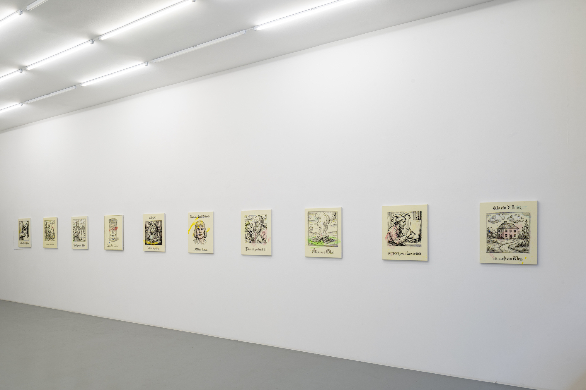 Each image is captioned, adding an additional layer to the work. These phrases, sometimes in German, sometimes in English, are reminiscent of classic proverbs, yet are always twisted in an amusing and absurd way. Here, we encounter not a raised index finger, but a subtle wink. The texts bear a clear meme aesthetic and appropriate the logic of internet-based forms of communication – short, pointed, ironic.