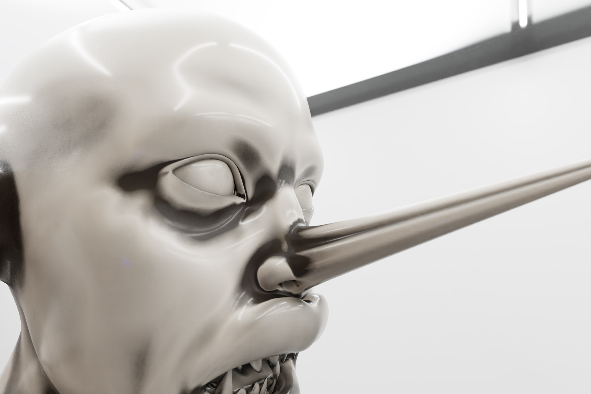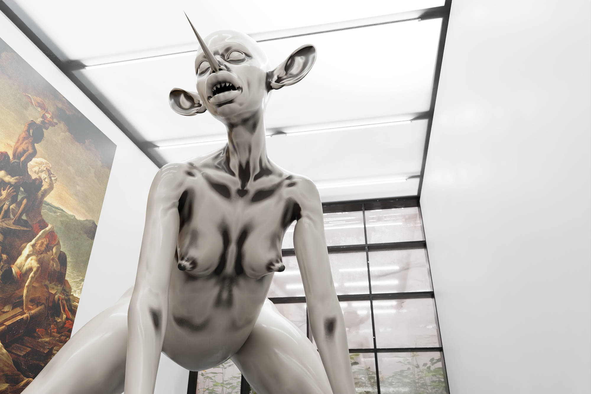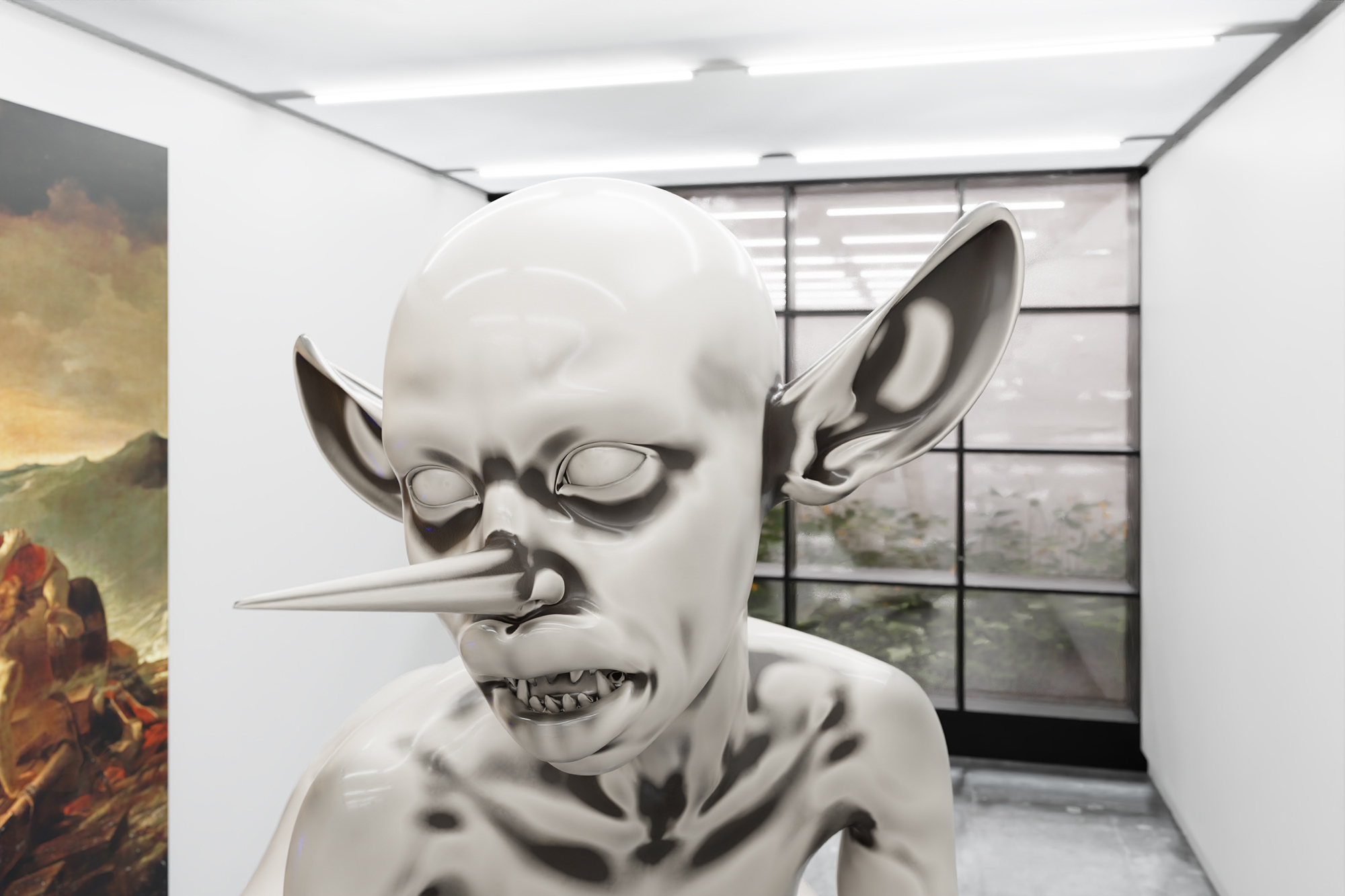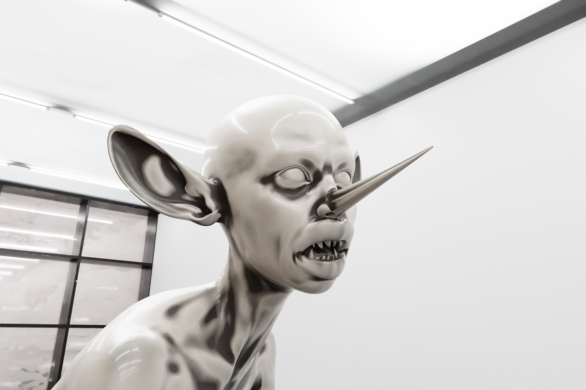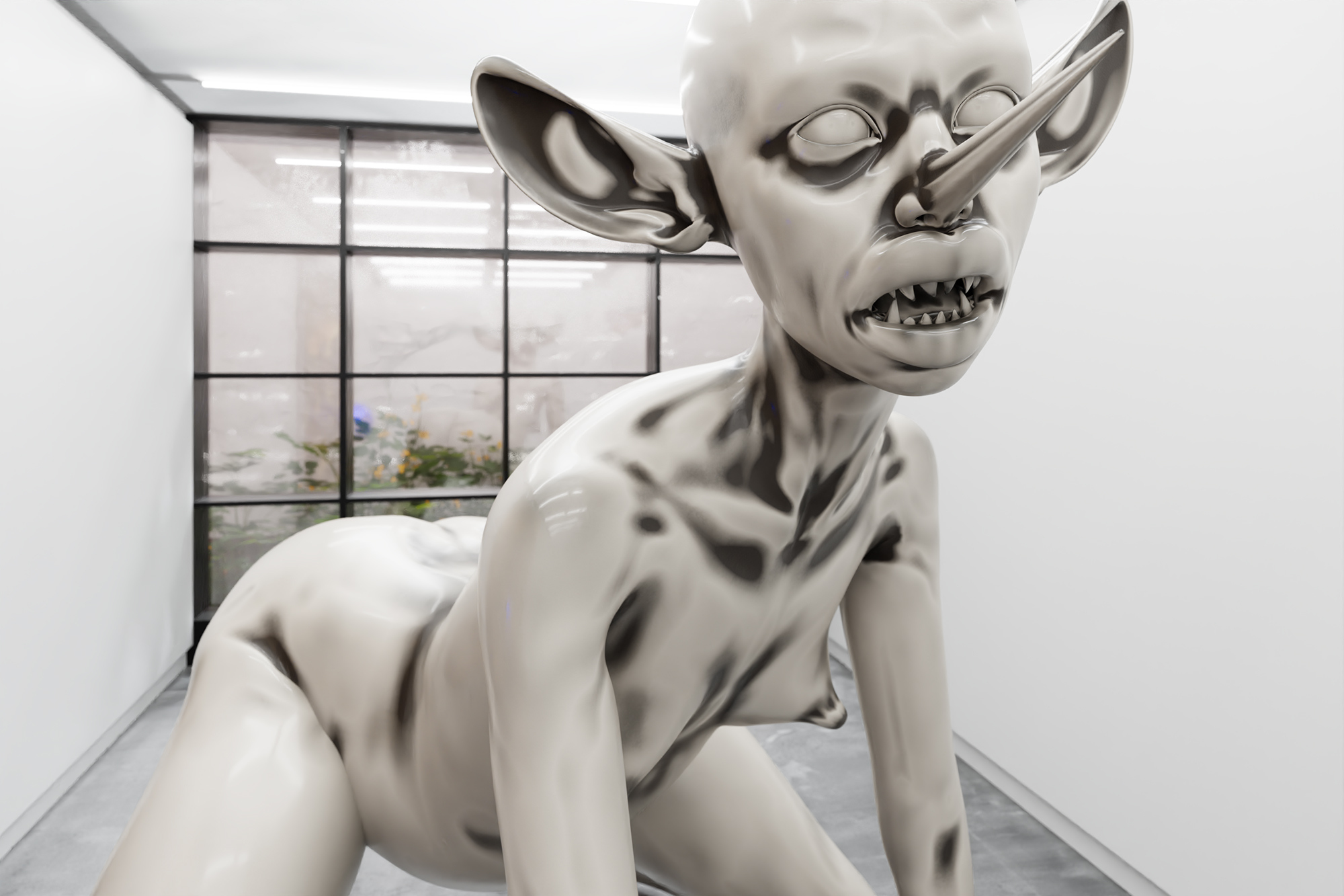 A towering synthetic sentinel, the Goblinâs glossy shell cracks with implied violence. In refusing to be anything but veneer, she refuses to disclose interior, like Baudrillard made grotesque: her glossy body does not conceal absence or mask violence, but rather embodies a violence wrought through its prettiness, the force of the superficial, the denial of depth, and the suffocation of context. She is a kawaii plasticity that threatens, like a blind box figurine deformed, or a Chobits persocom with a motherboard corroded. Like Koonâs balloon dogs, she insists on surface, but unlike Koons, her gleam corrodes in its own sepsis.
