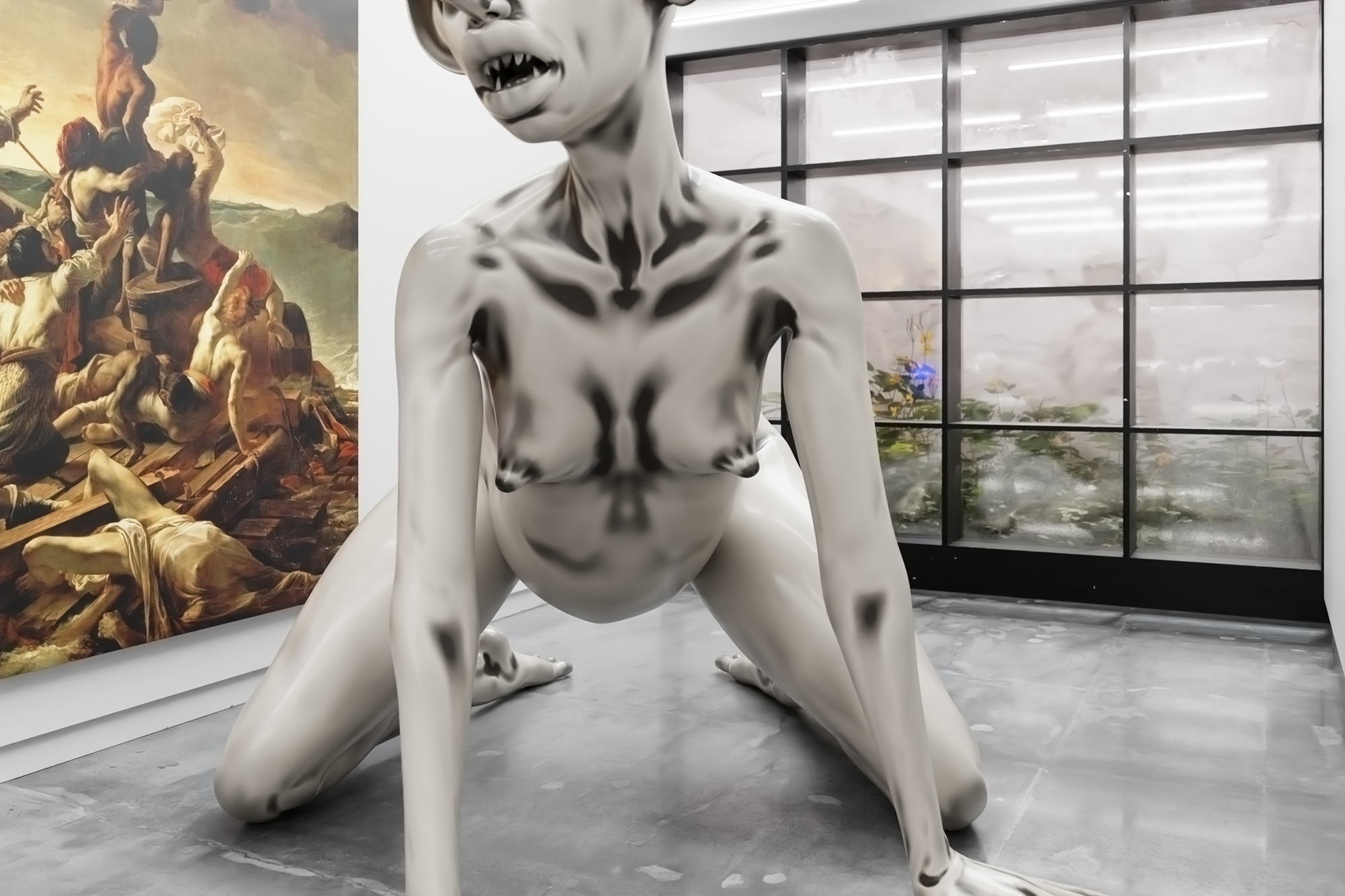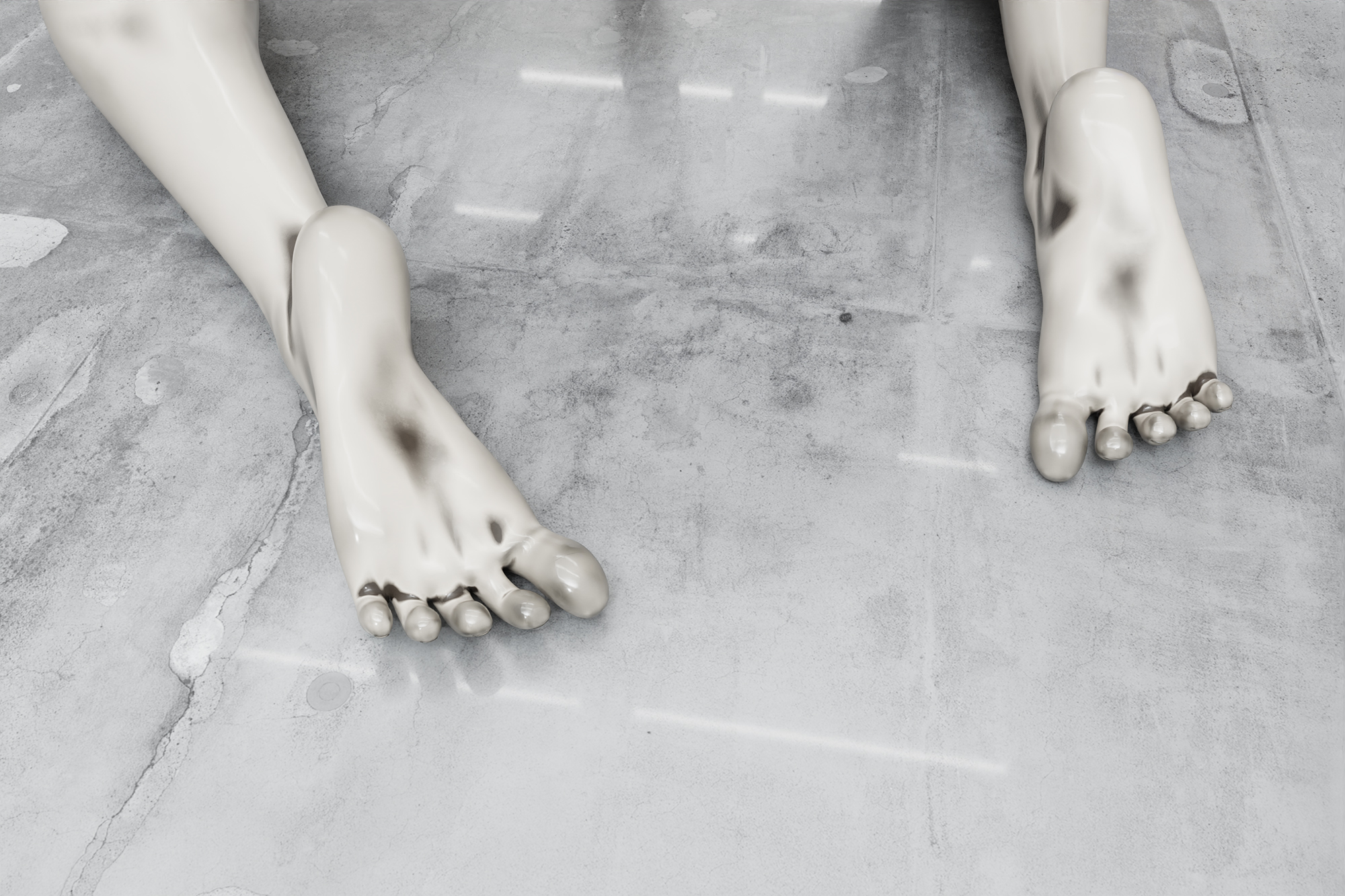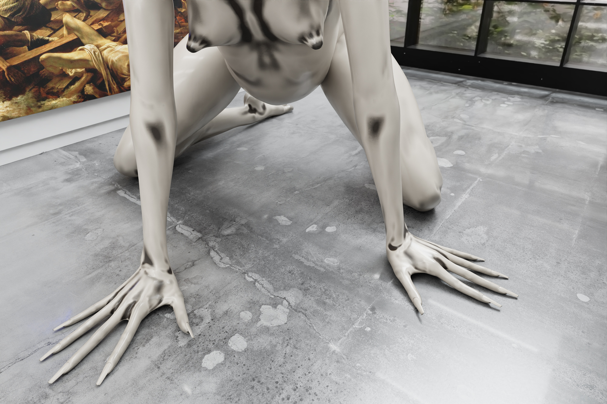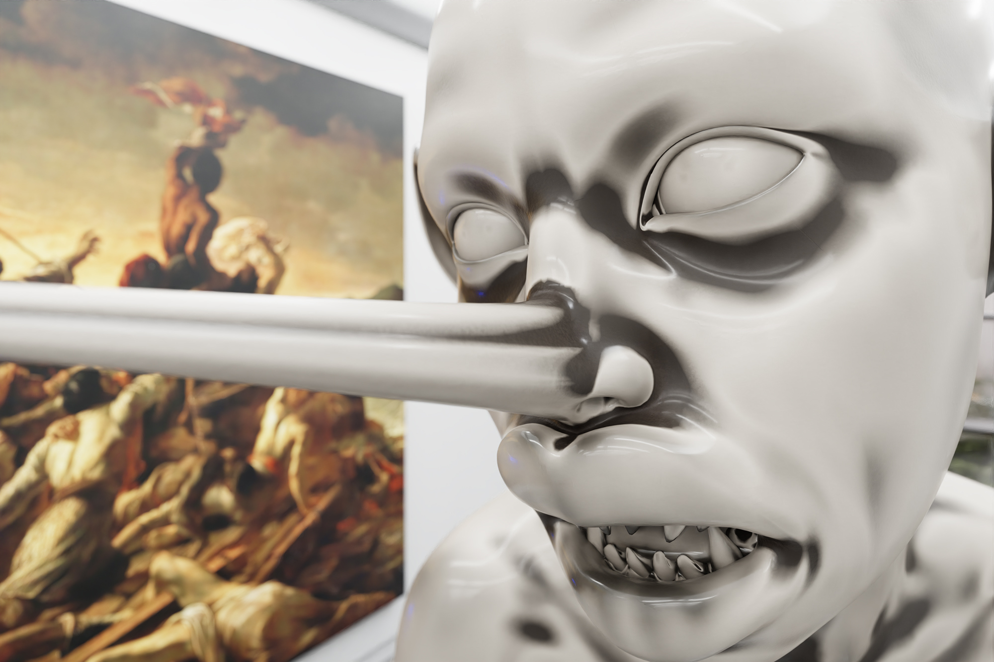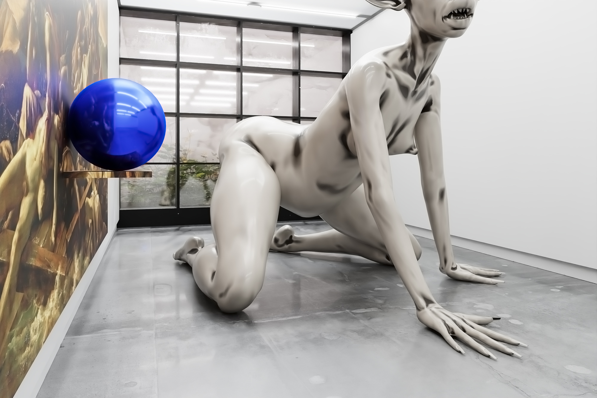 A towering synthetic sentinel, the Goblinâs glossy shell cracks with implied violence. In refusing to be anything but veneer, she refuses to disclose interior, like Baudrillard made grotesque: her glossy body does not conceal absence or mask violence, but rather embodies a violence wrought through its prettiness, the force of the superficial, the denial of depth, and the suffocation of context. She is a kawaii plasticity that threatens, like a blind box figurine deformed, or a Chobits persocom with a motherboard corroded. Like Koonâs balloon dogs, she insists on surface, but unlike Koons, her gleam corrodes in its own sepsis.